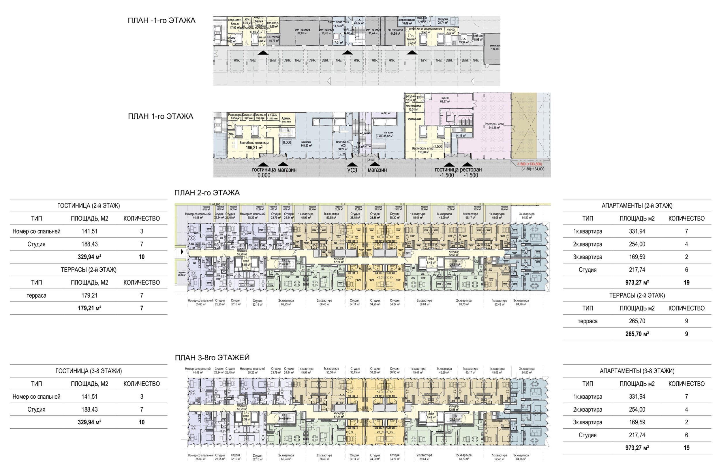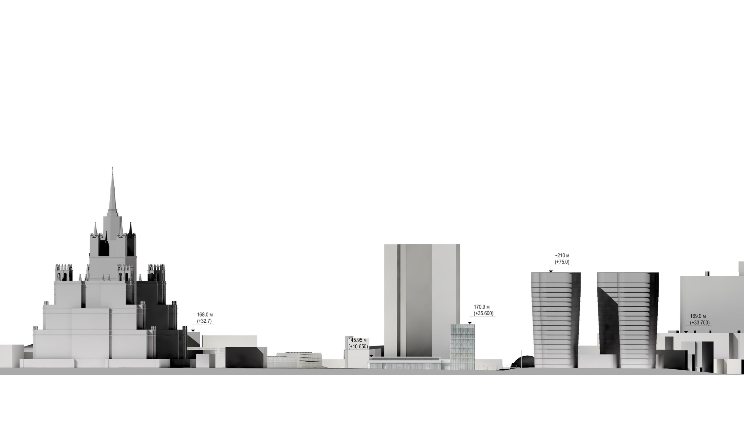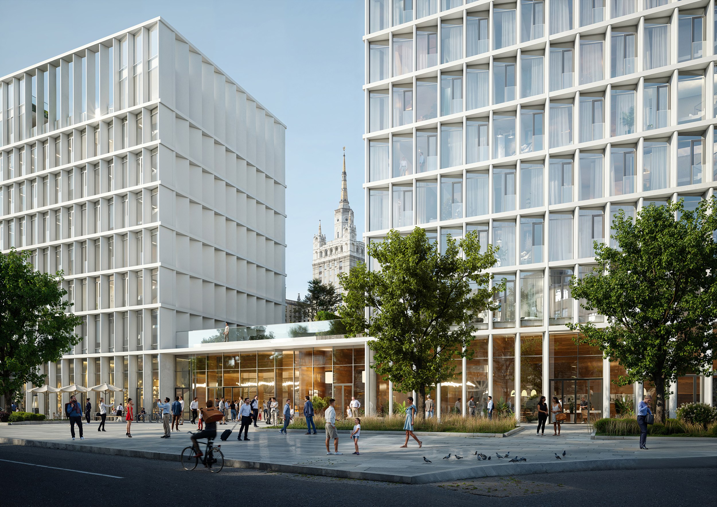 Гостиничный комплекс. Гостиничные апартаменты расположены на семи этажах и максимально ориентированы на примыкающий Пресненский парк с одной стороны и на высотку на Кудринской площади – с другой стороны. Четкая ориентация всего комплекса по сторонам света, заложенная в градостроительном решении, обеспечивает хорошую инсоляцию с восточной, южной и западной сторон. На втором этаже гостиничного комплекса и офисов каждый номер, ориентированный на восток, имеет выход на собственную террасу в уровне зеленого склона. Высота жилых лотов от пола до потолка на типовых этажах – 3.2 м; первый этаж – 6.5 м в гостиничной части и 8.0 м в части апартаментов.