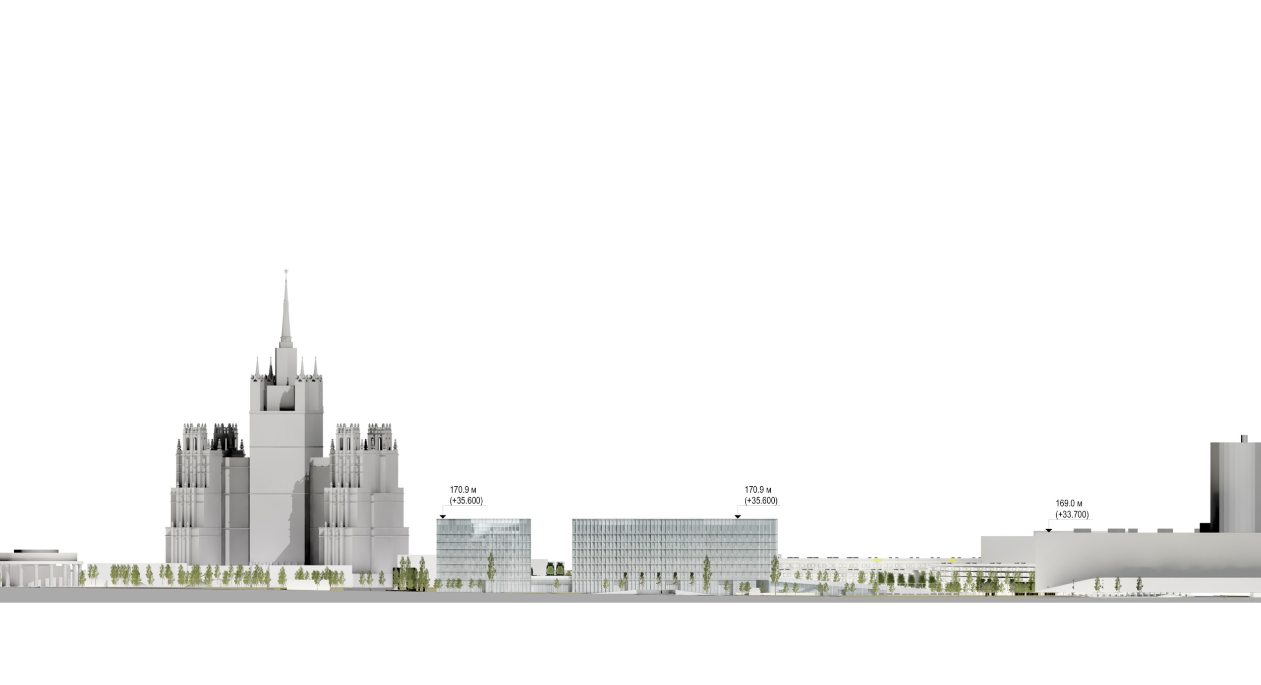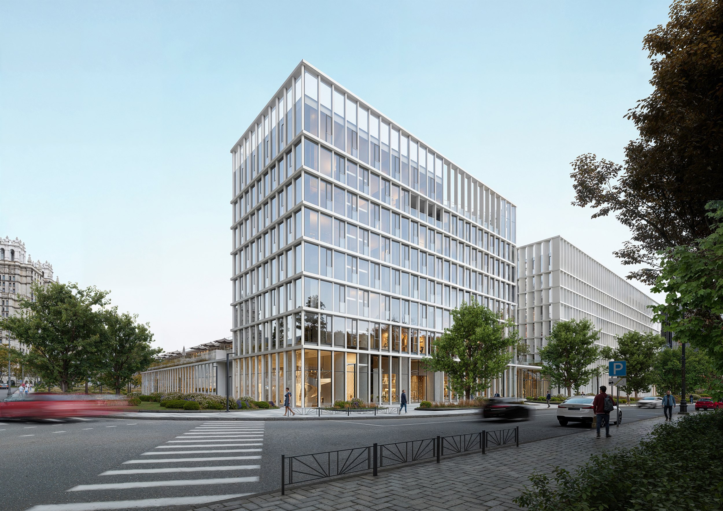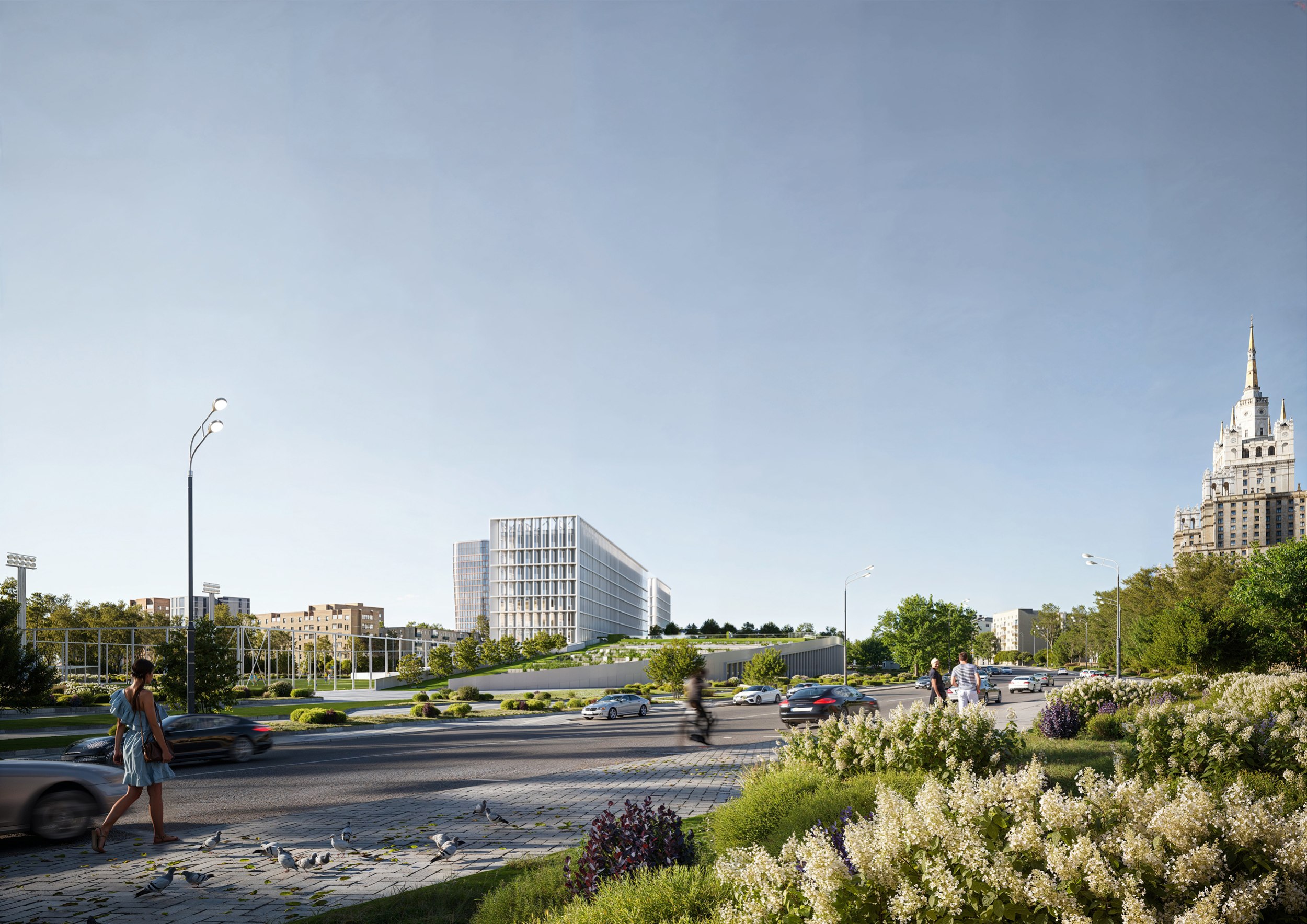 Проектом предполагается сохранение максимального количества зеленых насаждений, в первую очередь – лип. Существующие деревья с четырех сторон обрамляют новое здание. Для создания еще большего ощущения зеленого пространства предполагается дополнительная высадка хвойных пород деревьев по всему периметру комплекса. Весь стилобат представляет собой озелененную кровлю и склон с посаженными на нем группами деревьев и кустарников.