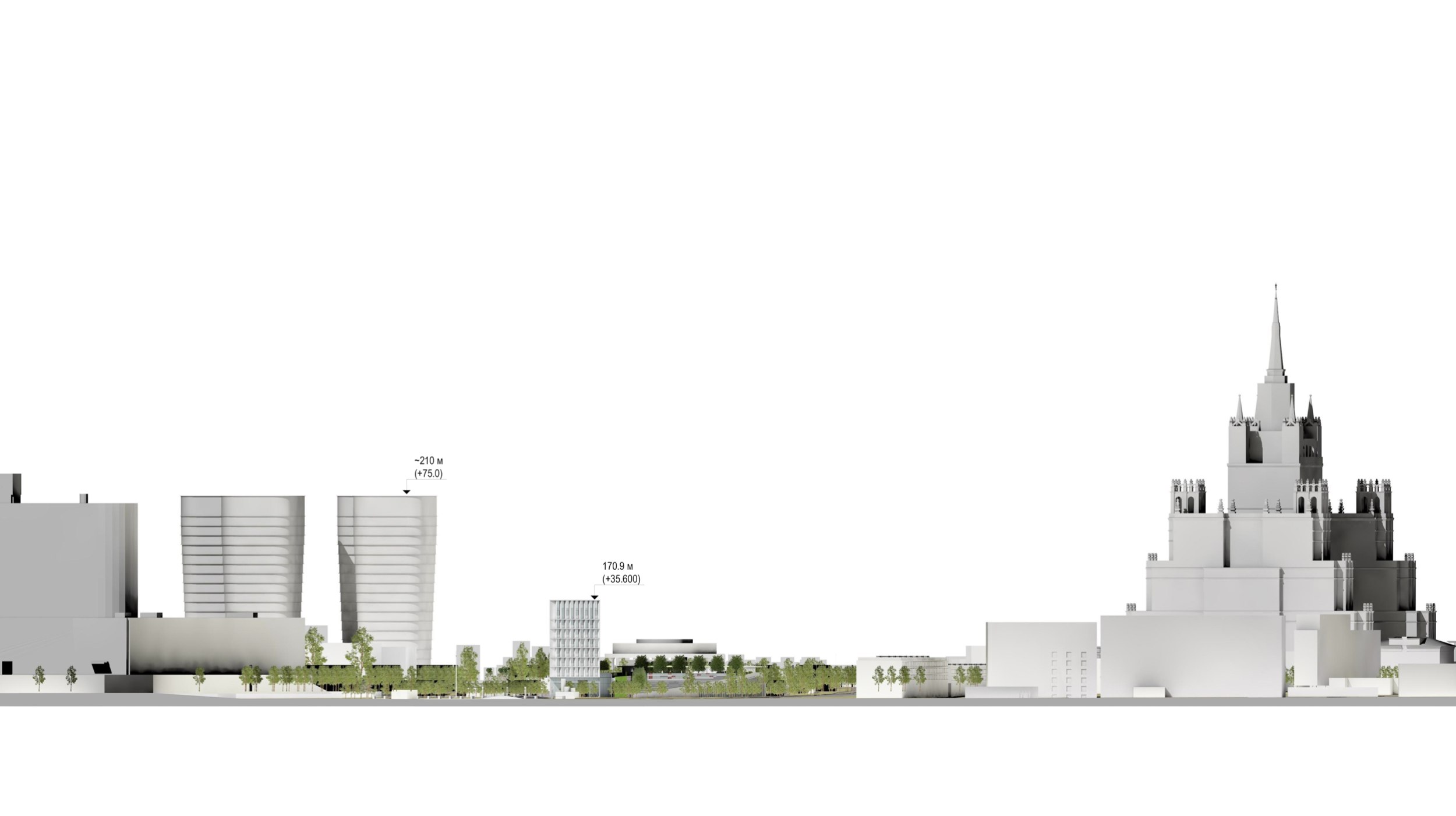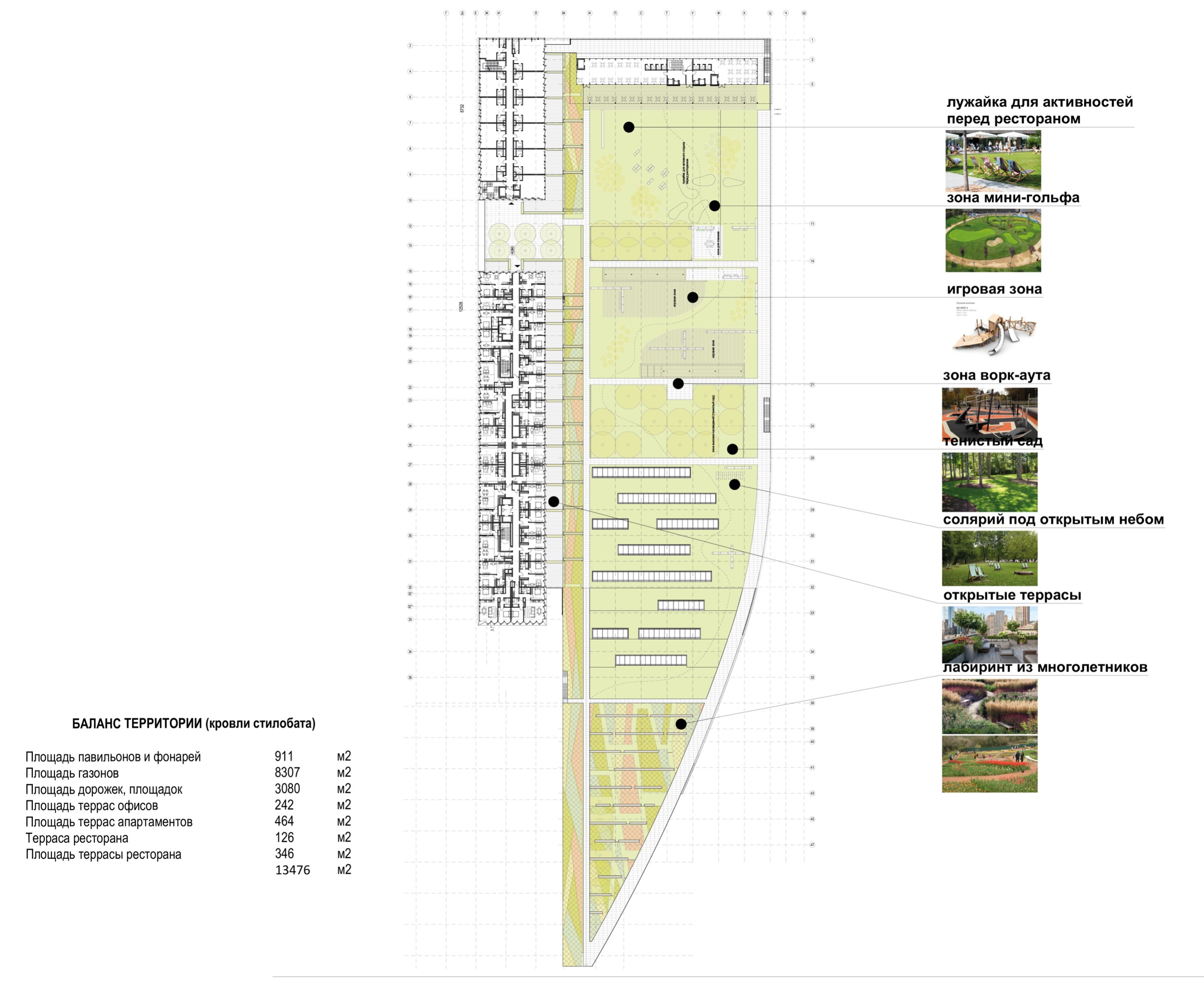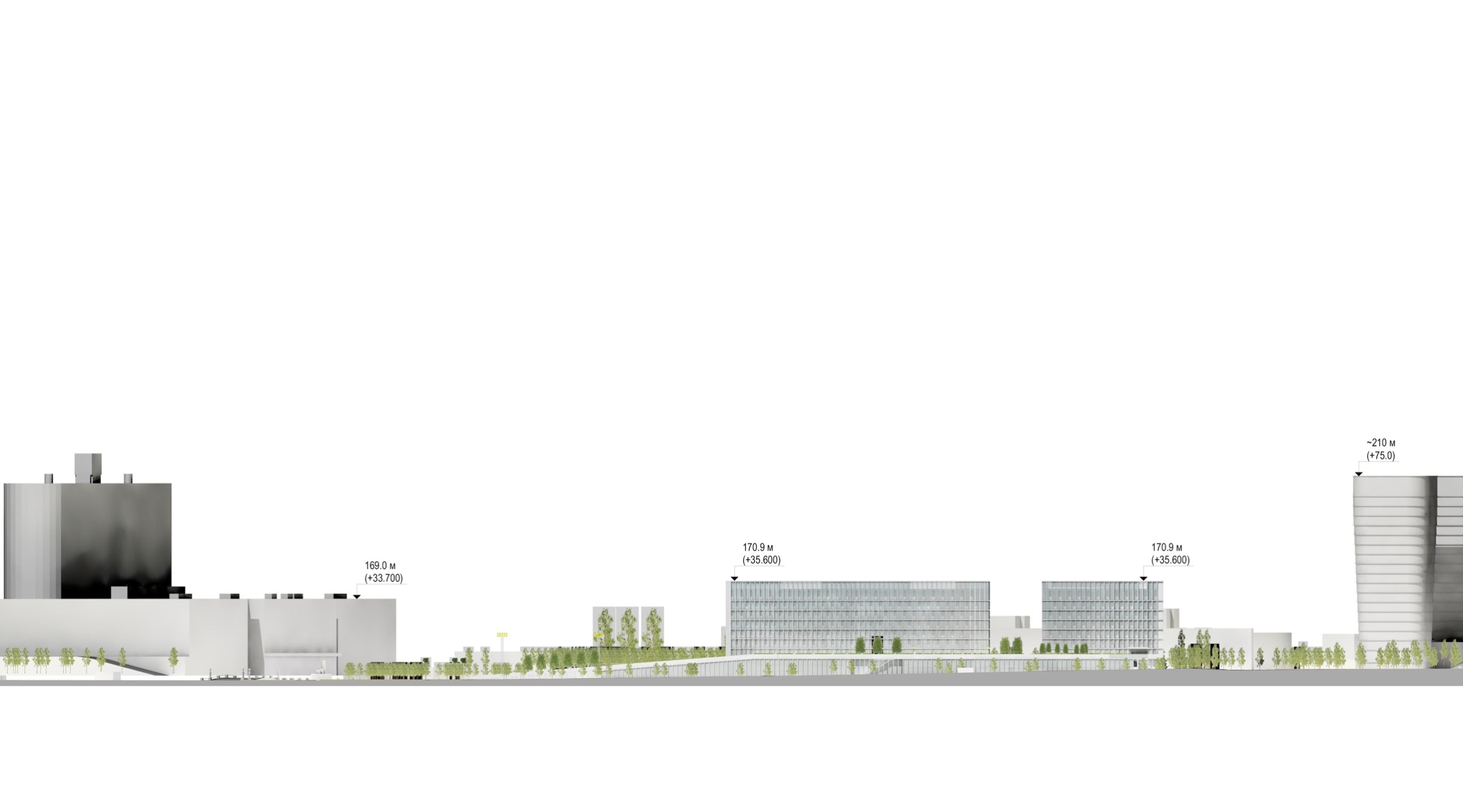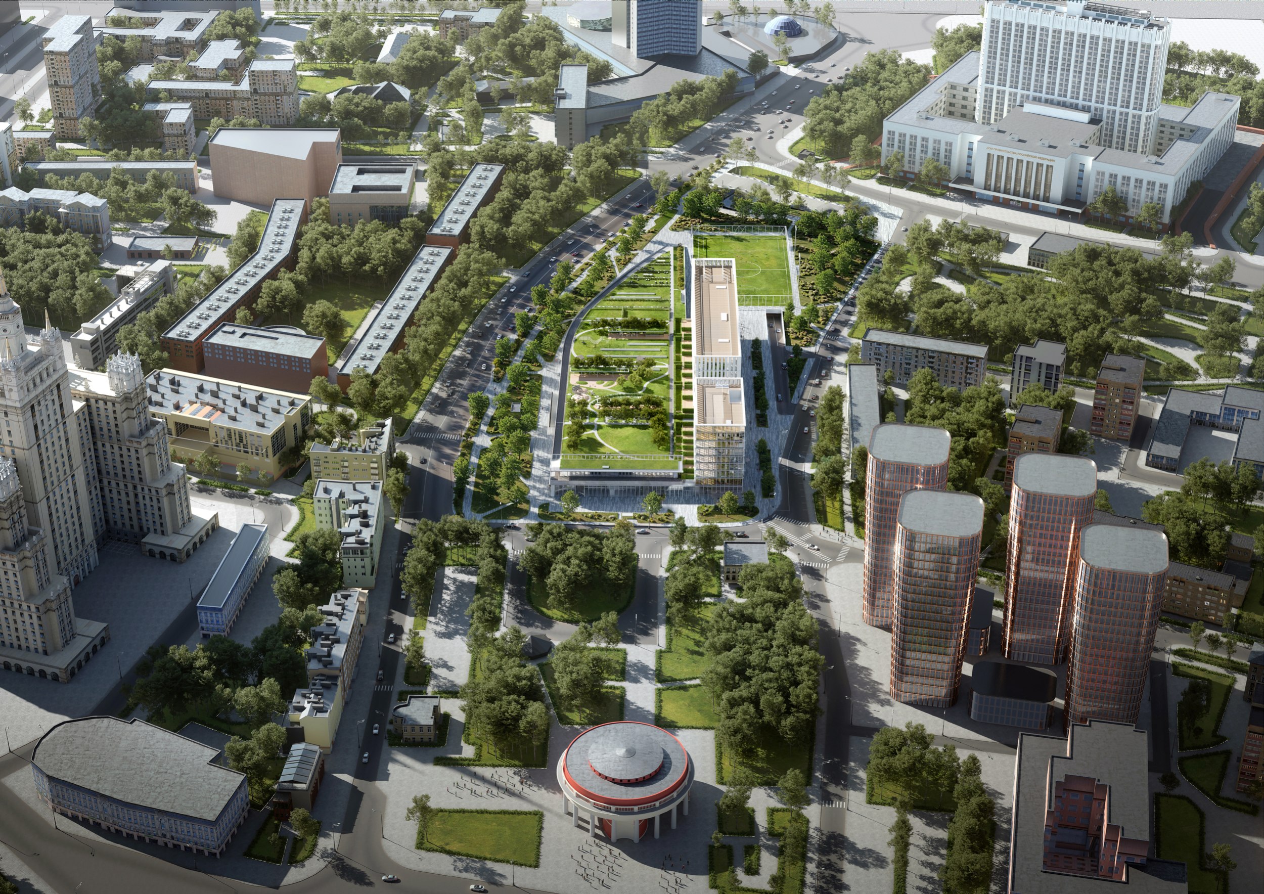 Проектом предполагается сохранение максимального количества зеленых насаждений, в первую очередь – лип. Существующие деревья с четырех сторон обрамляют новое здание. Для создания еще большего ощущения зеленого пространства предполагается дополнительная высадка хвойных пород деревьев по всему периметру комплекса. Весь стилобат представляет собой озелененную кровлю и склон с посаженными на нем группами деревьев и кустарников.