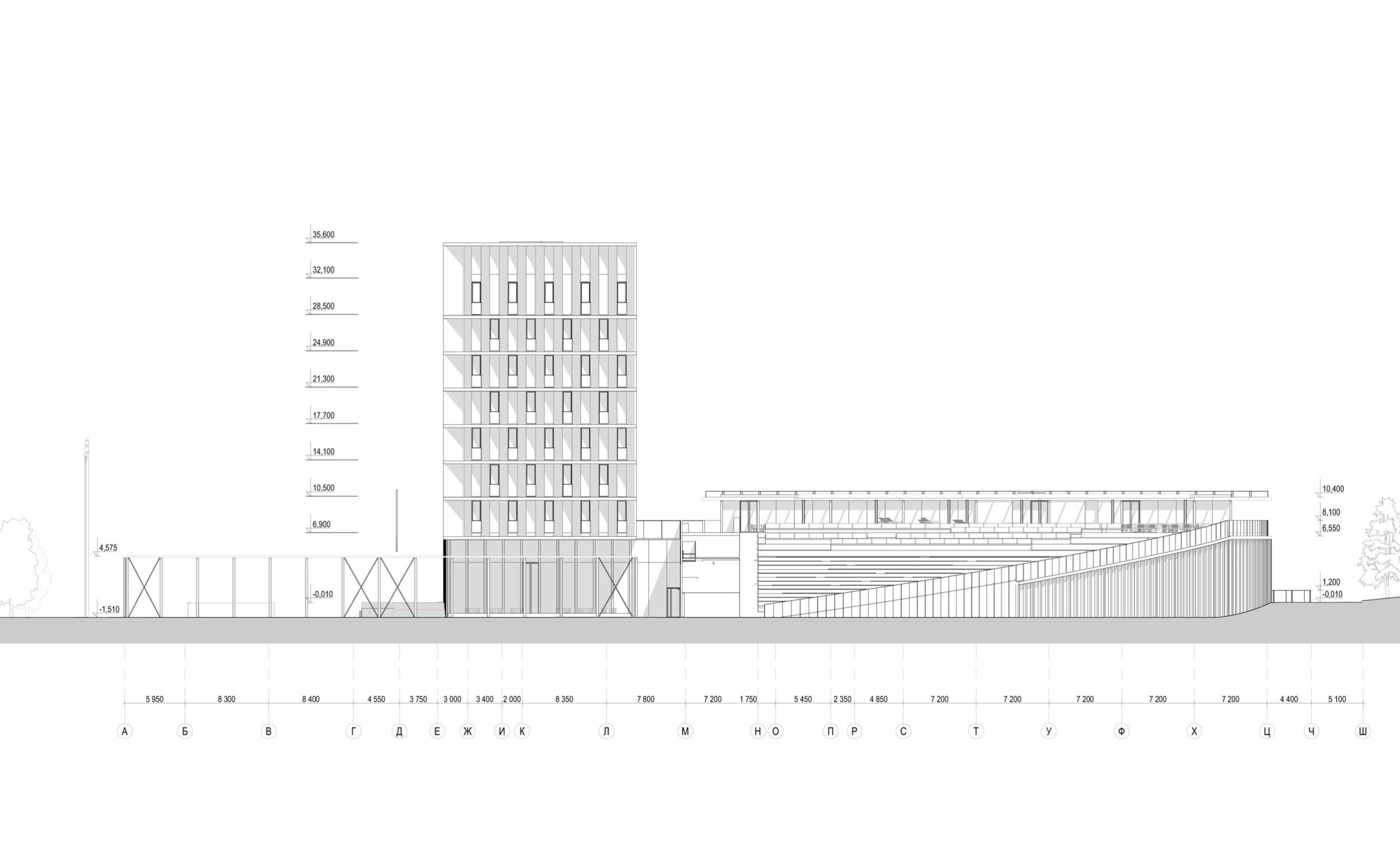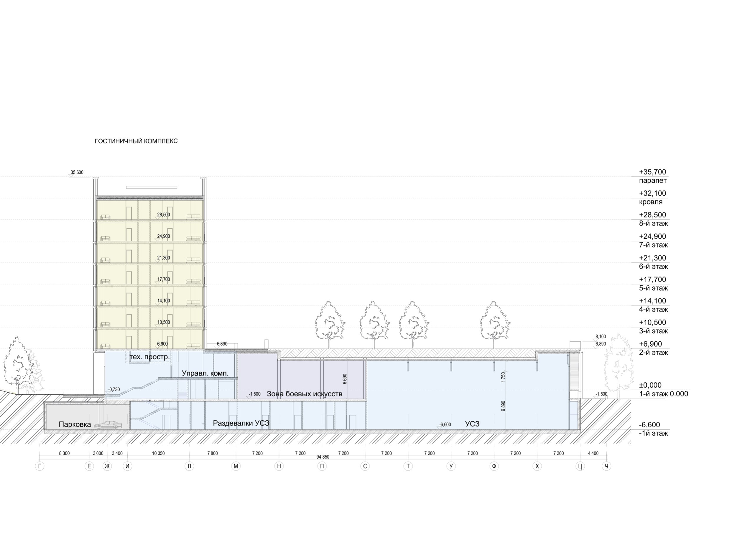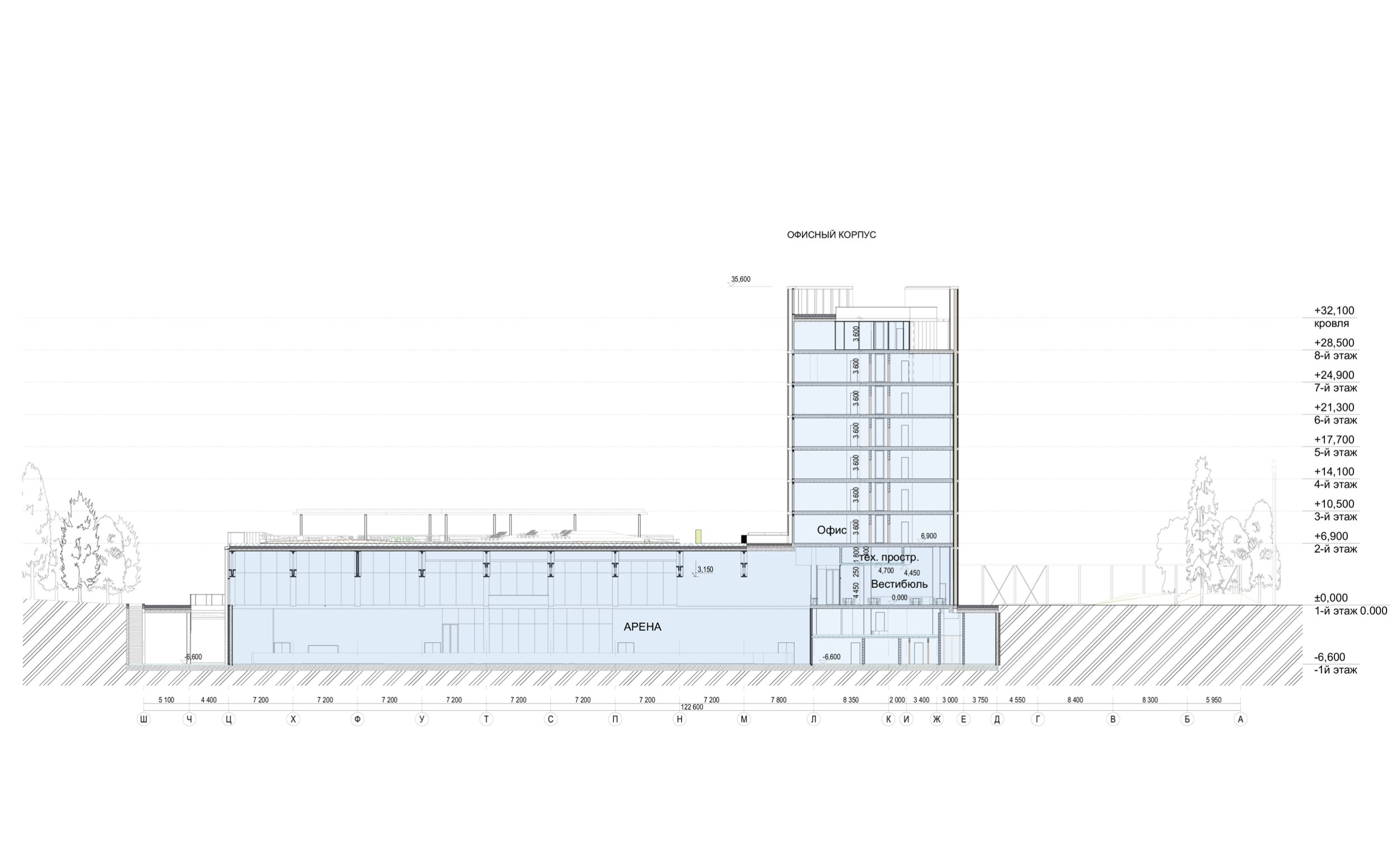 Разрез 1-1. Многофункциональный спортивно-развлекательный комплекс с ледовым комплексом, гостиницей и ФОК на Дружинниковской улице, второй вариант 2025 года