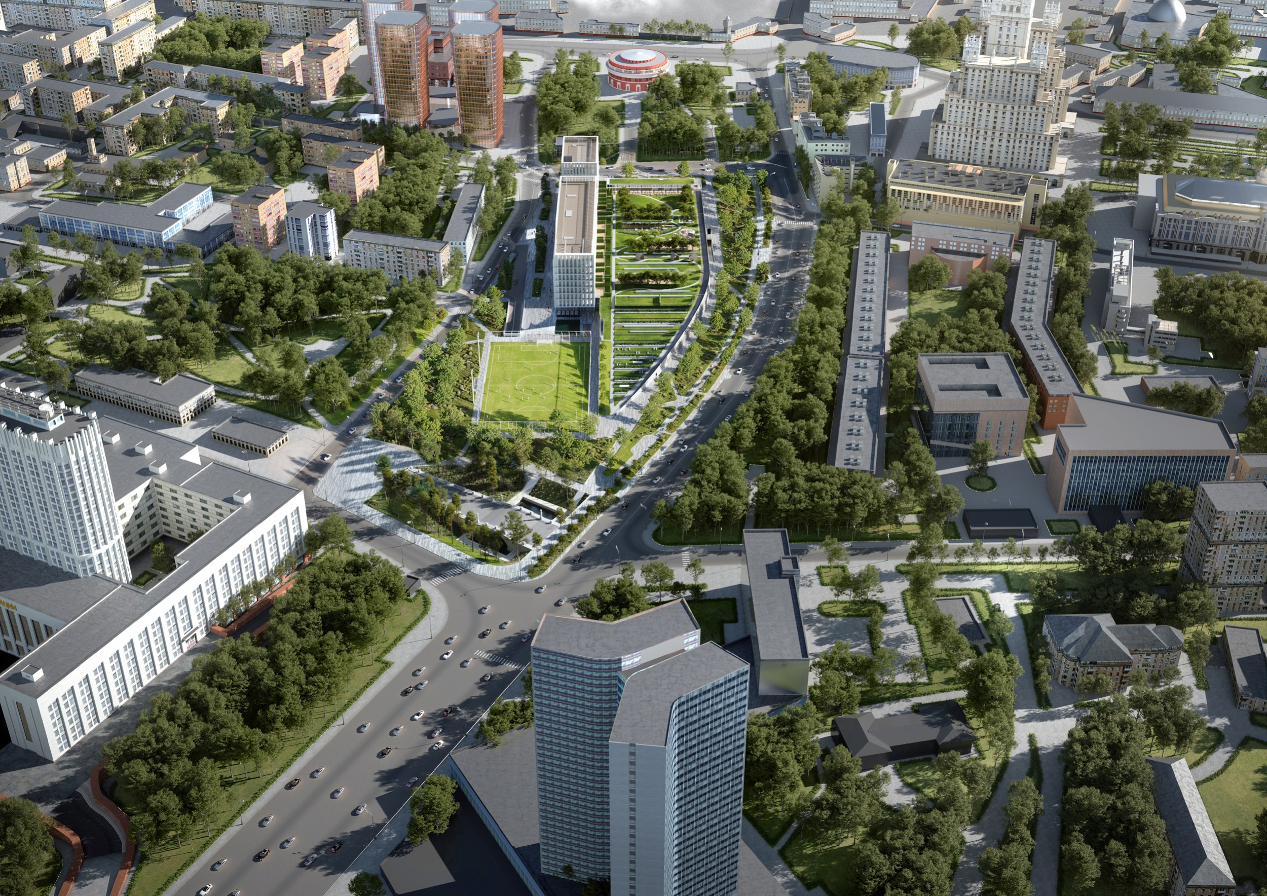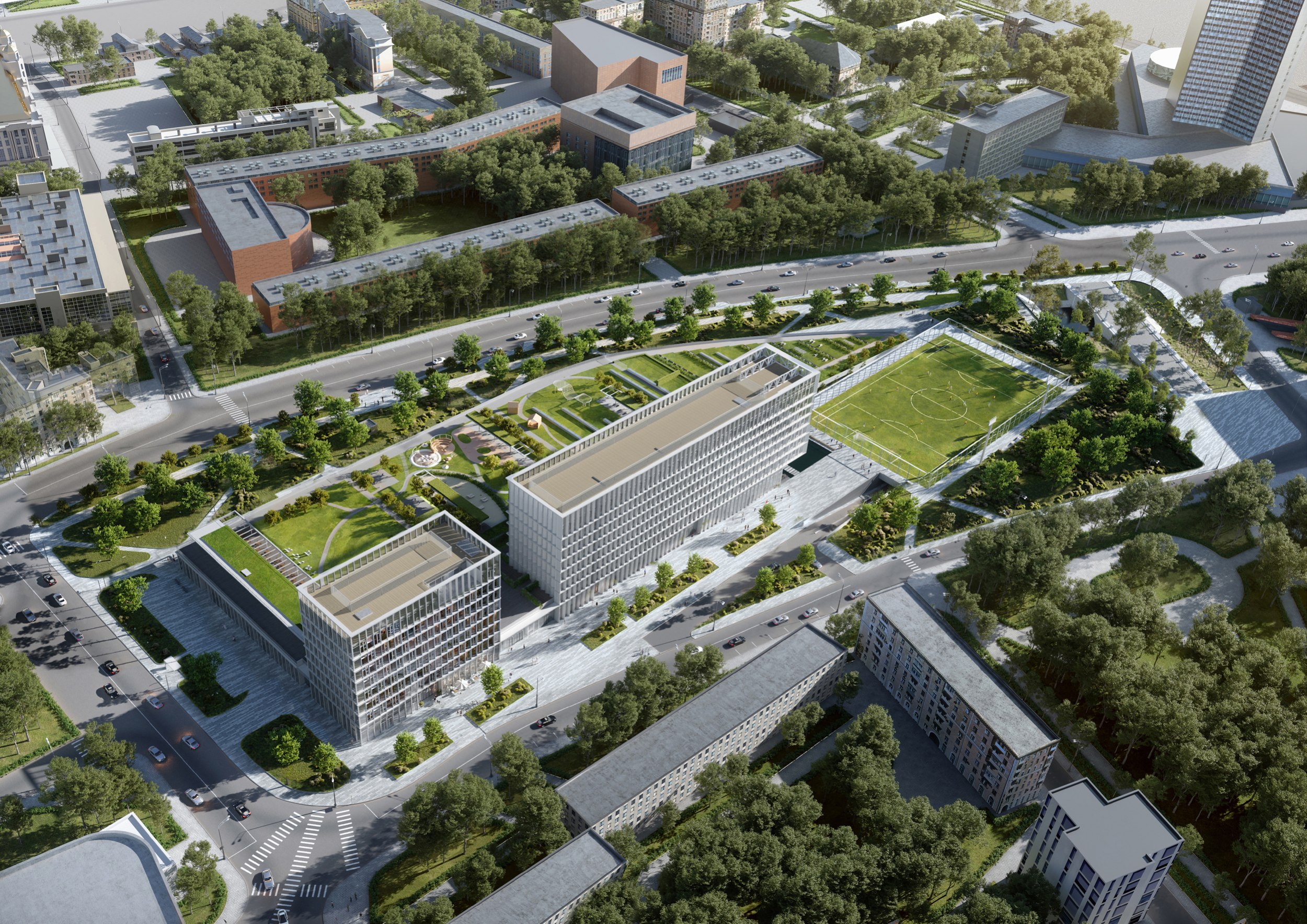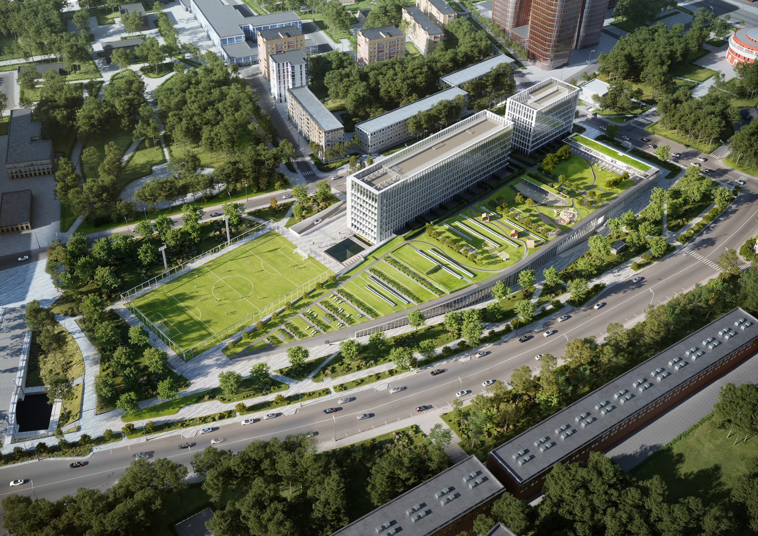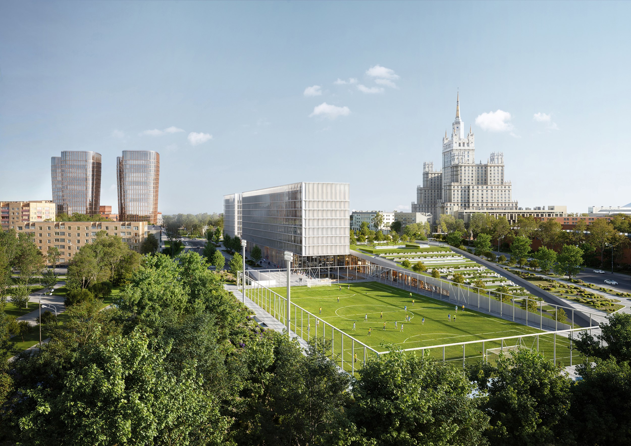 С южной стороны комплекса расположено футбольное поле. Вход с вестибюлем, раздевалки, тренерские и инвентарные находятся под зеленым склоном. Поле круглогодичного использования огорожено и освещено.В интерьерах мест общего пользования стилобата предлагается применить материалы теплых оттенков – деревянные пространственные конструкции, поддерживающие крышу, деревянная отделка пространств лобби в сочетании со светлой мебелью. Используемые материалы создадут уют и теплоту внутреннего пространства и станут контрастными по отношению к фасадным белым материалам.