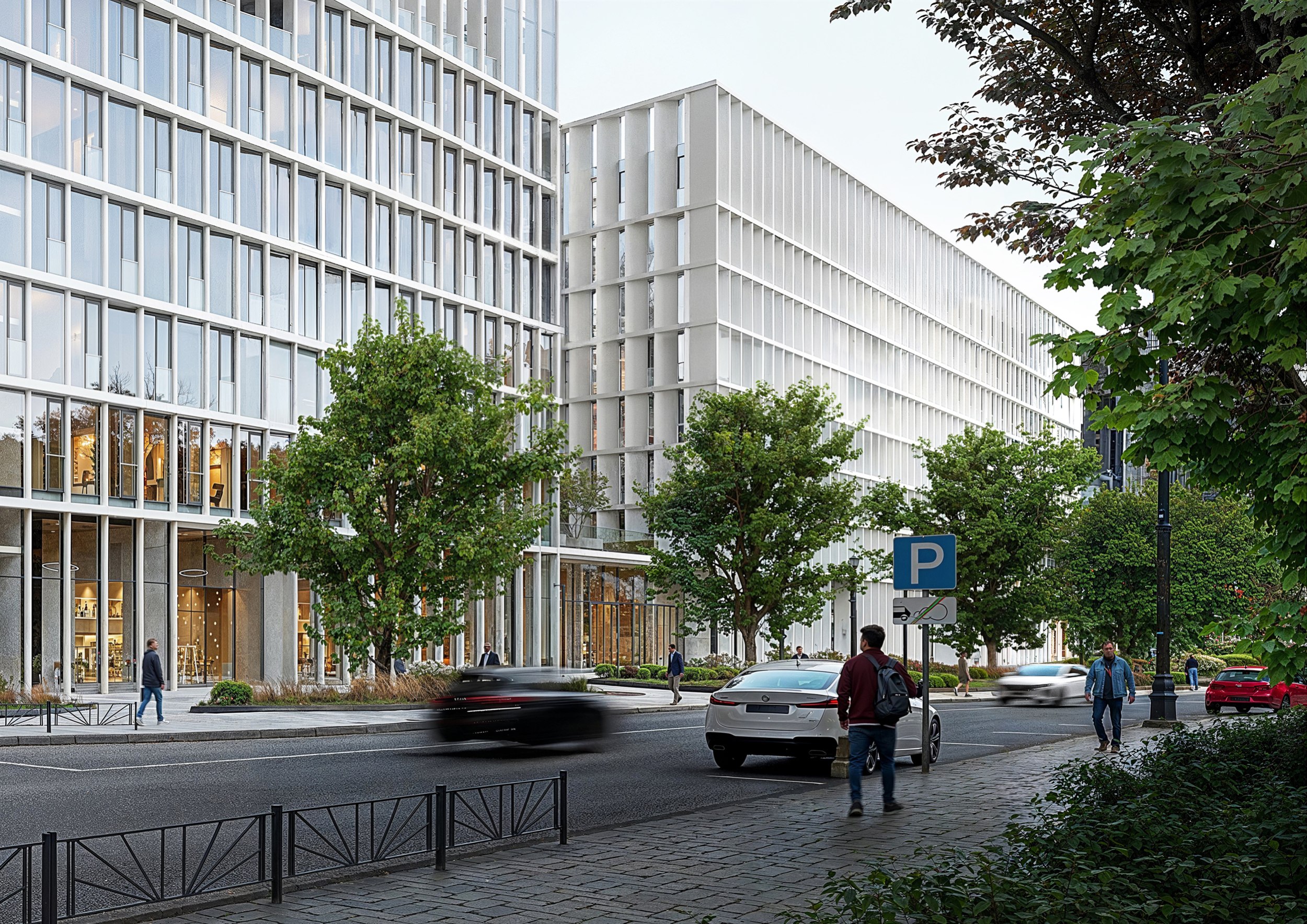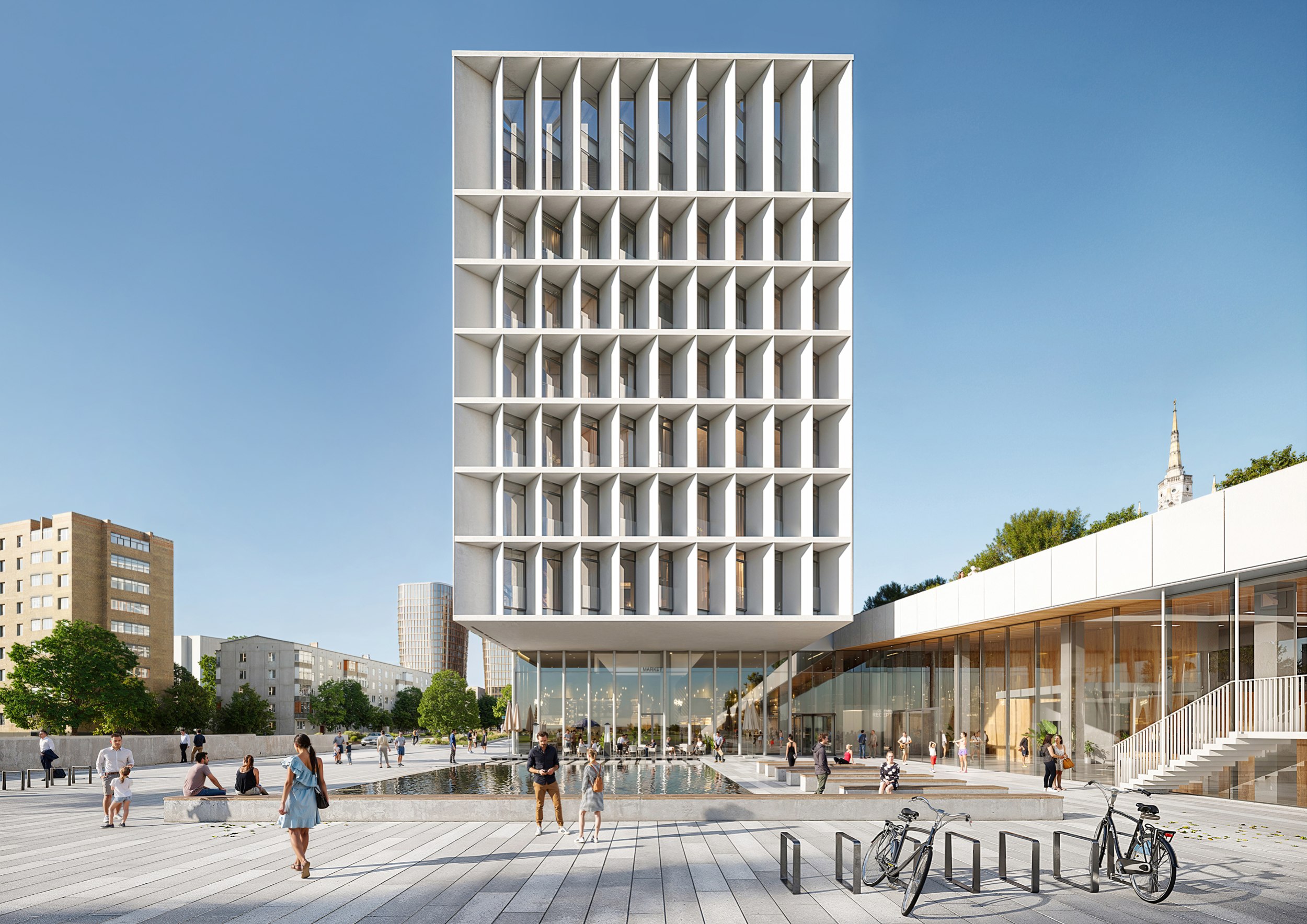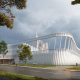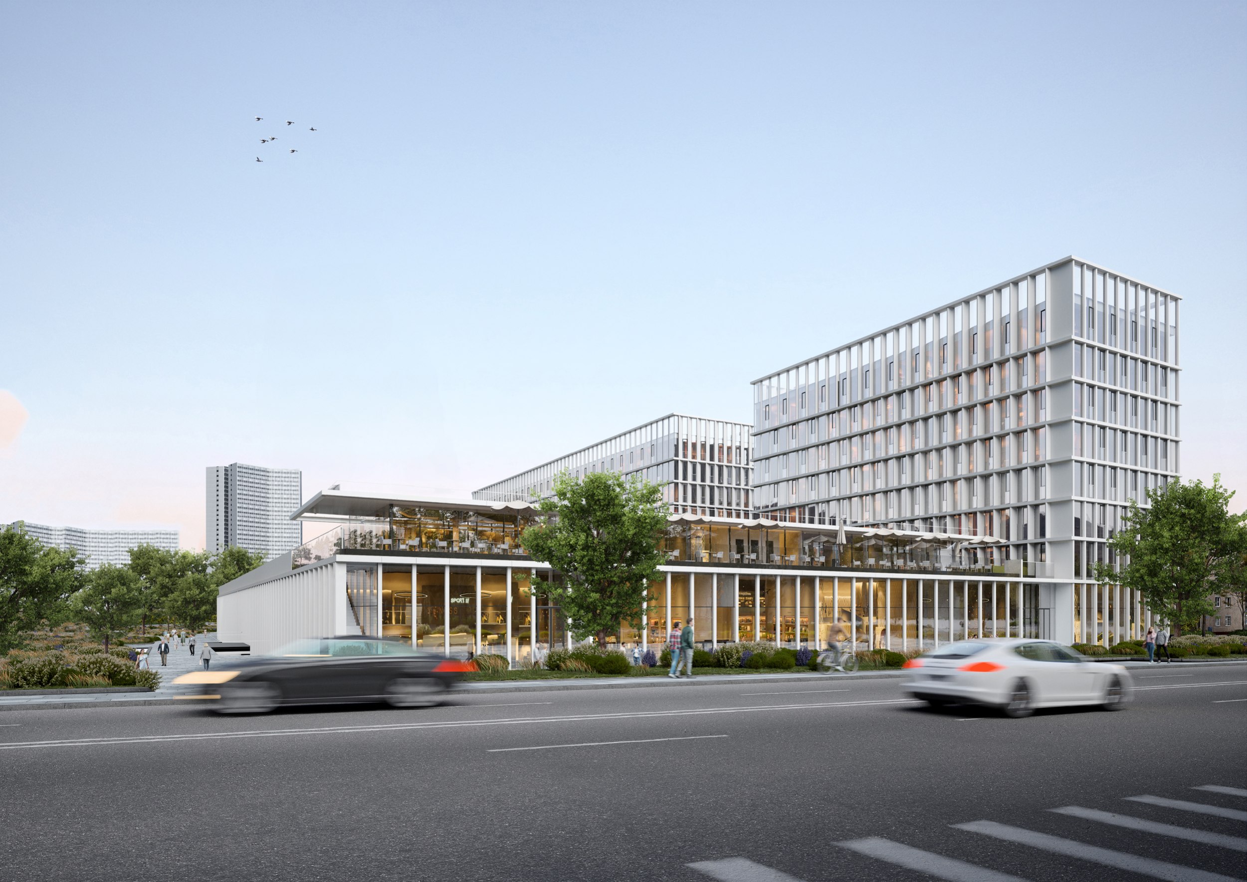 Живописность места повлияла на выбор решения – сдержанный лаконичный монообъем, вырастающий из парка. Легкость сооружению придает сочетание трех материалов: белоснежные алюминиевые ламели скругленной формы, прозрачные и матовые стекла вместо стен. Абсолютно белое полупрозрачное сооружение с изменчивой игрой света и тени. Ламельная ребристость фасада хорошо вписывается в живописную среду городского сквера, появляясь в разрывах зеленых аллей и куп деревьев. Подчиненная месту, выверенная архитектурная форма создает загадочный образ общественного здания с нависающим объемом гостиничного корпуса, словно лайнер среди зеленых волн из крон деревьев.Офисный и гостиничный корпуса располагаются на стилобате, в котором расположены ледовые арены, ФОК и вся сопутствующая инфраструктура. Кровля стилобата эксплуатируемая, озелененная, на ней находятся площадки активного и спокойного отдыха. А добраться до нее можно либо по длинному пологому склону, ведущему от новой площади перед комплексом, либо выйти на уровне второго этажа из офисного и гостиничного корпусов, либо по открытым лестницам.
