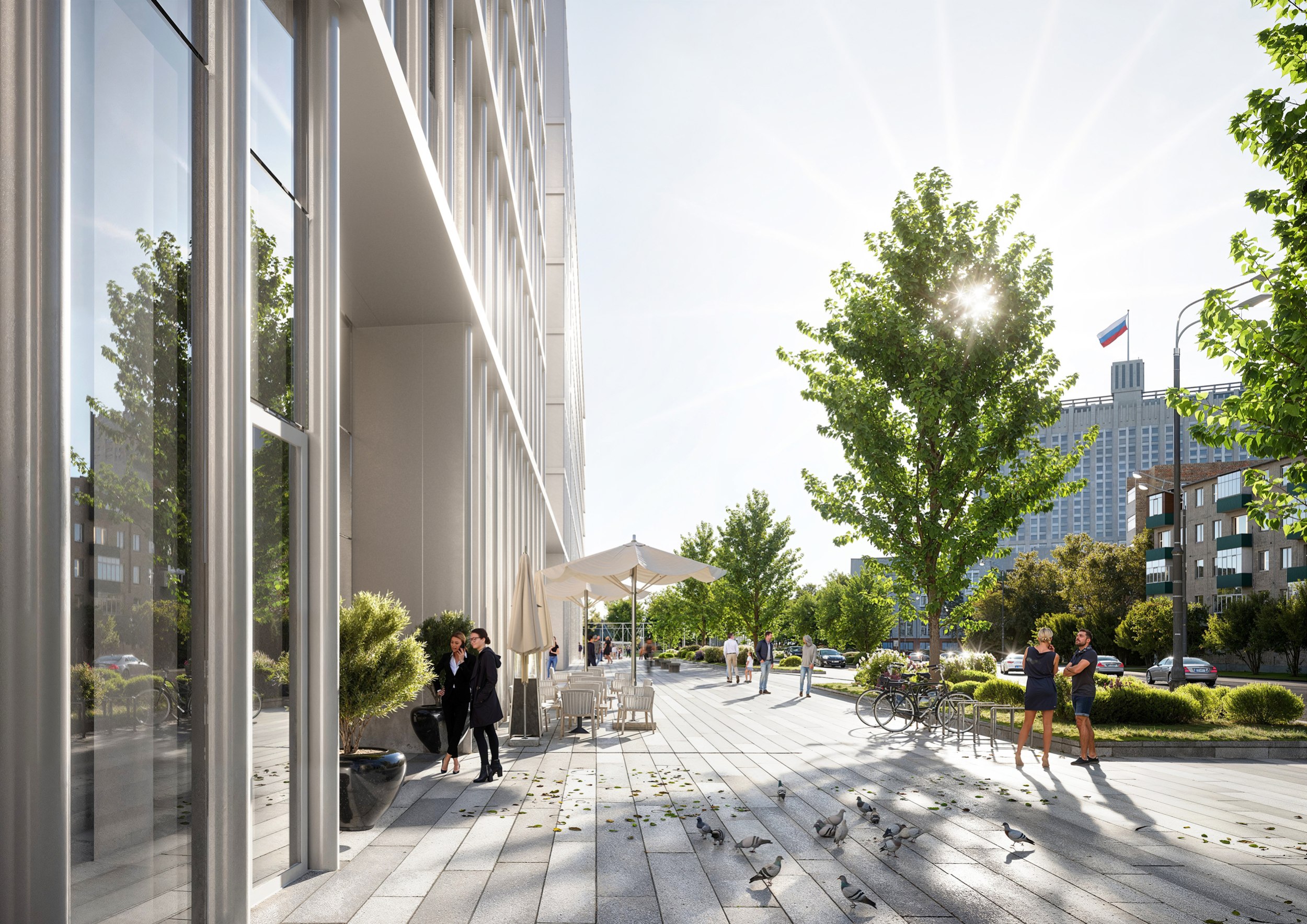На 7 и 8 этажах офисного блока на западной стороне располагаются террасы, с которых открывается вид на город в сторону Сити.