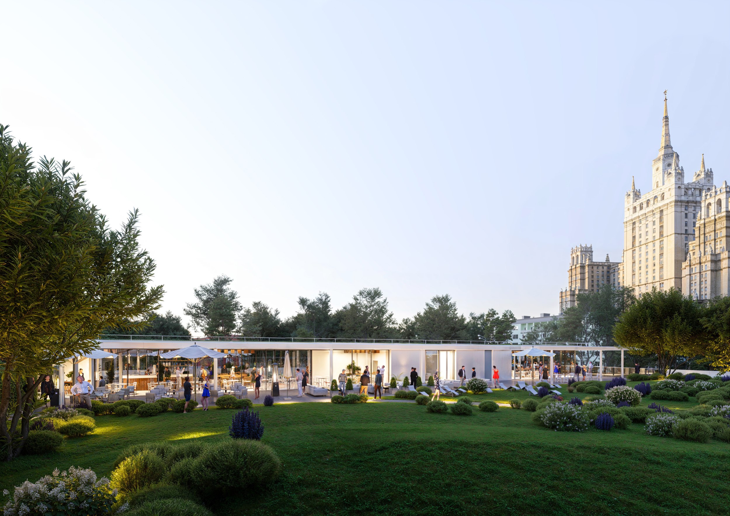 С уровня кровли раскрываются виды на город: в сторону Москвы-реки с ее доминантами, на Сити, на высотку Кудринской площади.