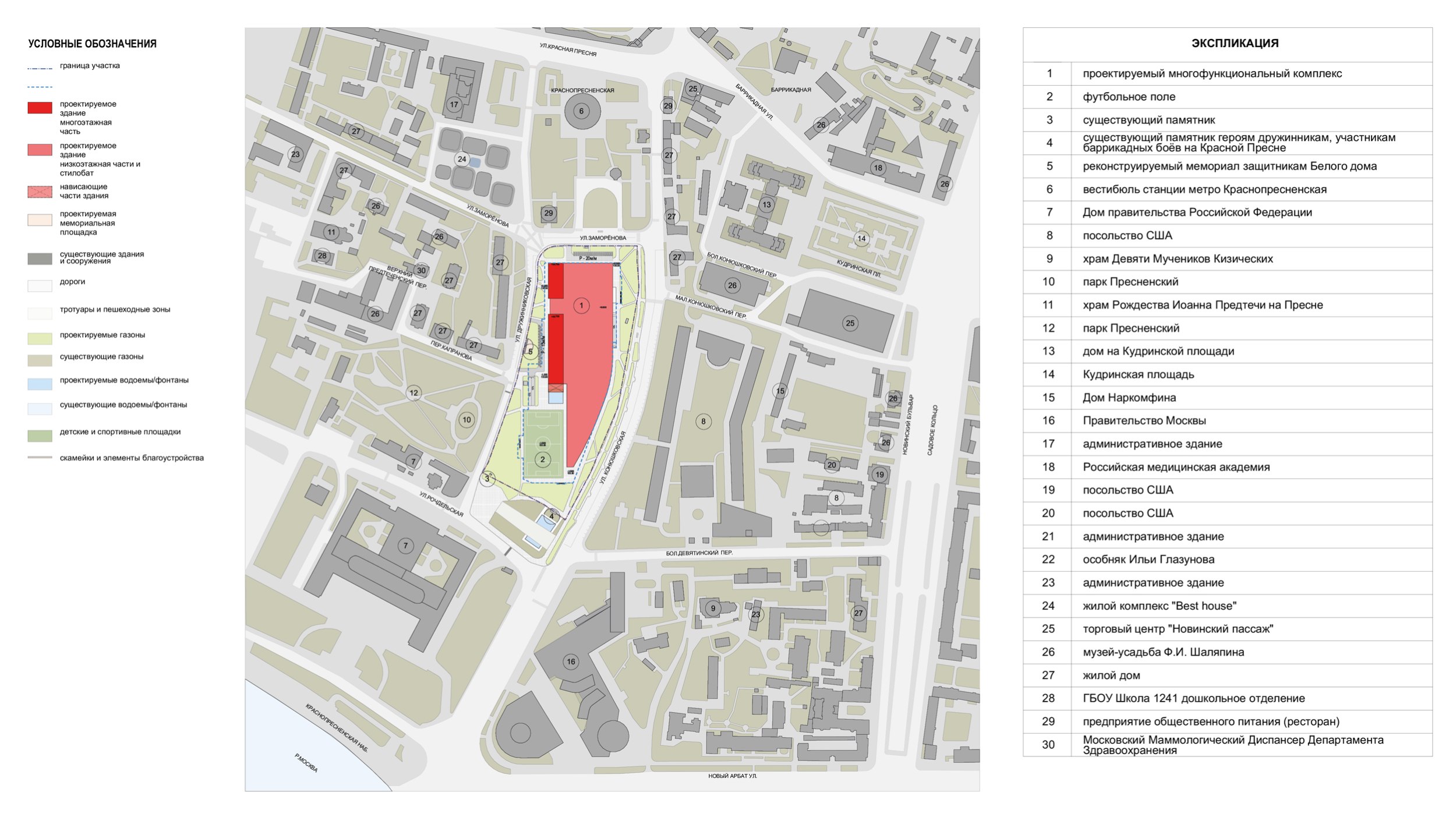 Отведенный участок располагается в городском сквере, спускающемся от круглого павильона станции метро «Краснопресненская» к Москве-реке. Участок ограничен транспортными улицами: с запада – улицей Дружинниковской, с севера – улицей Заморенова, с востока – Конюшковской улицей, с юга – Рочдельской улицей. Рельеф спокойный, с небольшим понижением в сторону реки. Продольный перепад вдоль всего участка составляет 2.5 м. Наибольшая интенсивность транспортного движения и плотность потока, вызывающие автомобильные пробки, наблюдаются на улице Заморенова.