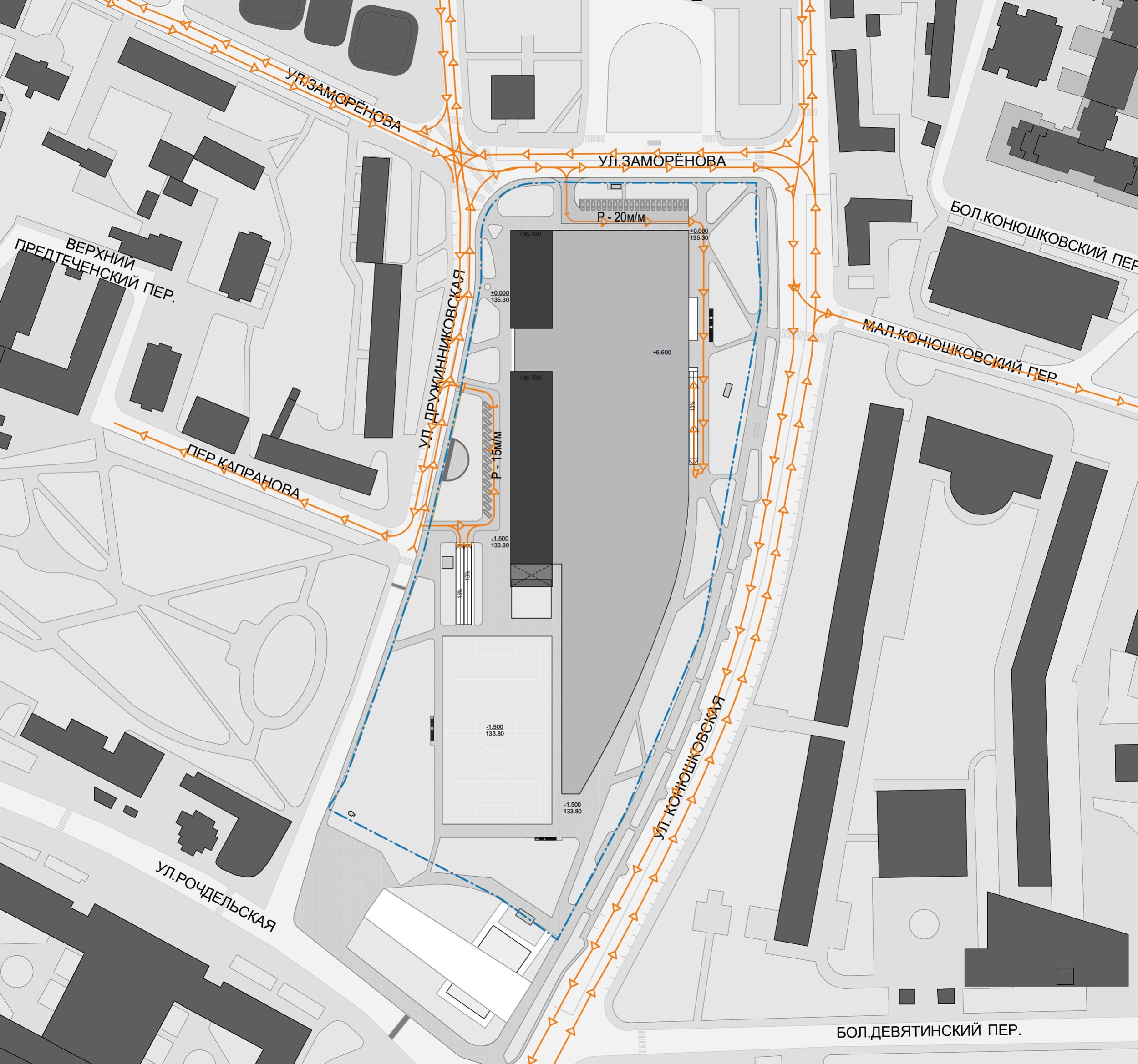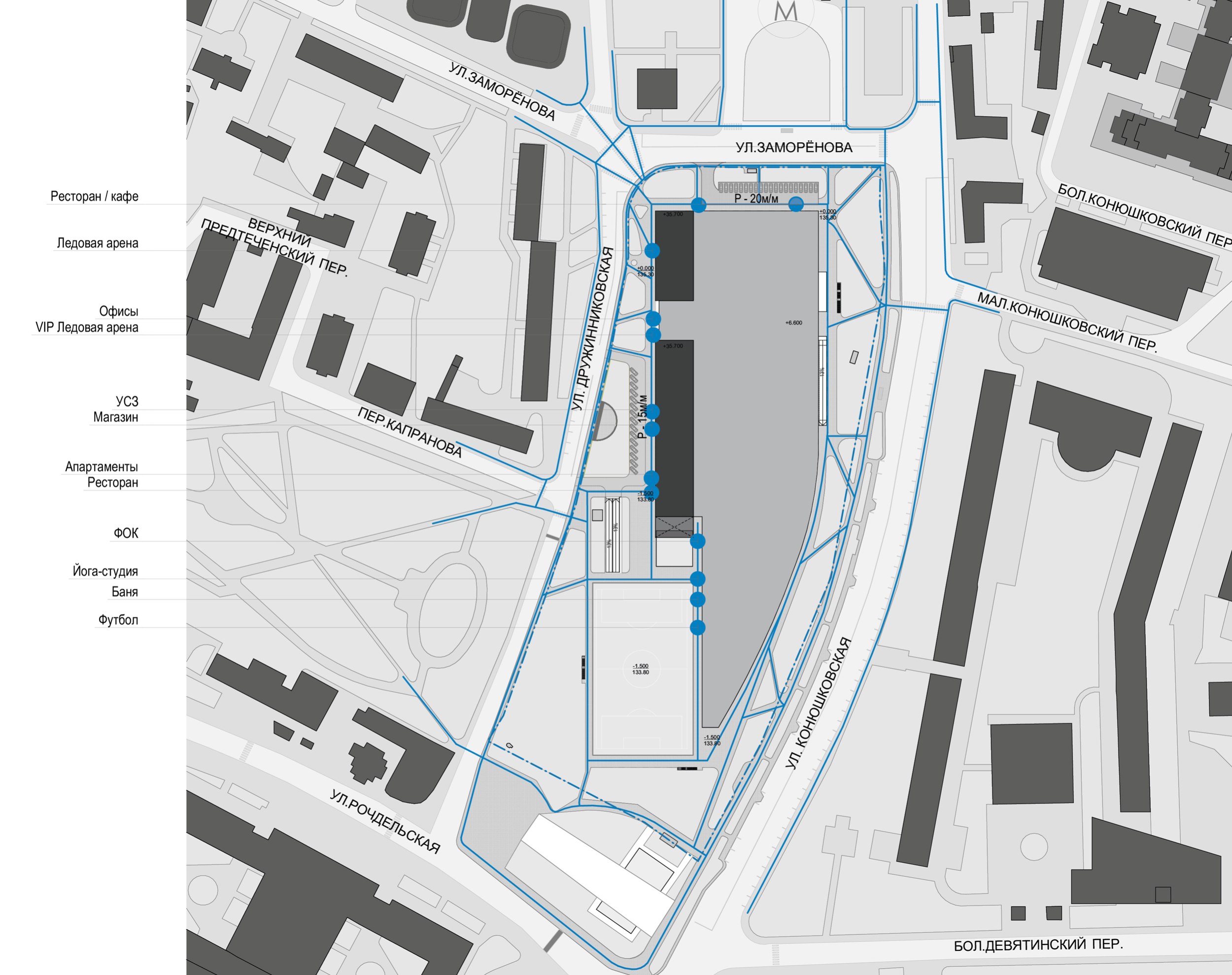 Приоритетной улицей для данного участка является Дружинниковская, она наиболее активно используется горожанами для прохода от метро в сторону набережной. Проектом поддерживается данное свойство территории, и все основные заезды и входы в комплекс осуществляются с Дружинниковской улицы. Для удобства с этой же стороны сделан круговой проезд с односторонним движением, с которого можно заехать в подземную часть, высадить пассажиров у гостиничного комплекса и высадить VIP-персон у отдельного входа в ледовый комплекс, далее можно вернуться на Дружинниковскую улицу либо заехать в подземный паркинг. Для доступа служебного транспорта к ледовому комплексу предполагается технический заезд с улицы Заморенова. Проезд пожарной техники осуществляется вдоль фасадов всего комплекса. С северной стороны комплекса предусмотрена гостевая парковка для посетителей ресторана, и такая же парковка присутствует с западной стороны у входов в офисы, в VIP-зону ледовой арены, в магазин, ресторан и входы в вестибюли гостиничной части.