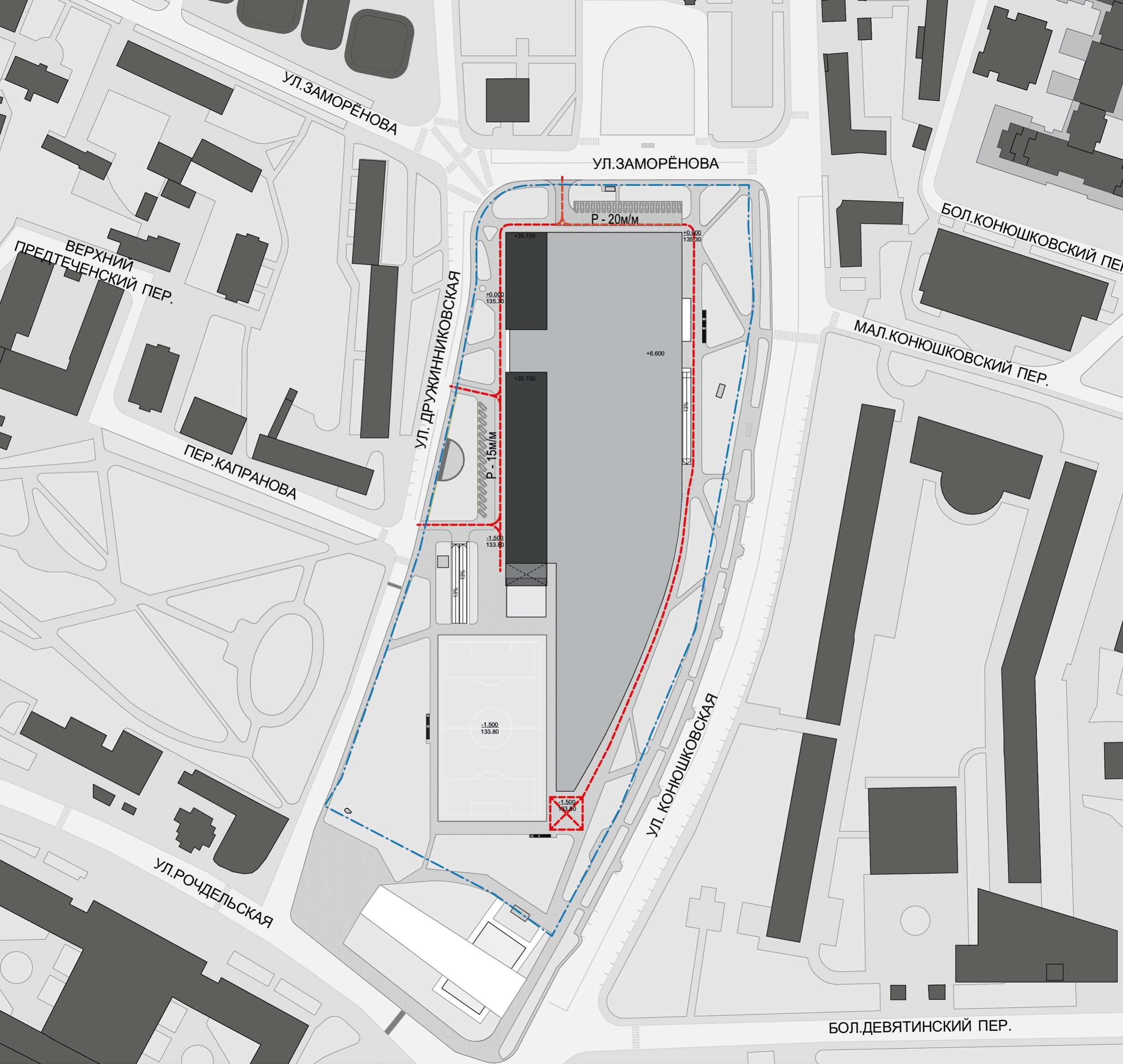 Развертка по улице Заморенова. Многофункциональный спортивно-развлекательный комплекс с ледовым комплексом, гостиницей и ФОК на Дружинниковской улице, второй вариант 2025 года