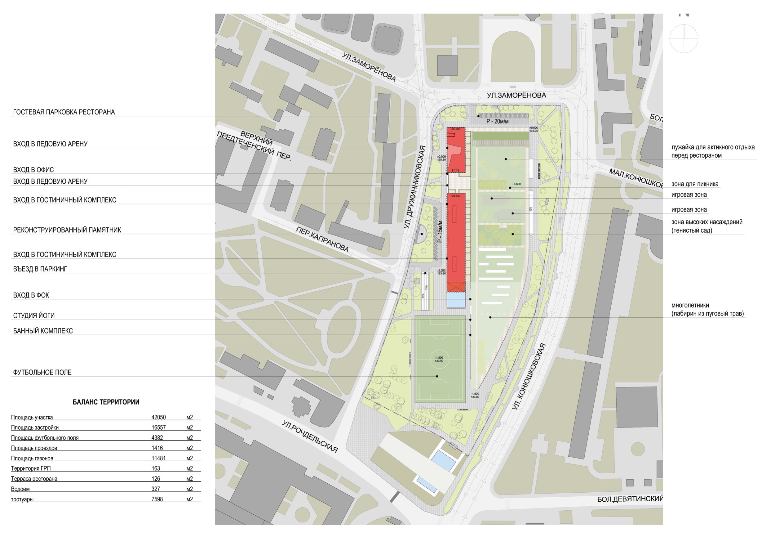 Схема генерального плана. Баланс территории. Многофункциональный спортивно-развлекательный комплекс с ледовым комплексом, гостиницей и ФОК на Дружинниковской улице, второй вариант 2025 года