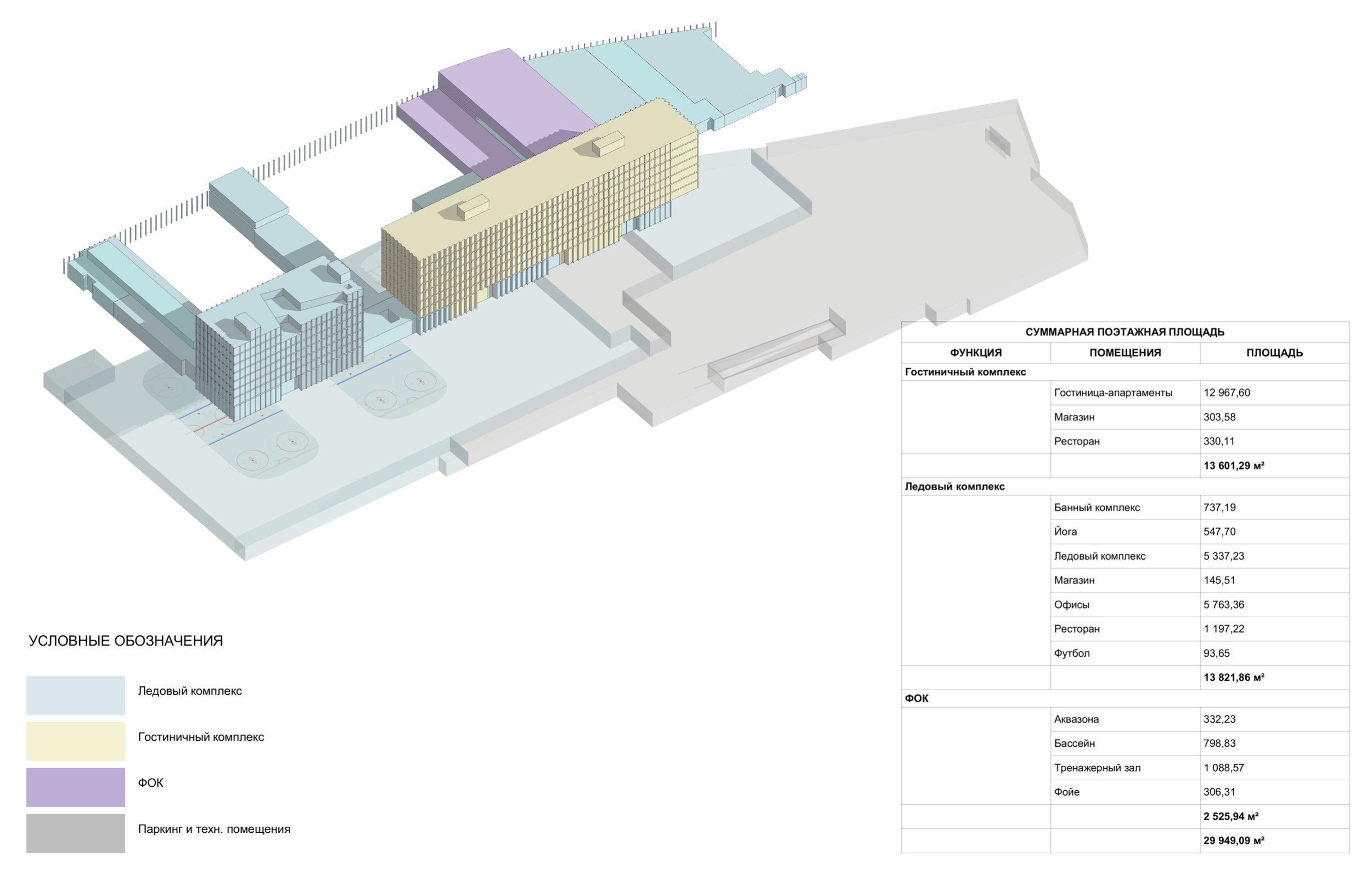 Суммарная поэтажная площадь. Многофункциональный спортивно-развлекательный комплекс с ледовым комплексом, гостиницей и ФОК на Дружинниковской улице, второй вариант 2025 года