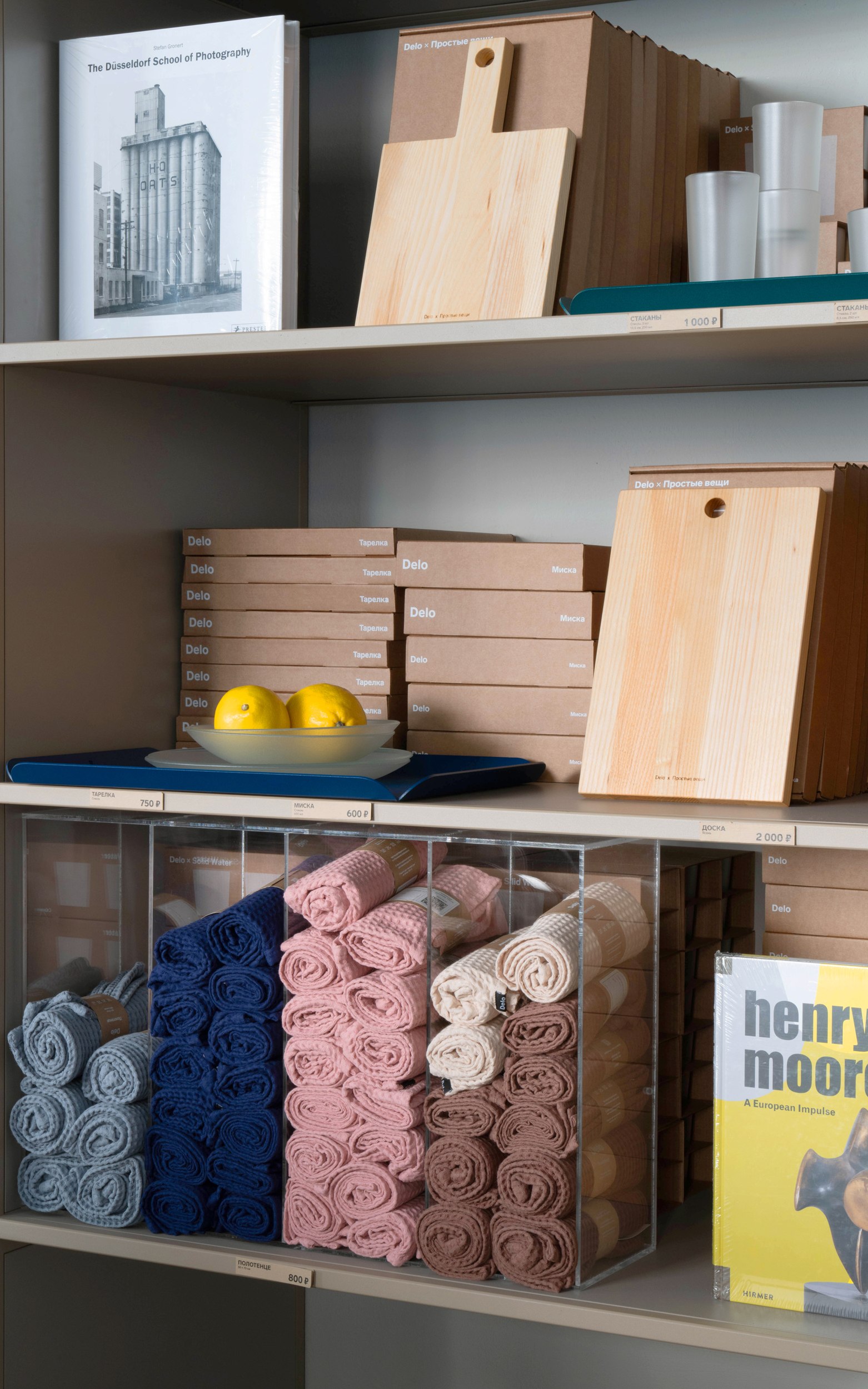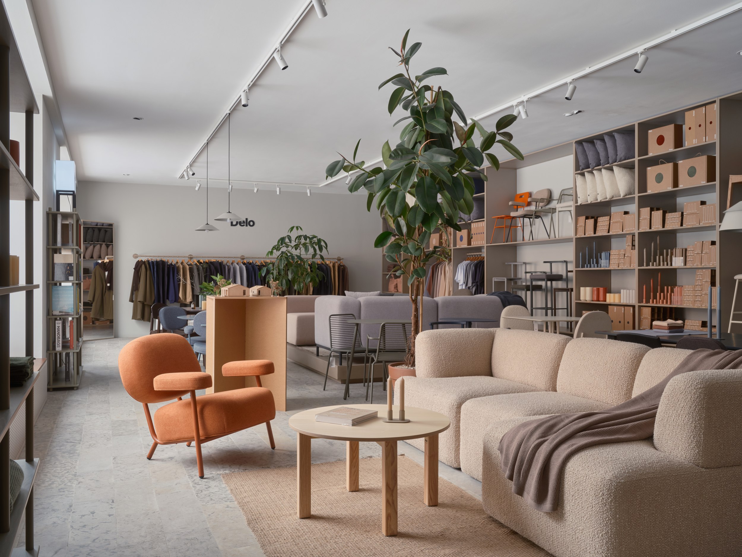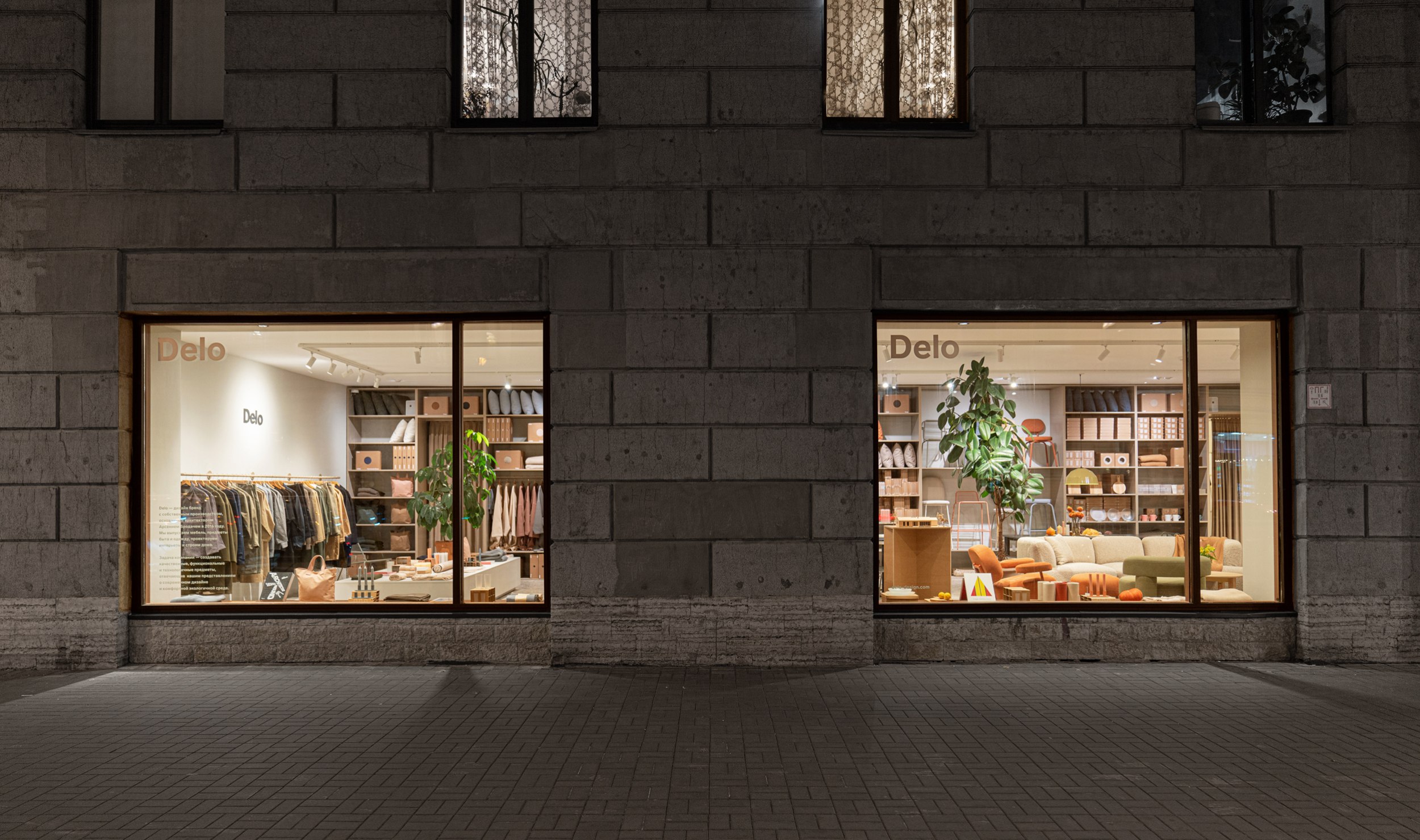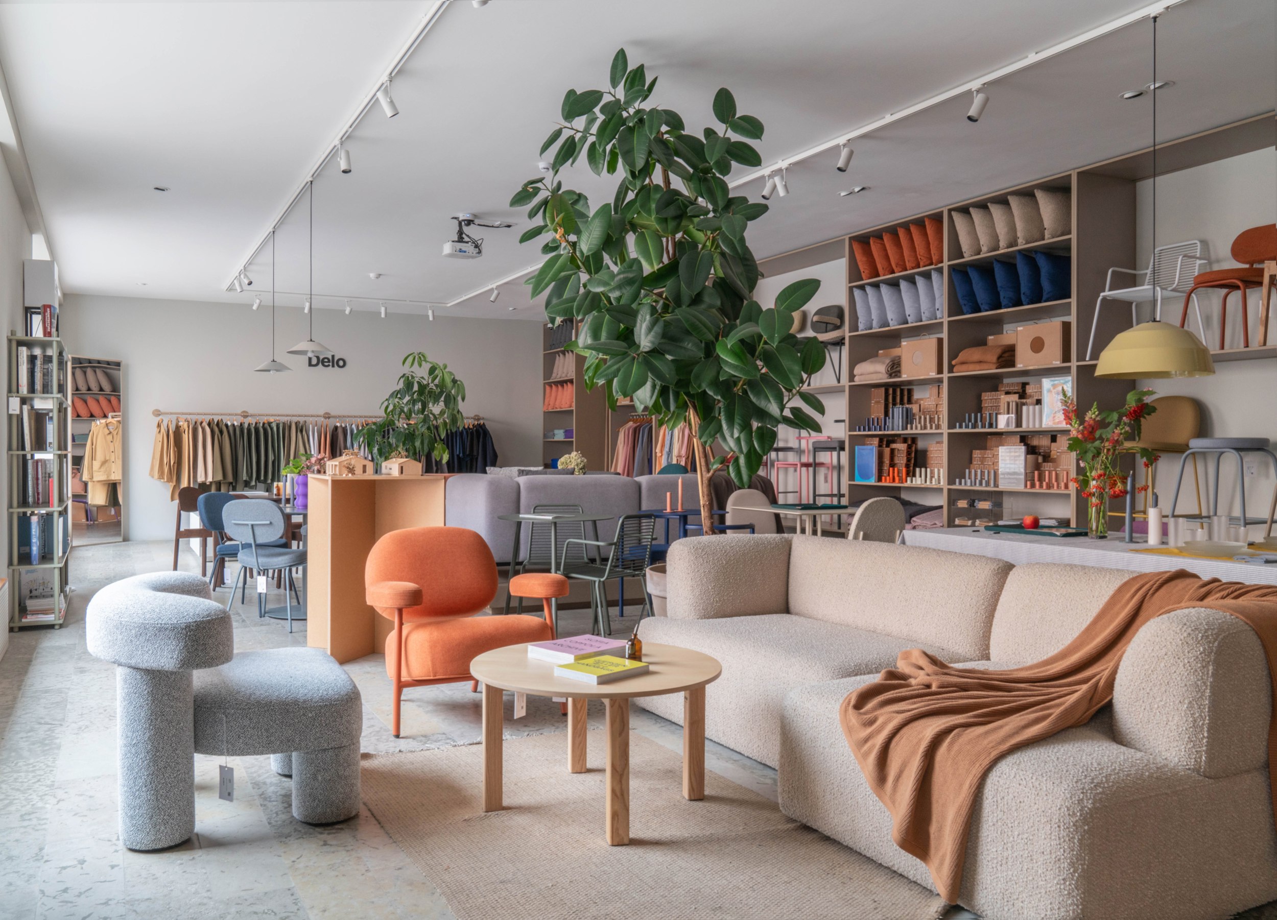 Проект объединяет шоурум и офис команды и демонстрирует все направления работы бренда. Здесь представлены мебель, предметы быта и одежда, а также макеты каркасных домов Delo House и книги об архитектуре и дизайне. Интерьер полностью состоит из мебели Delo – серийных моделей и специально спроектированных объектов.