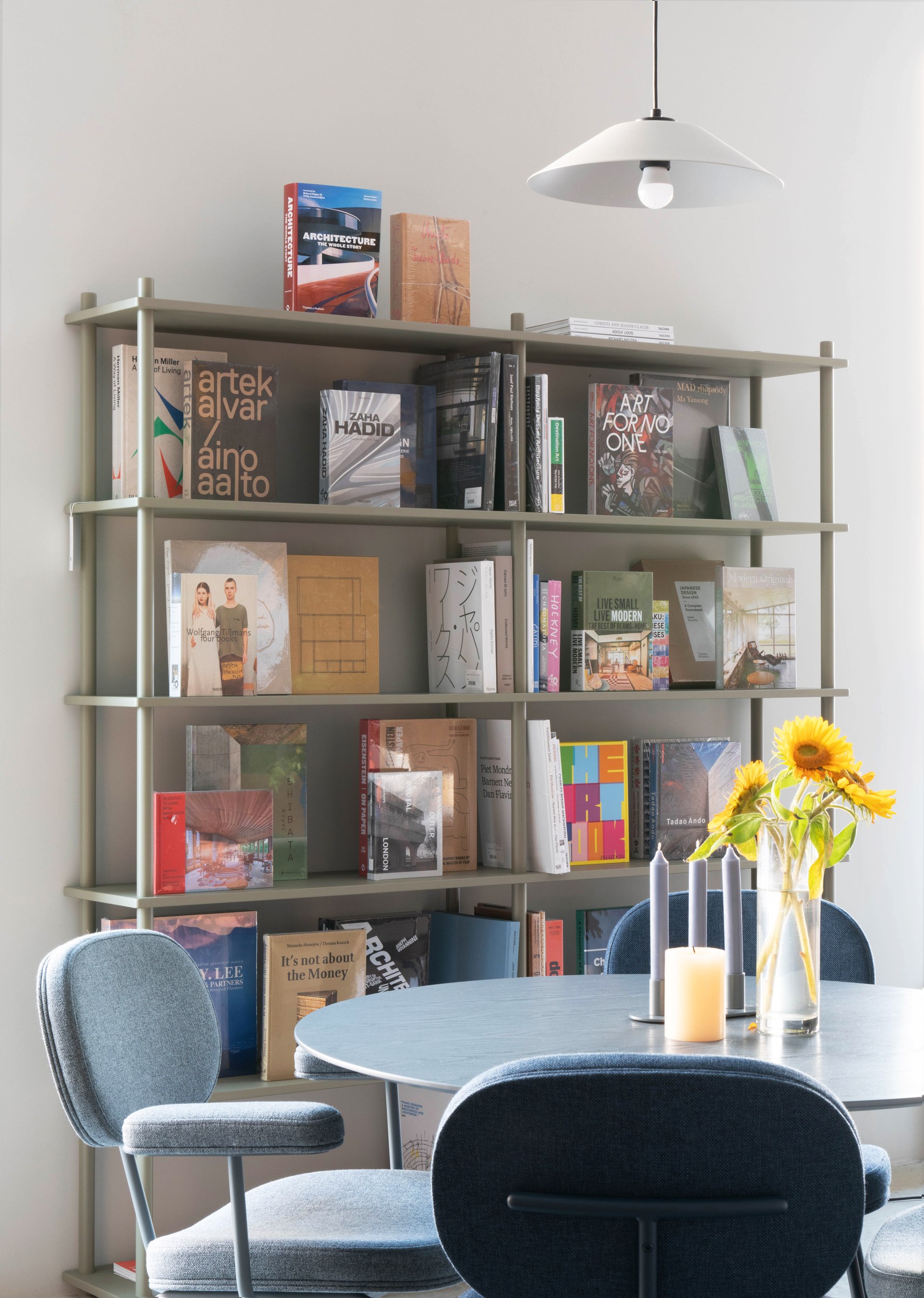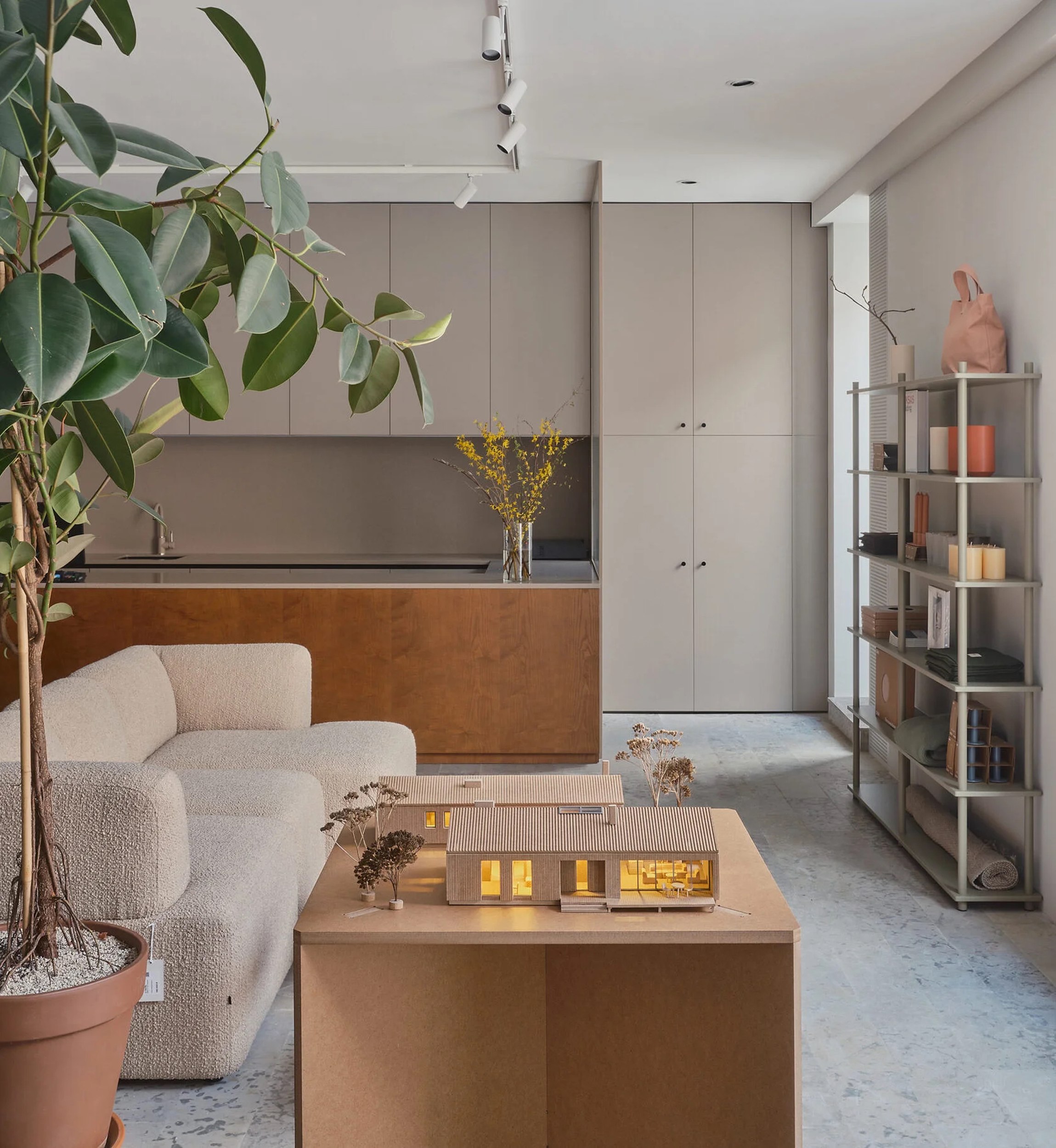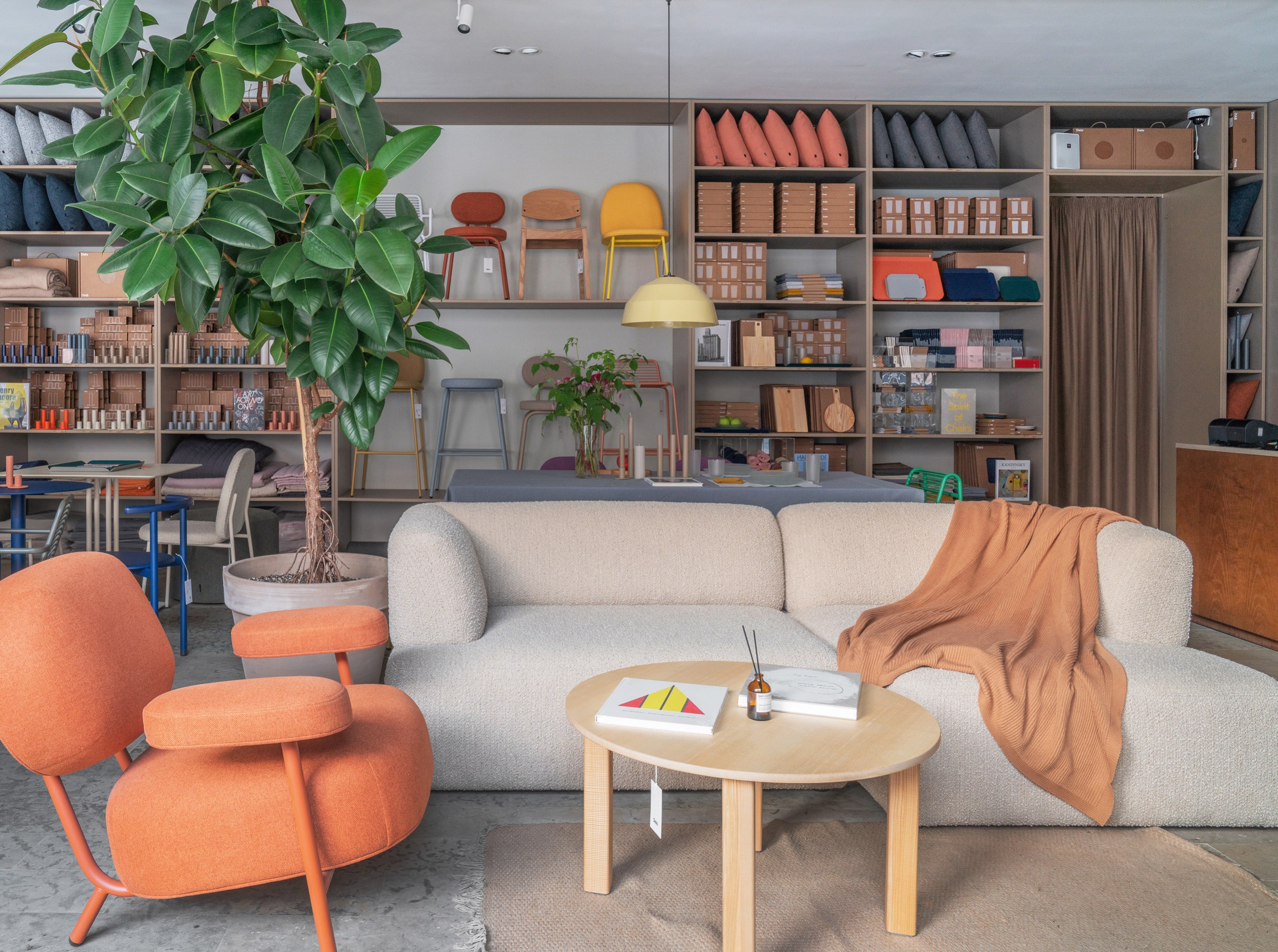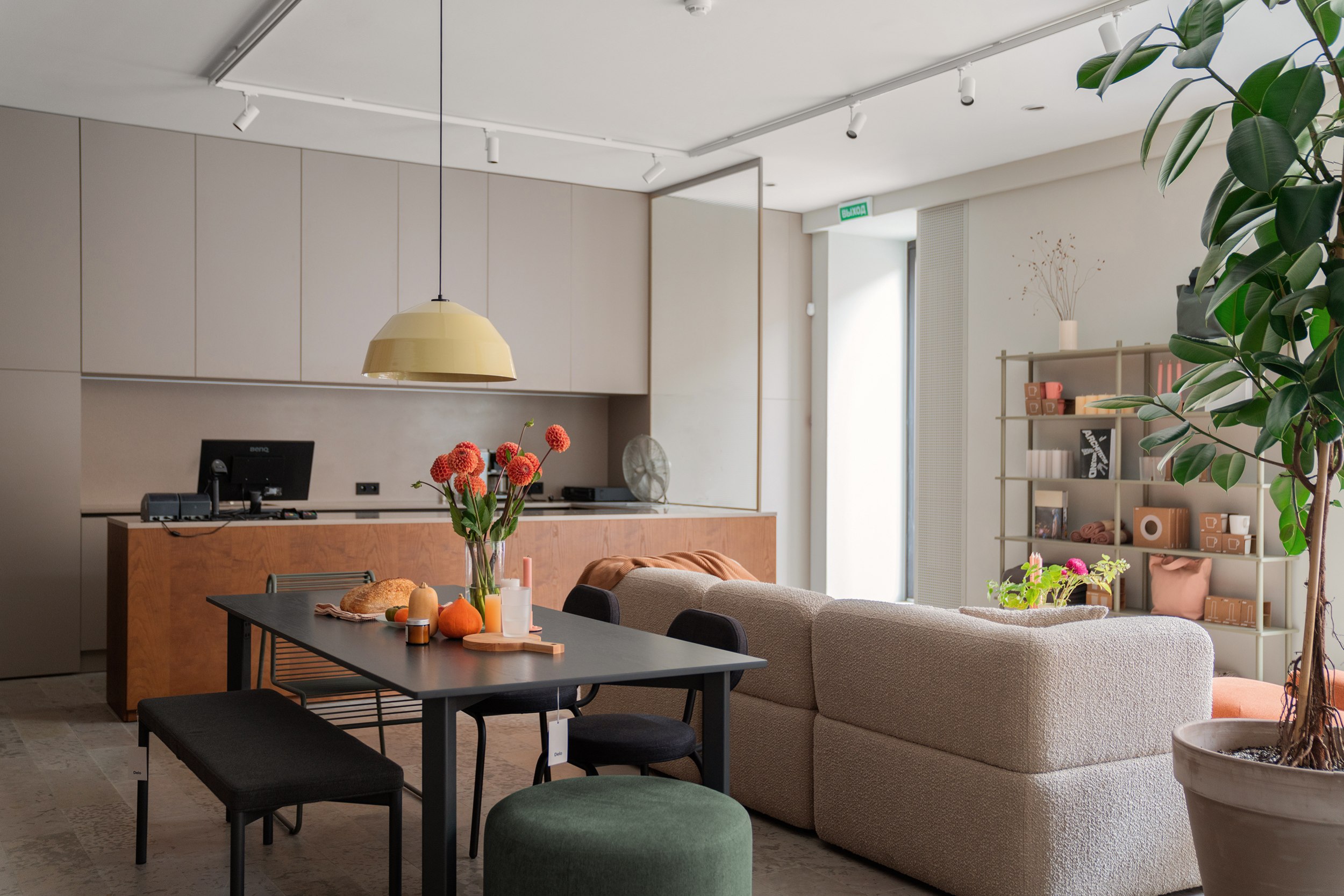 Проект объединяет шоурум и офис команды и демонстрирует все направления работы бренда. Здесь представлены мебель, предметы быта и одежда, а также макеты каркасных домов Delo House и книги об архитектуре и дизайне. Интерьер полностью состоит из мебели Delo – серийных моделей и специально спроектированных объектов.