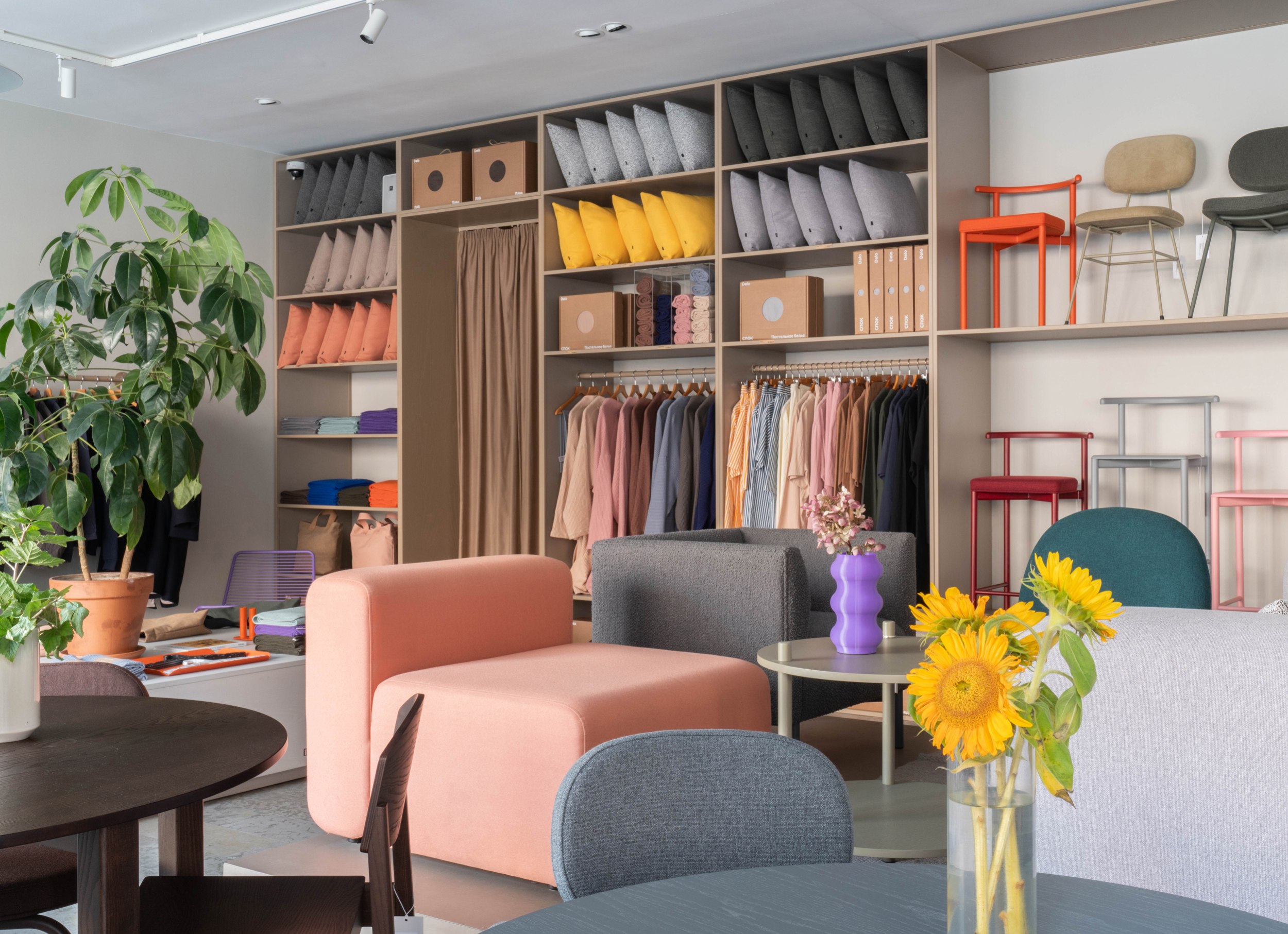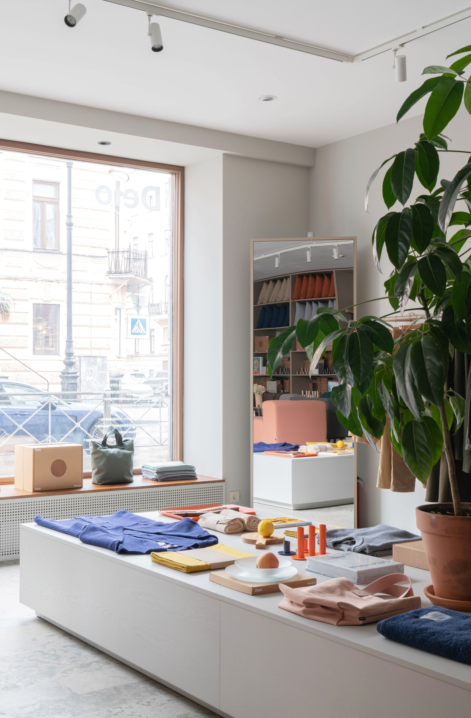 Большие окна-витрины оставлены свободными, а пол выложен плиткой из традиционного для Петербурга путиловского известняка. Для покупателей одежды предусмотрены примерочные.