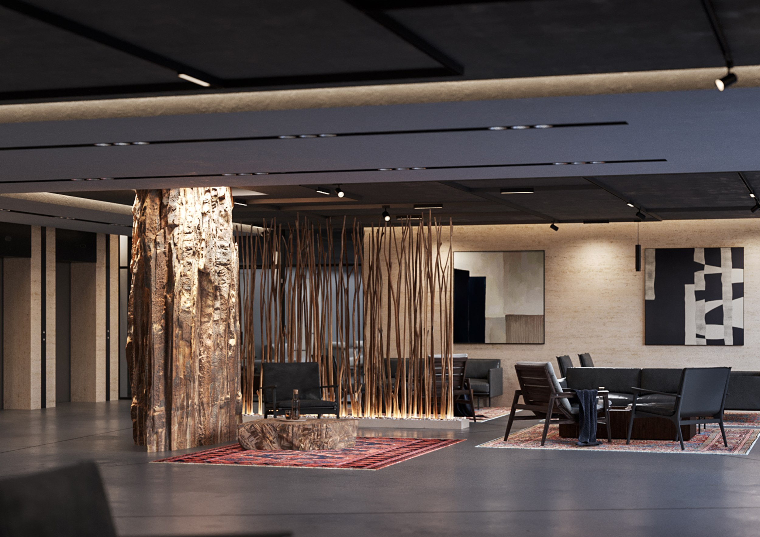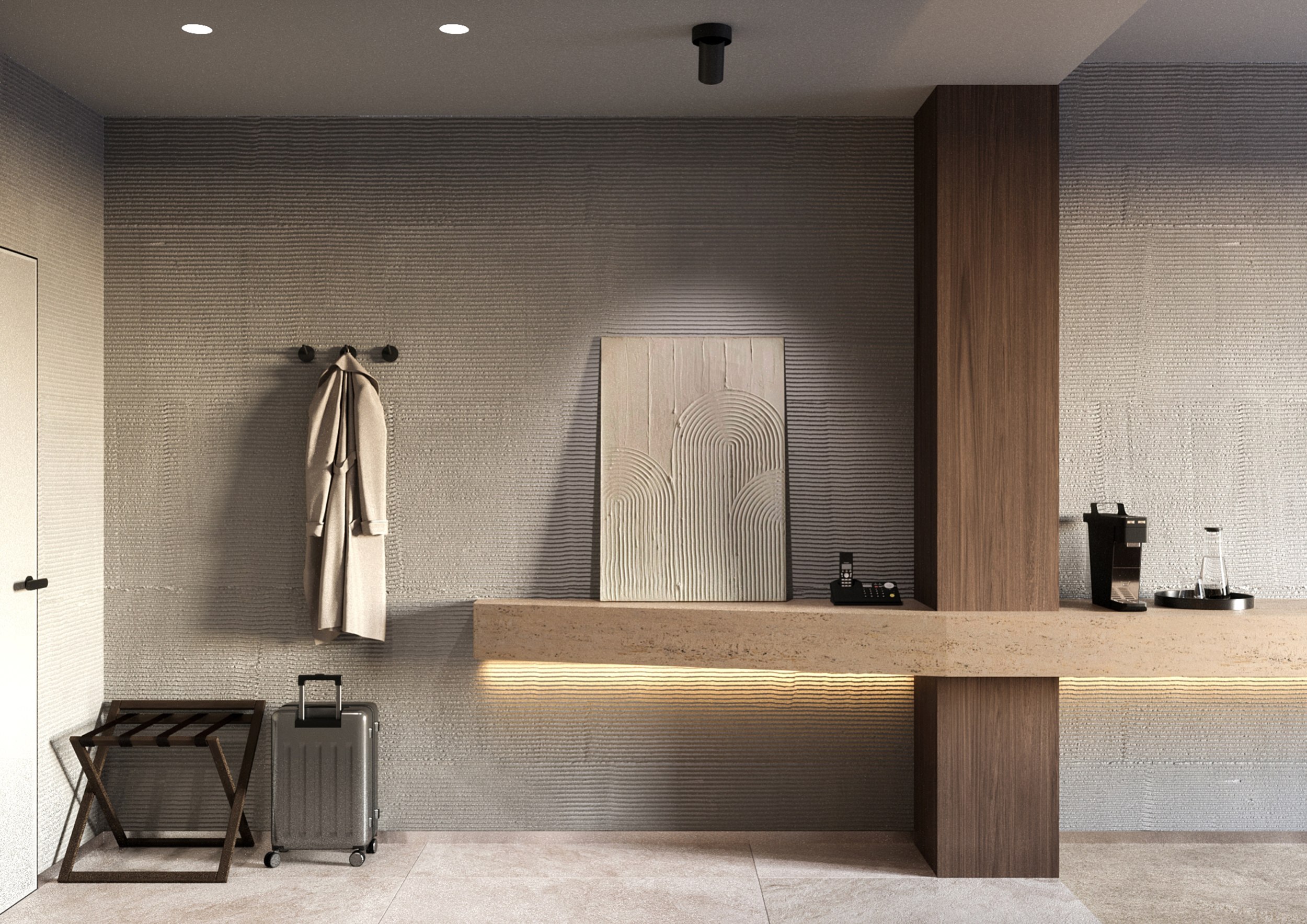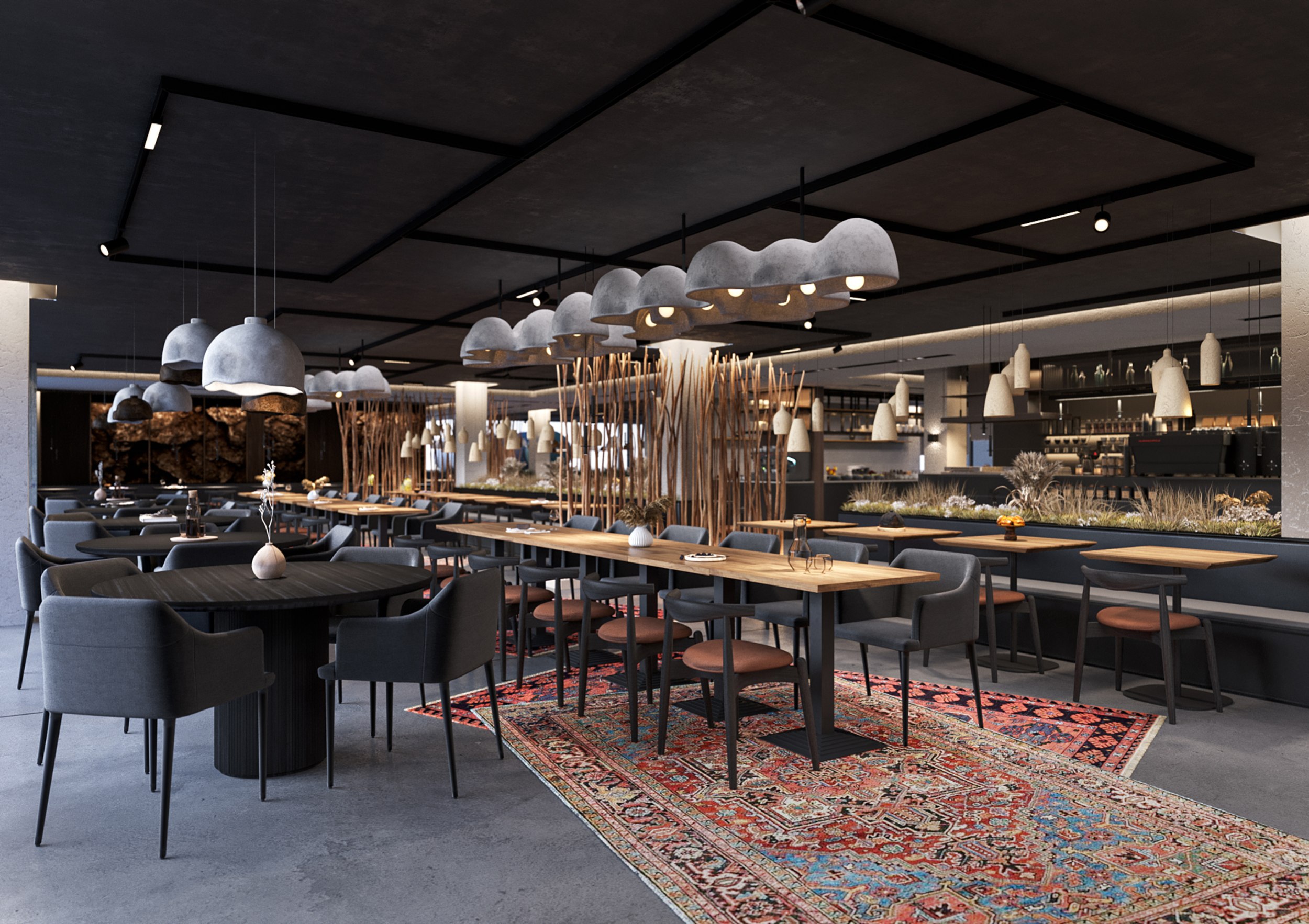 Интерьеры выполнены в эстетике неотрадиционного дизайна с локальными акцентами: светлые фактуры, лаконичная мебель и ковры с национальным орнаментом создают теплую атмосферу. Решение подчеркивает связь с местом и отвечает современному запросу на аутентичность туристического пространства.