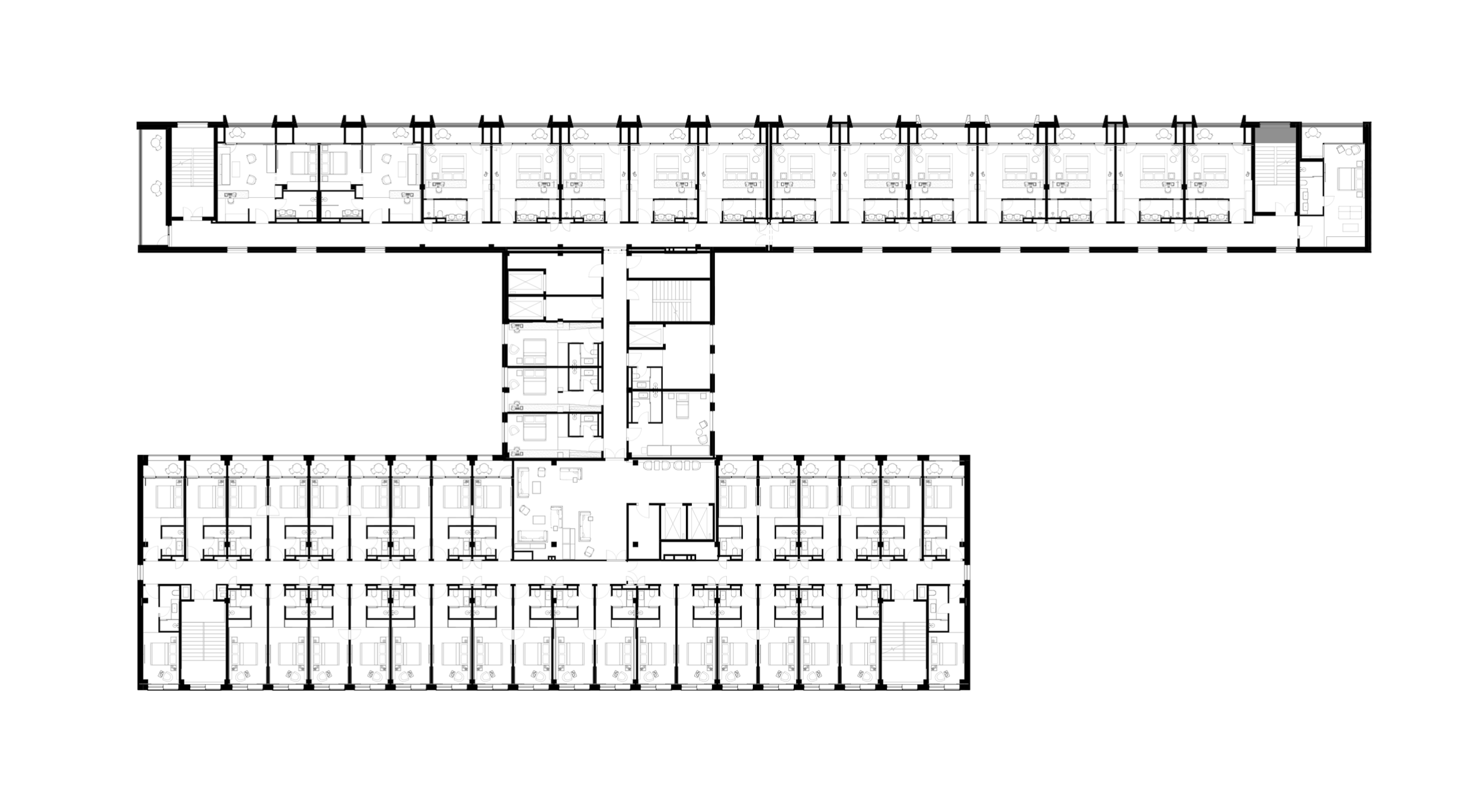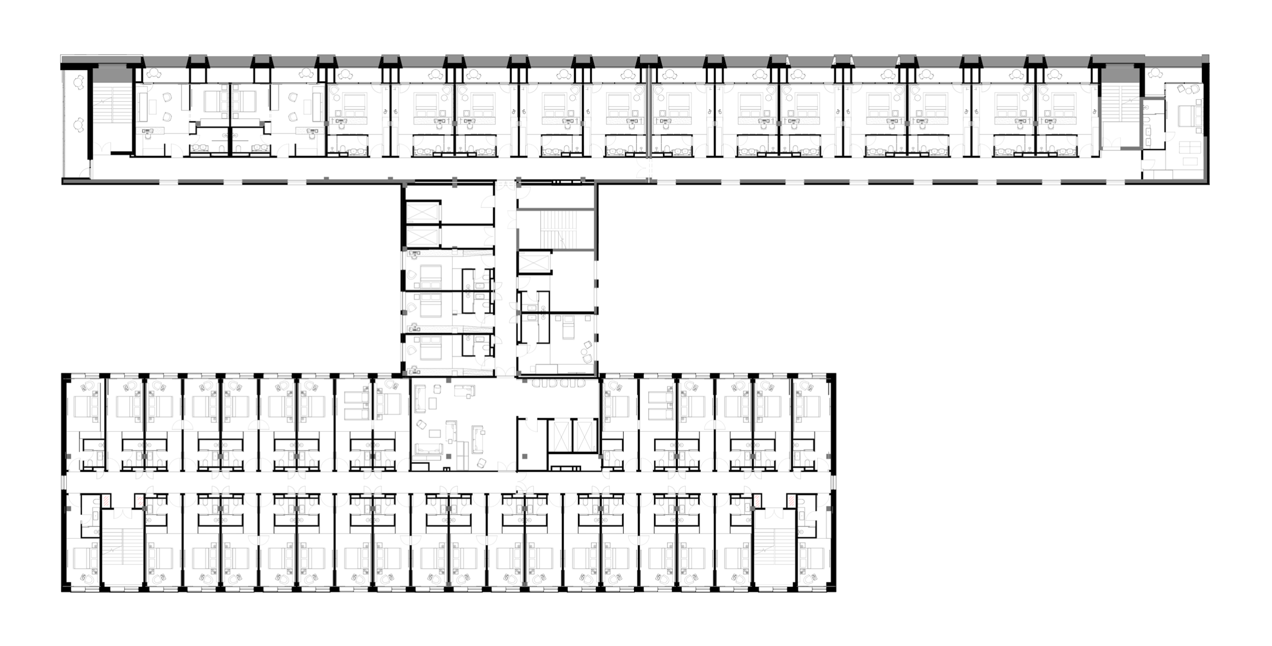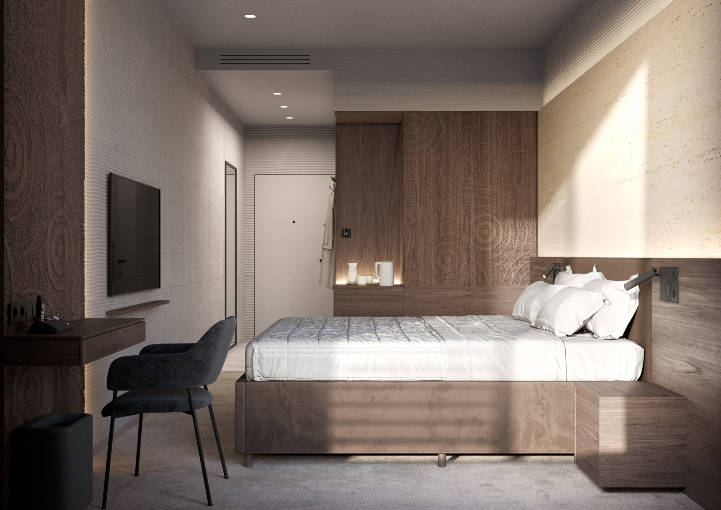 Пространственные сценарии были адаптированы под современные требования гостиничного размещения: каждый элемент – от конфигурации номерного фонда до логистики обслуживания – отвечает уровню международных операторов. Консультантом на всех этапах выступала команда ADHM, которая возьмет на себя управление объектом.