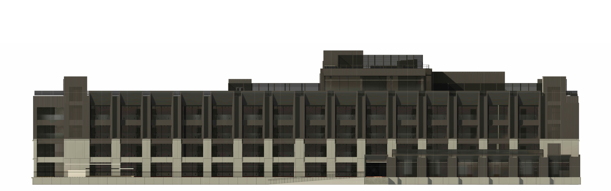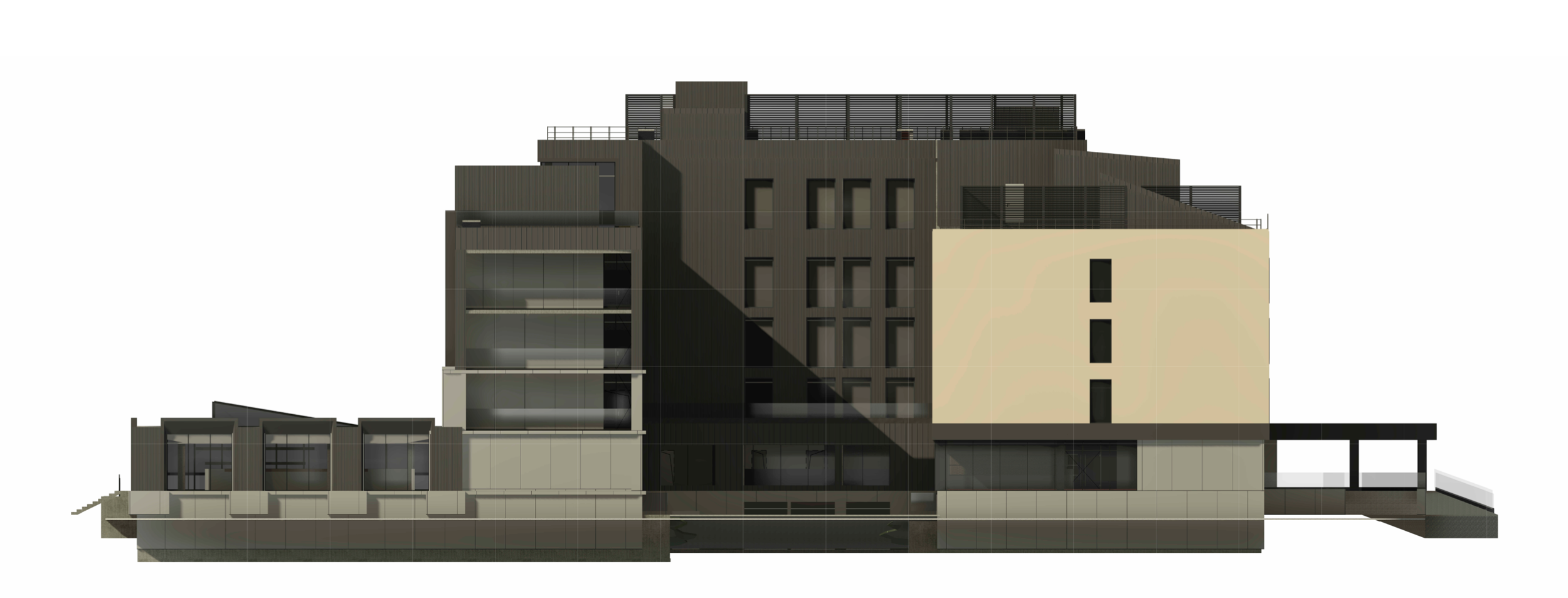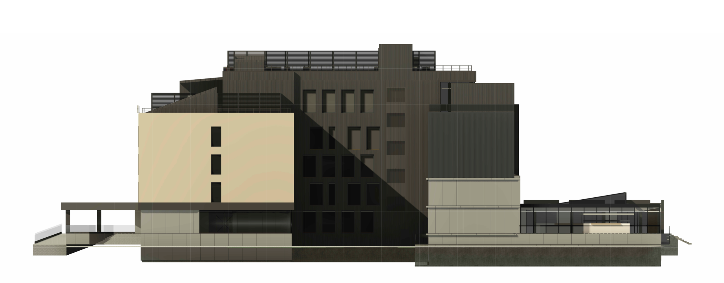 Фасады решены в спокойной нейтральной палитре, подчеркивающей масштаб, статус и пропорции здания. Морской фасад выполнен в сочетании композитных и HPL-панелей с разной текстурой. Витражное остекление создает комфортное видовое раскрытие на море.