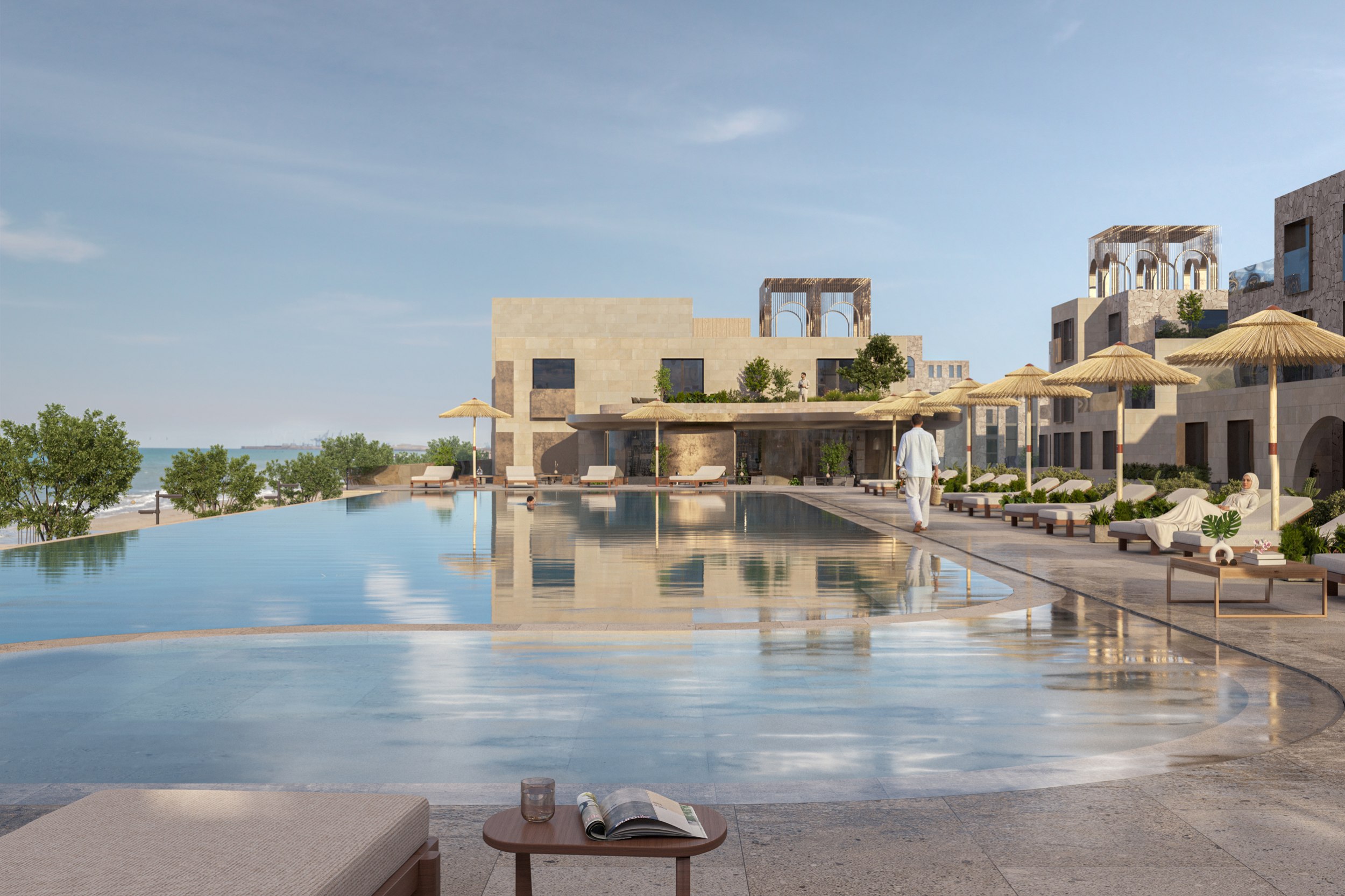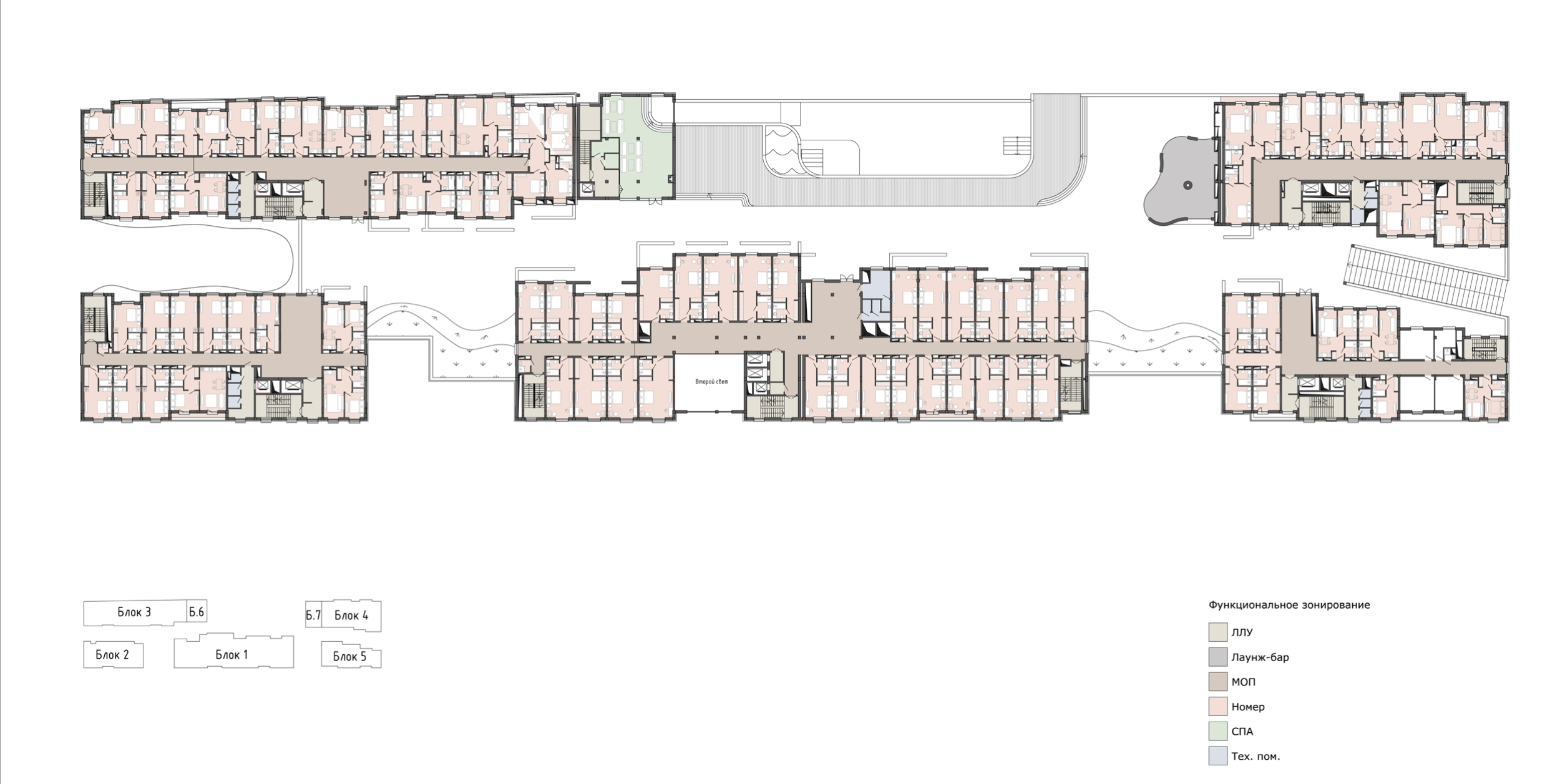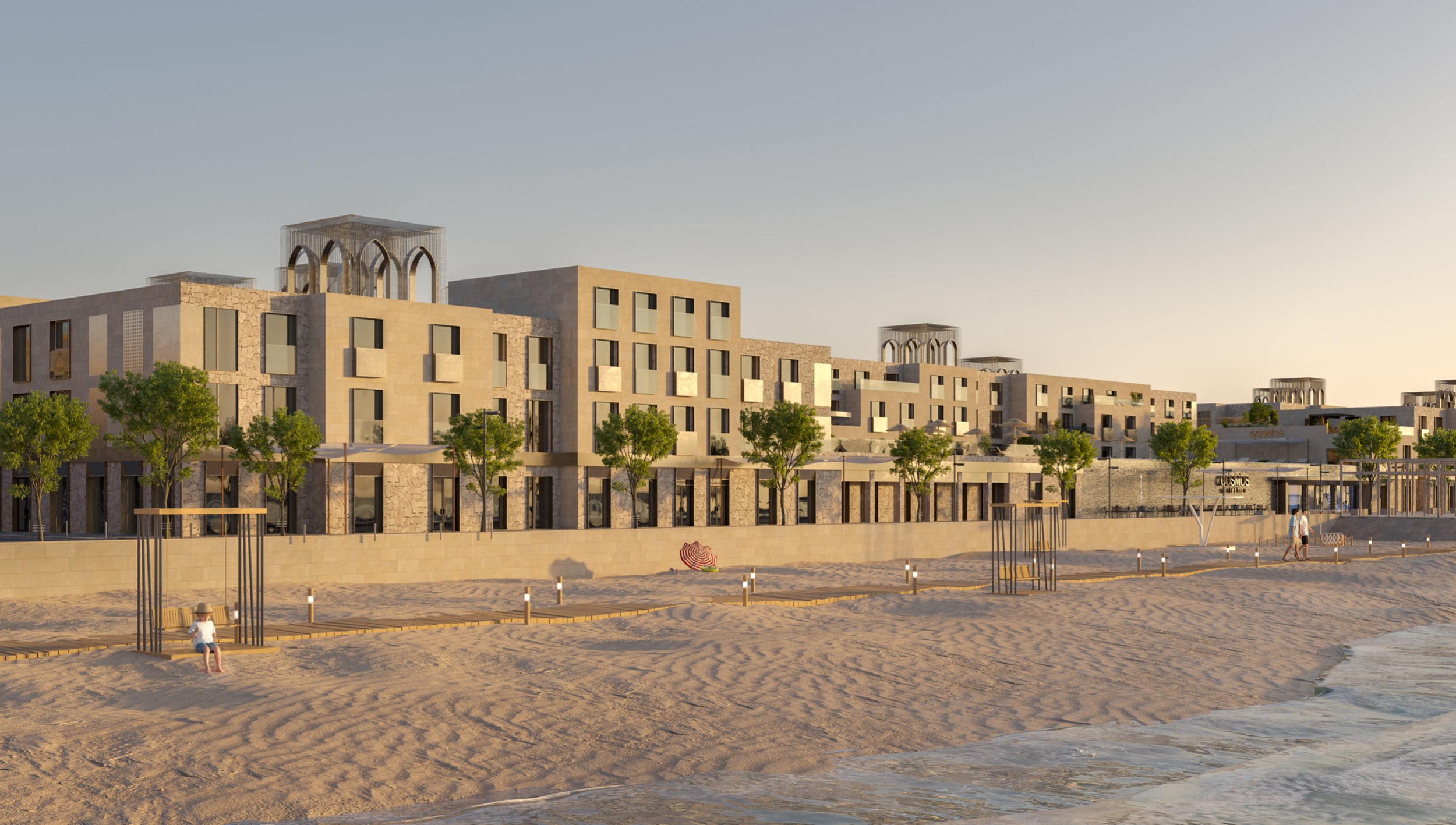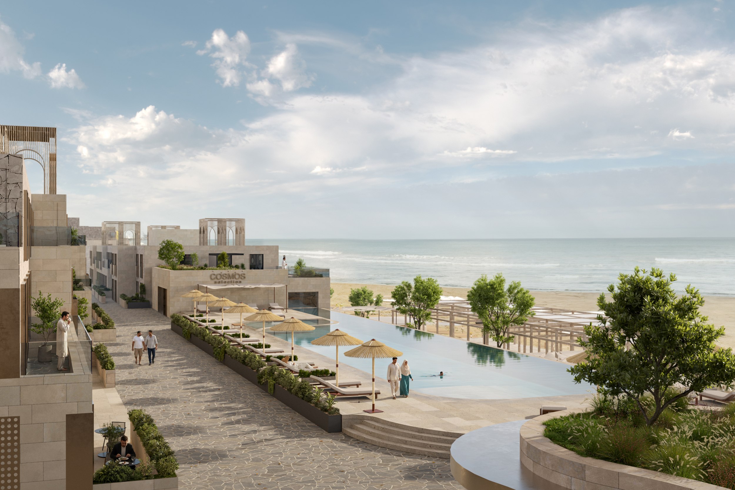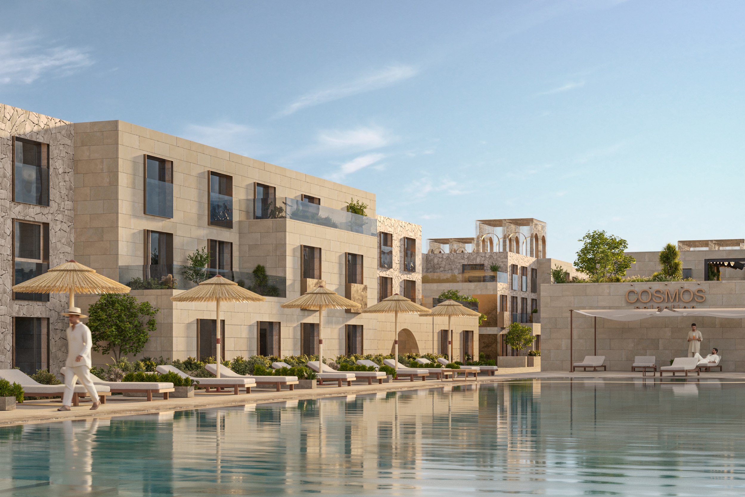 Центральным элементом комплекса является третий корпус, объединенный общим стилобатом, на котором расположен открытый бассейн с видом на море. В стилобатной части размещены SPA-комплекс, фитнес-зал, ресторан и коммерческие площади, формирующие полноценную инфраструктуру для отдыха. В пяти блоках располагается роскошный пятизвездочный отель «COSMOS» на 90 номеров, задающий новые стандарты гостеприимства в регионе.