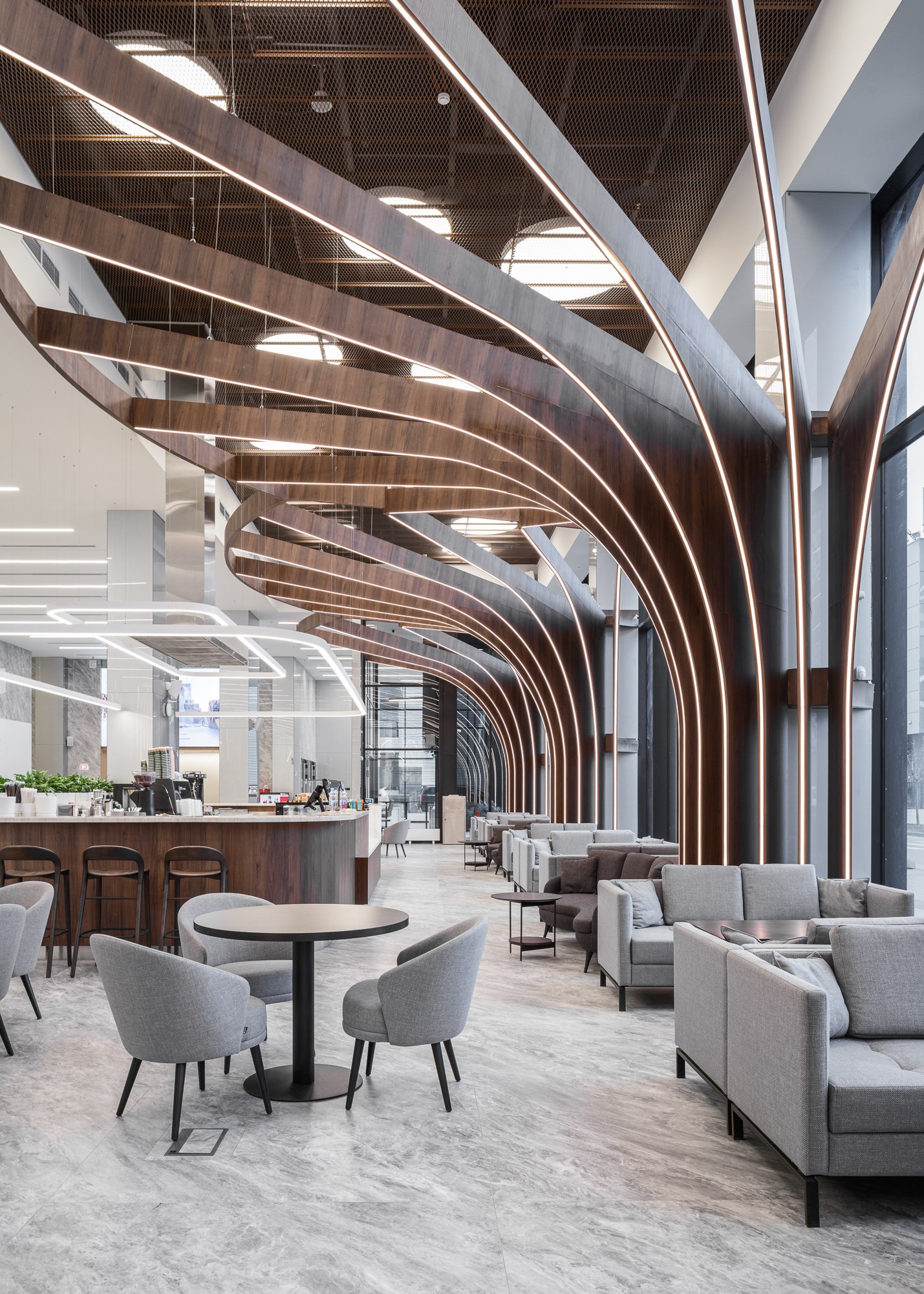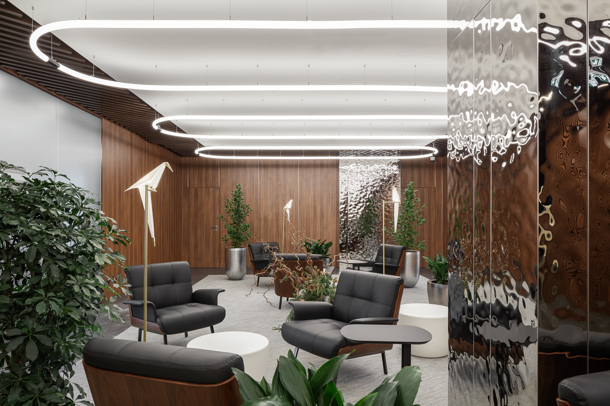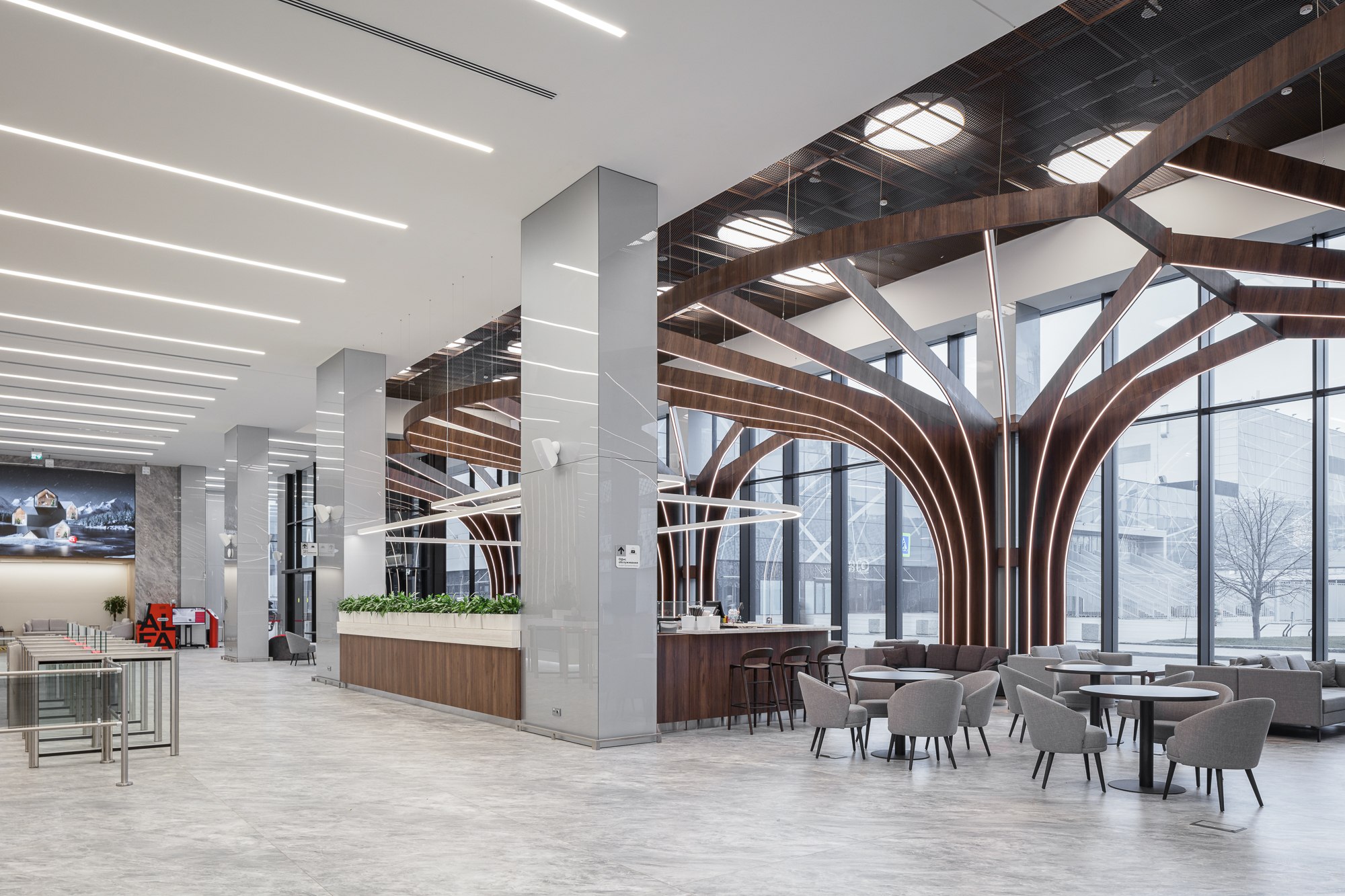 Освещение также тщательно продумано во всех зонах офиса. На первом этаже, помимо деревьев вдоль фасада с подсвеченными ветками, в лифтовой зоне располагается инсталляция из 1000 световых элементов. Они, как светлячки на золотом фоне, приглашают в офисные пространства. Двусветный атриум на 14 этаже украшен похожими на одуванчики декоративными светильниками. Они подвешены на тонких тросах и кажутся парящими в пространстве. На втором этаже в зоне столовой и кафетерия в стену встроены лайтбоксы с фотоизображениями растений и пейзажей. В кафетерии также используется несколько видов декоративных светильников. В столовой – арки с декоративными зеркалами и подсветкой за ними.