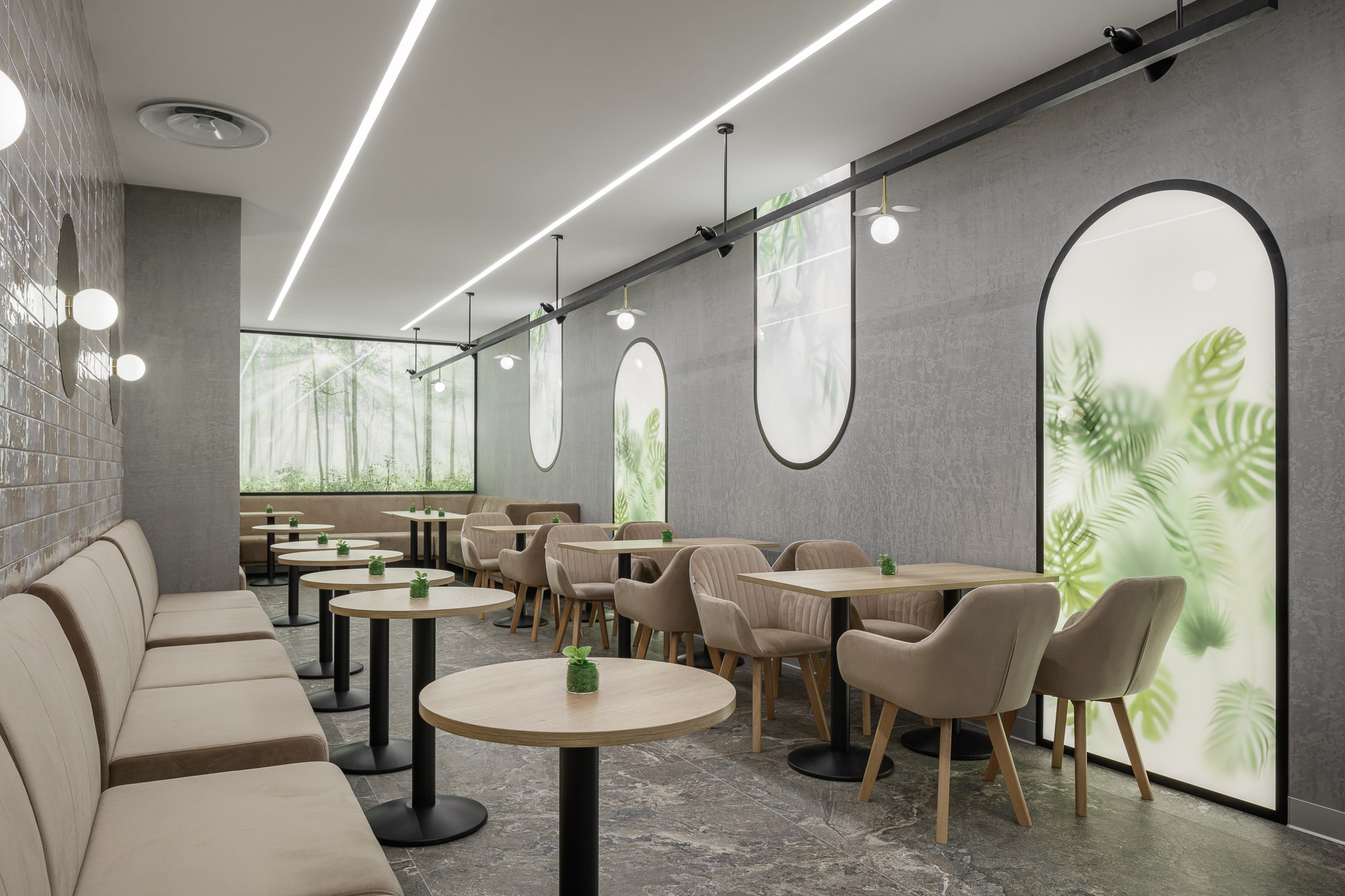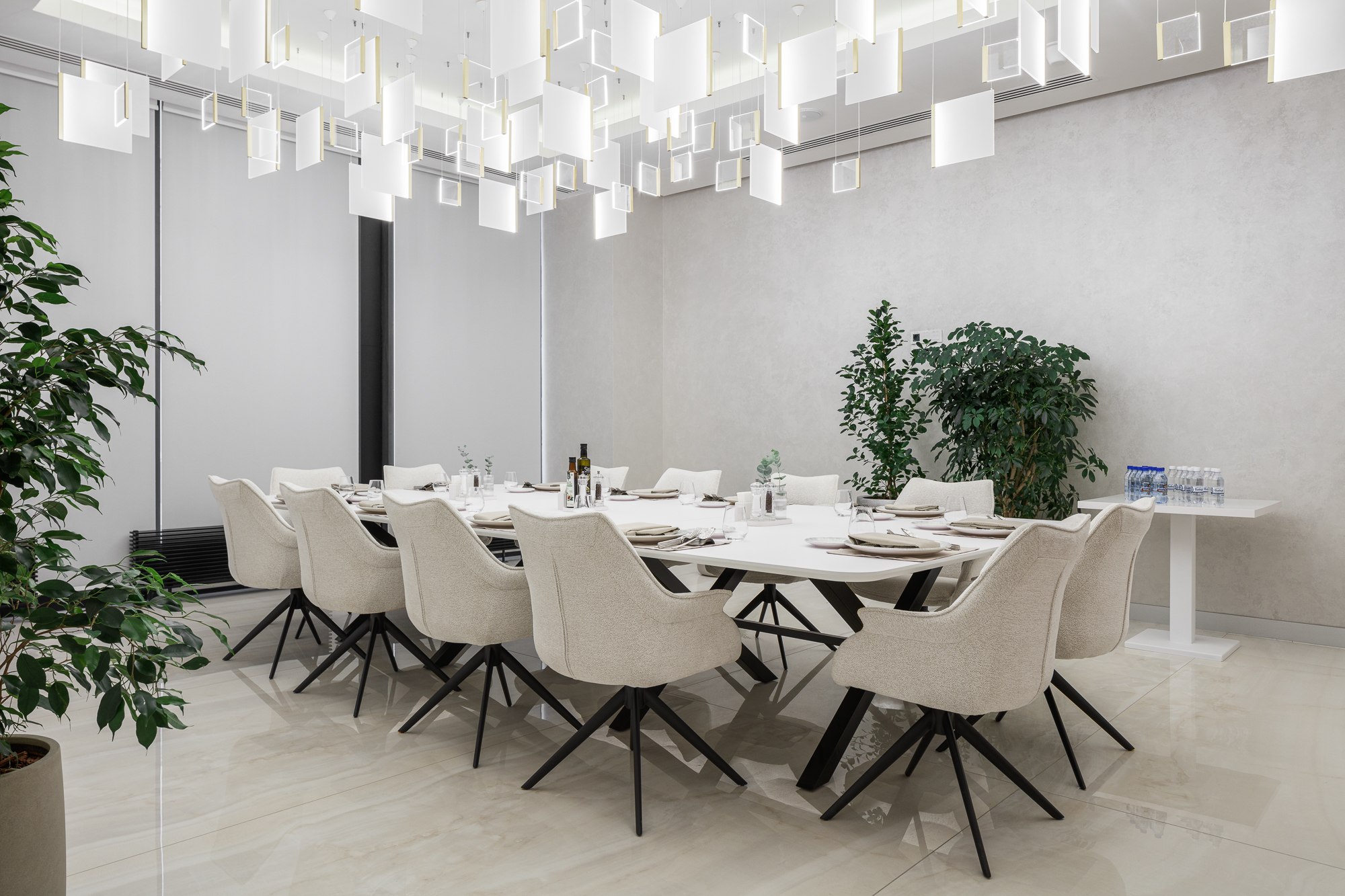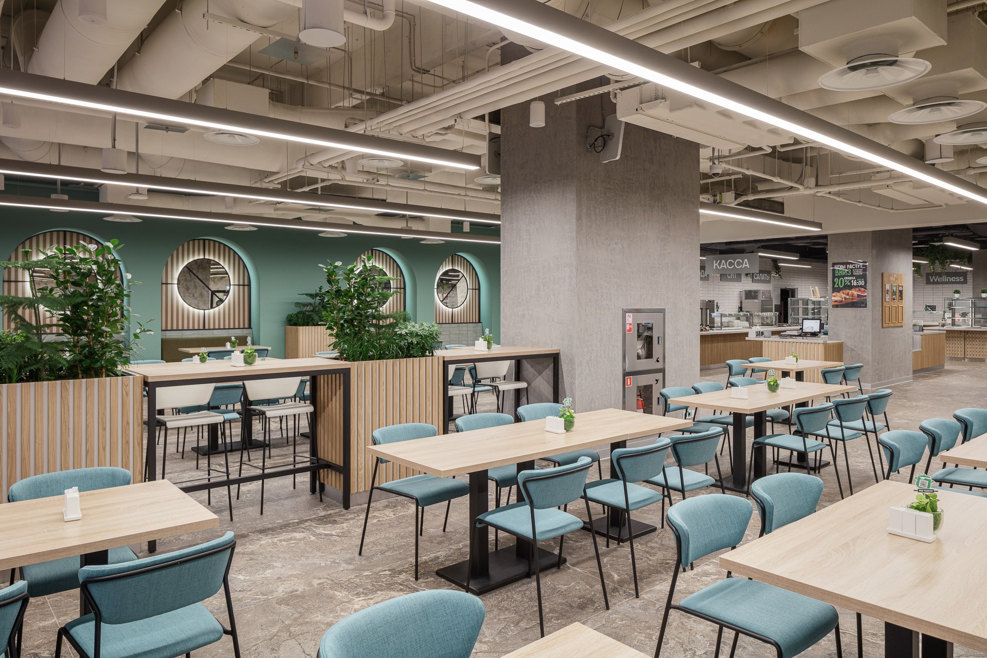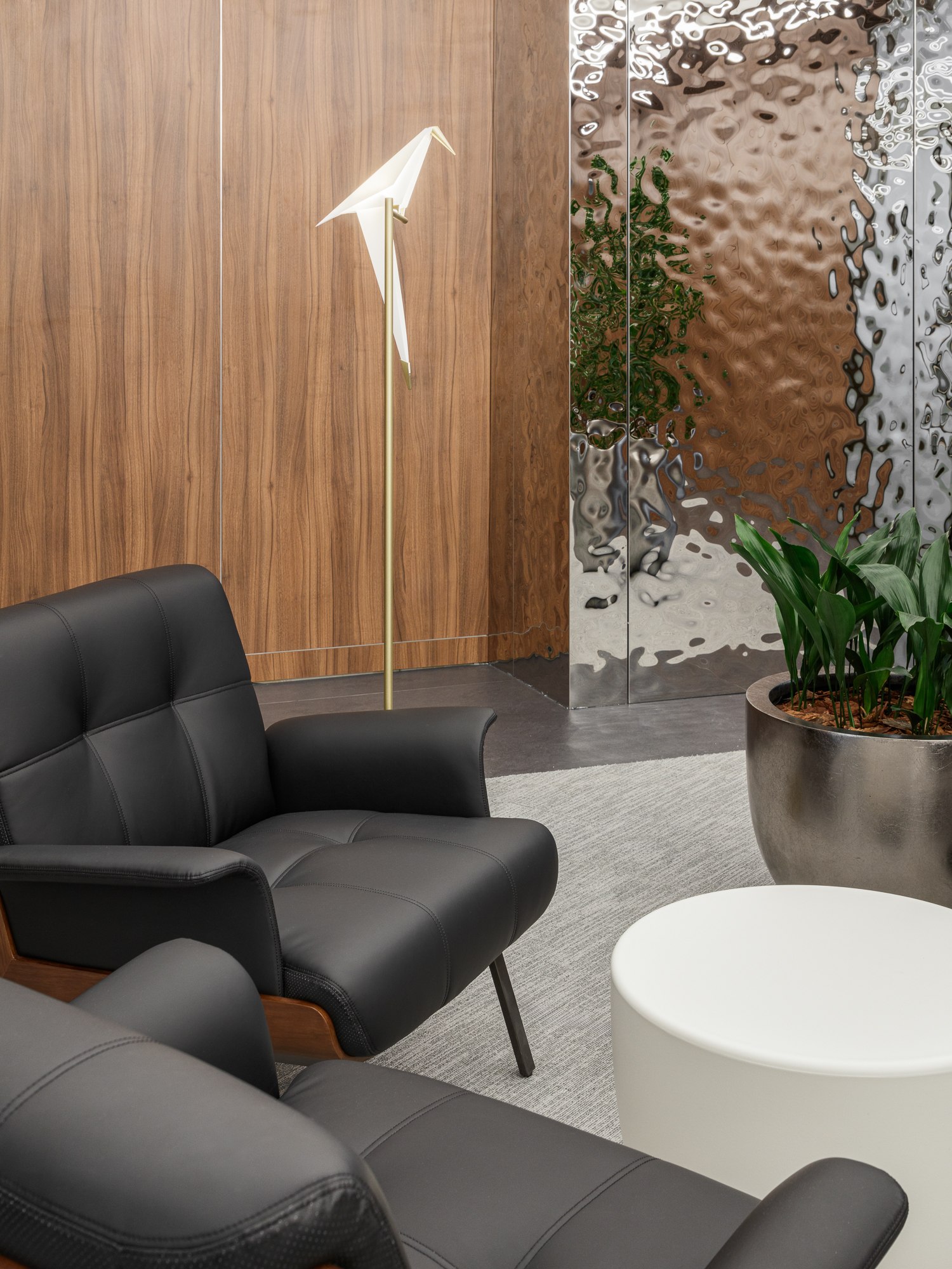 Освещение также тщательно продумано во всех зонах офиса. На первом этаже, помимо деревьев вдоль фасада с подсвеченными ветками, в лифтовой зоне располагается инсталляция из 1000 световых элементов. Они, как светлячки на золотом фоне, приглашают в офисные пространства. Двусветный атриум на 14 этаже украшен похожими на одуванчики декоративными светильниками. Они подвешены на тонких тросах и кажутся парящими в пространстве. На втором этаже в зоне столовой и кафетерия в стену встроены лайтбоксы с фотоизображениями растений и пейзажей. В кафетерии также используется несколько видов декоративных светильников. В столовой – арки с декоративными зеркалами и подсветкой за ними.