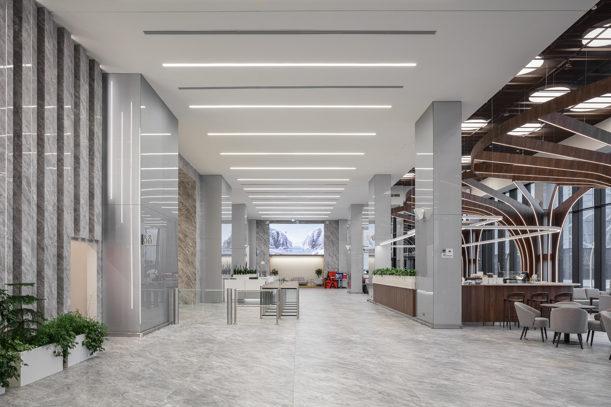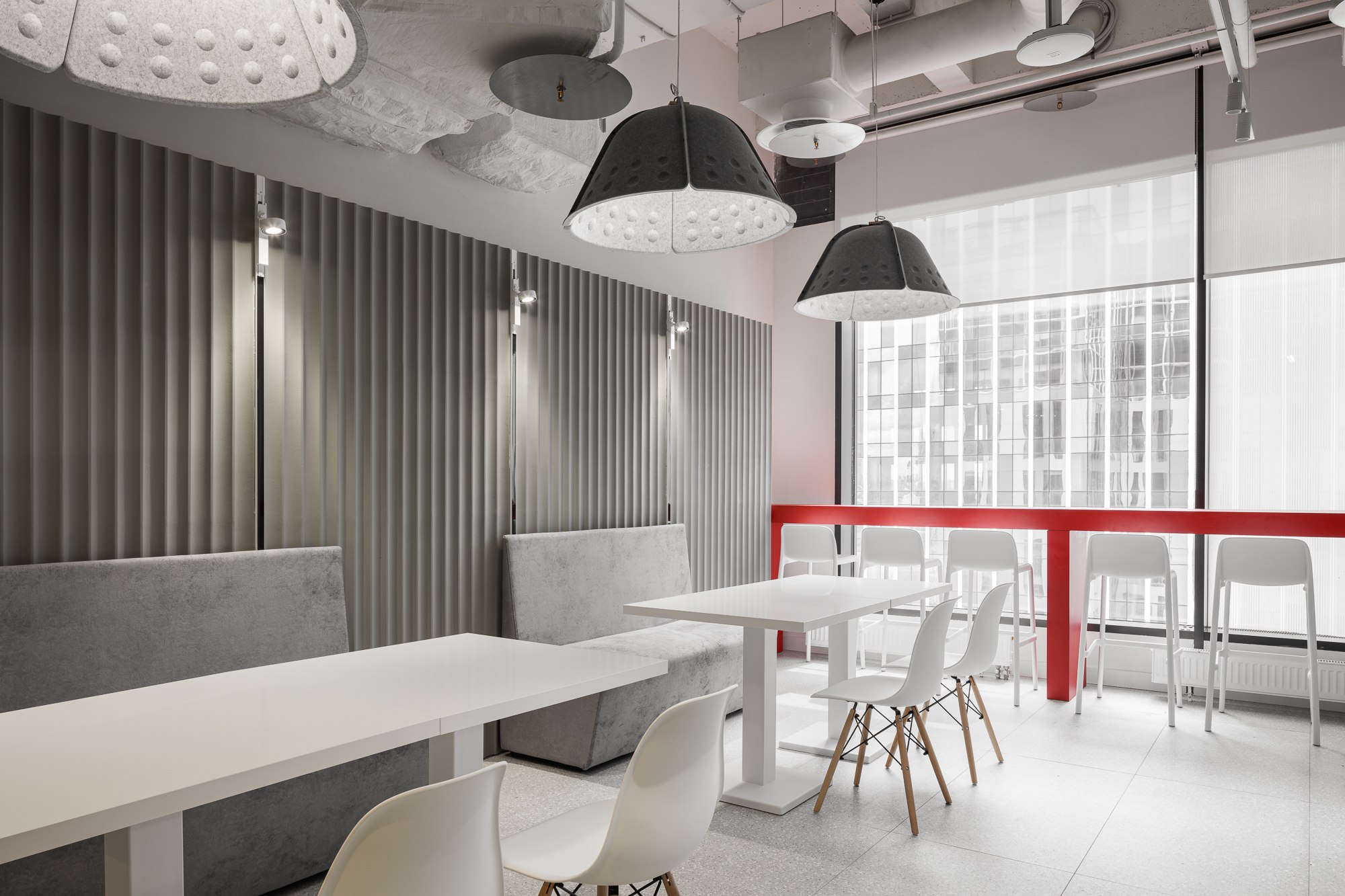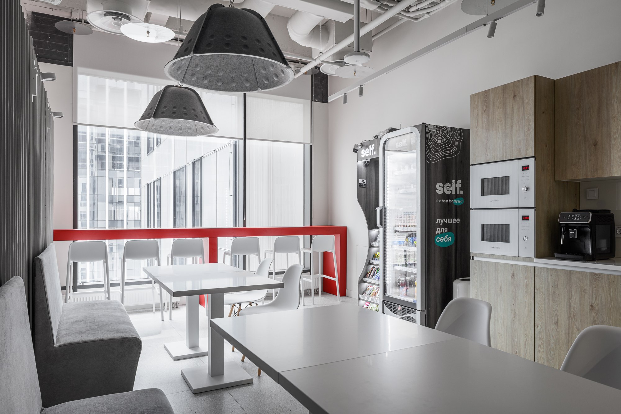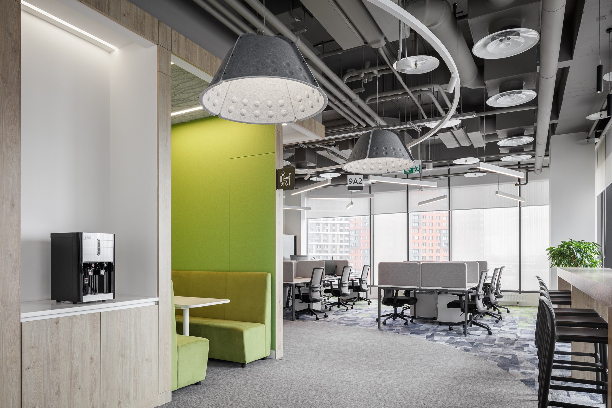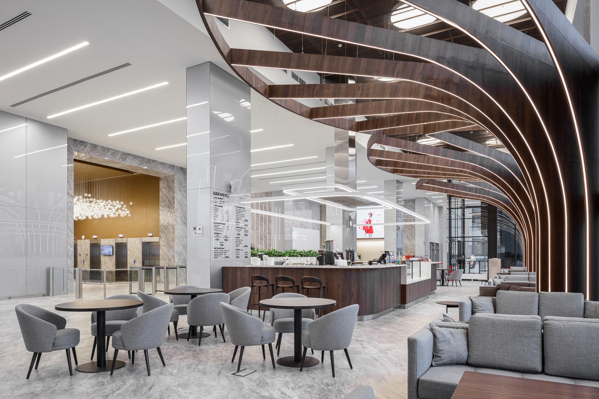 В интерьере офиса отразились ключевые ценности компании: новаторство, функциональность, внимание к деталям и забота о сотрудниках. Это выразилось в таких решениях, как продуманная эргономика, обширный фронт естественного освещения, комфортные санузлы, большое количество кофе-поинтов, помещения для индивидуальной работы разного размера, отделанные звукопоглощающим материалом, климат-контроль во всех помещениях. Особое внимание уделено акустическому комфорту и логике пространства. Например, представительские зоны и весь пятнадцатый этаж имеют специальное акустическое напыление за подвесным потолком.