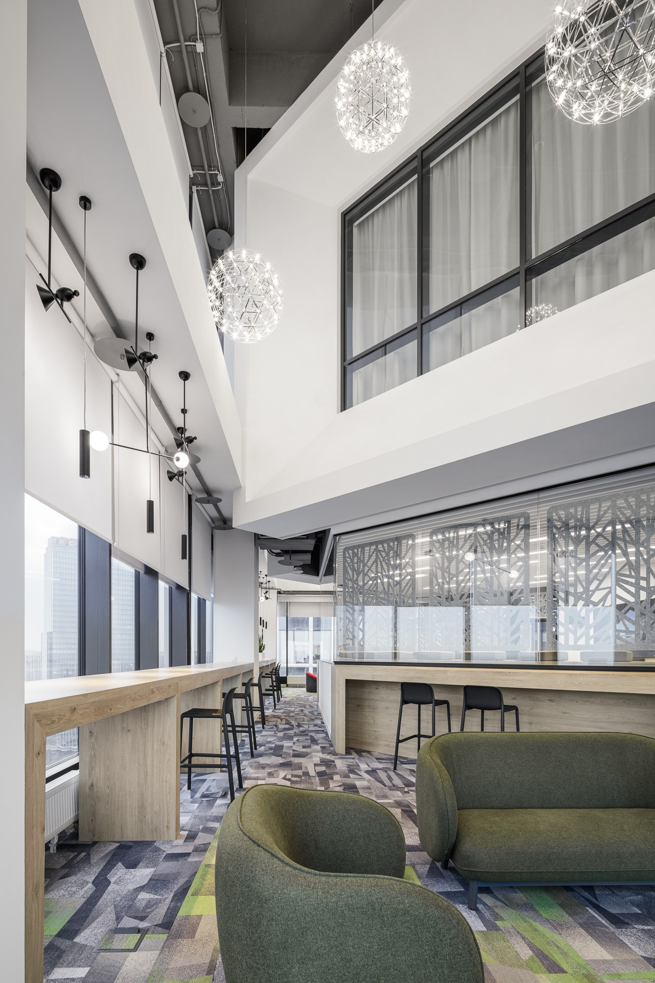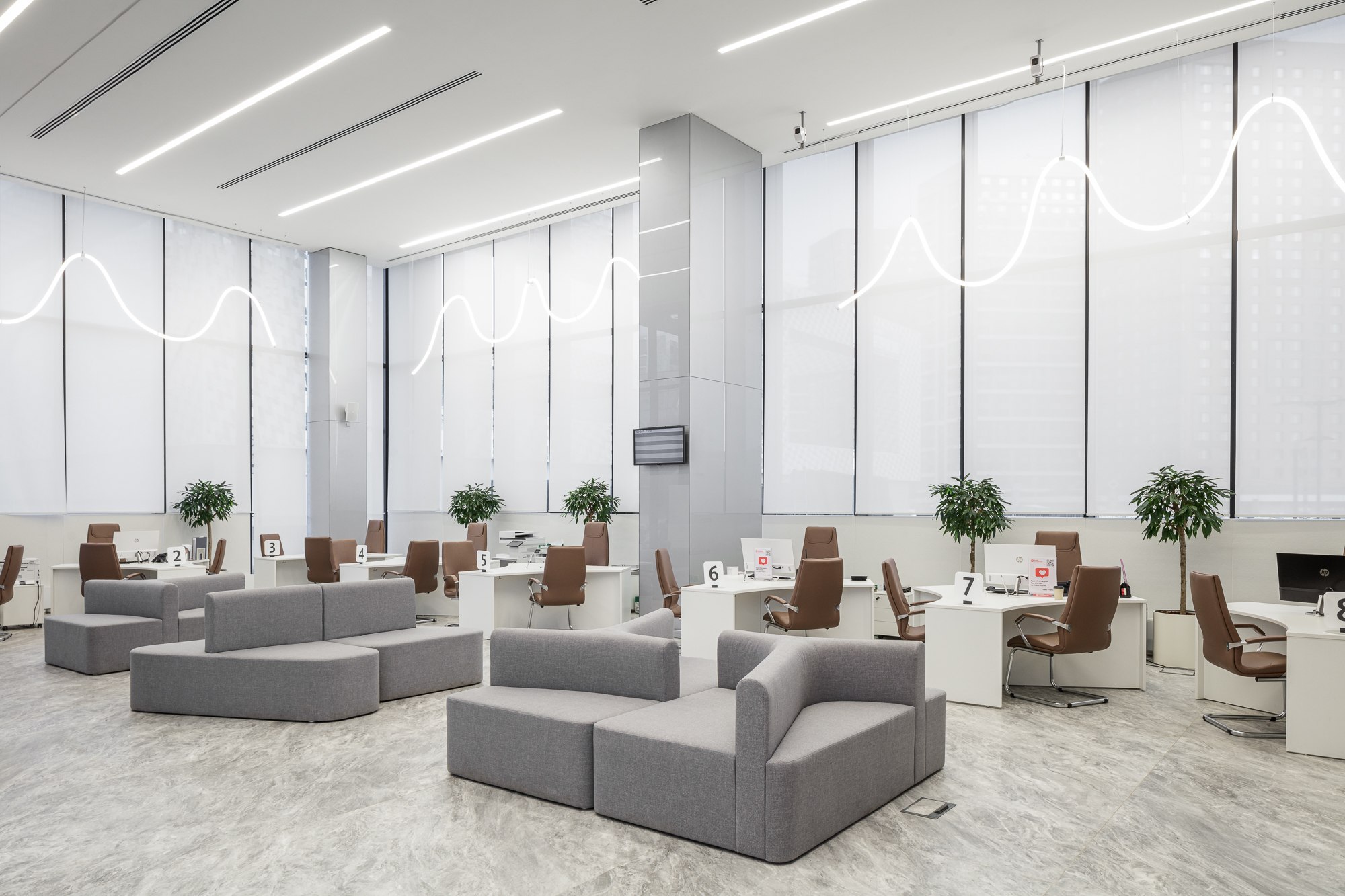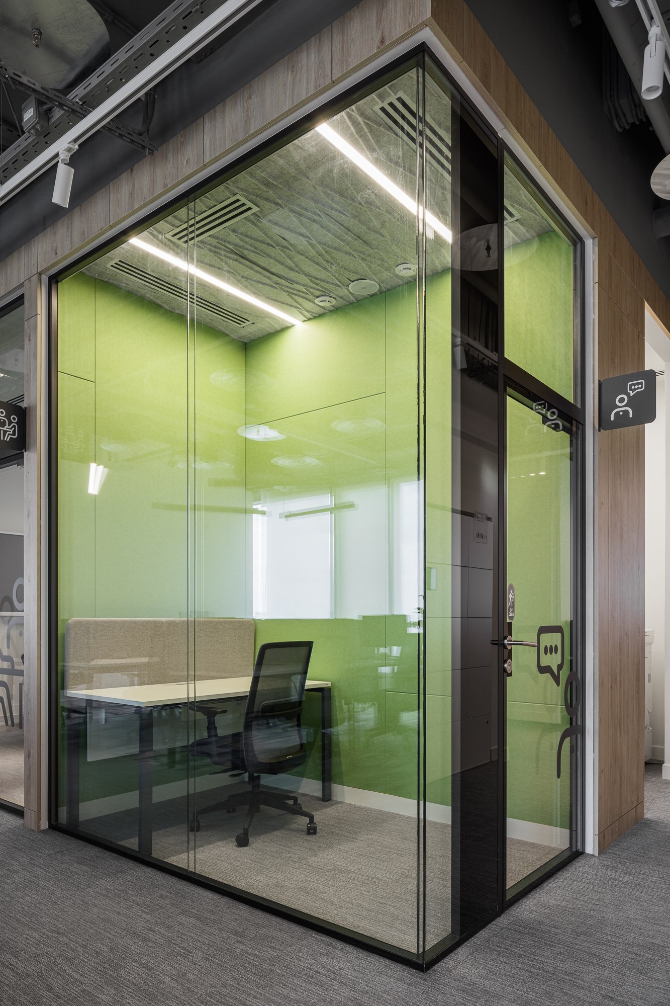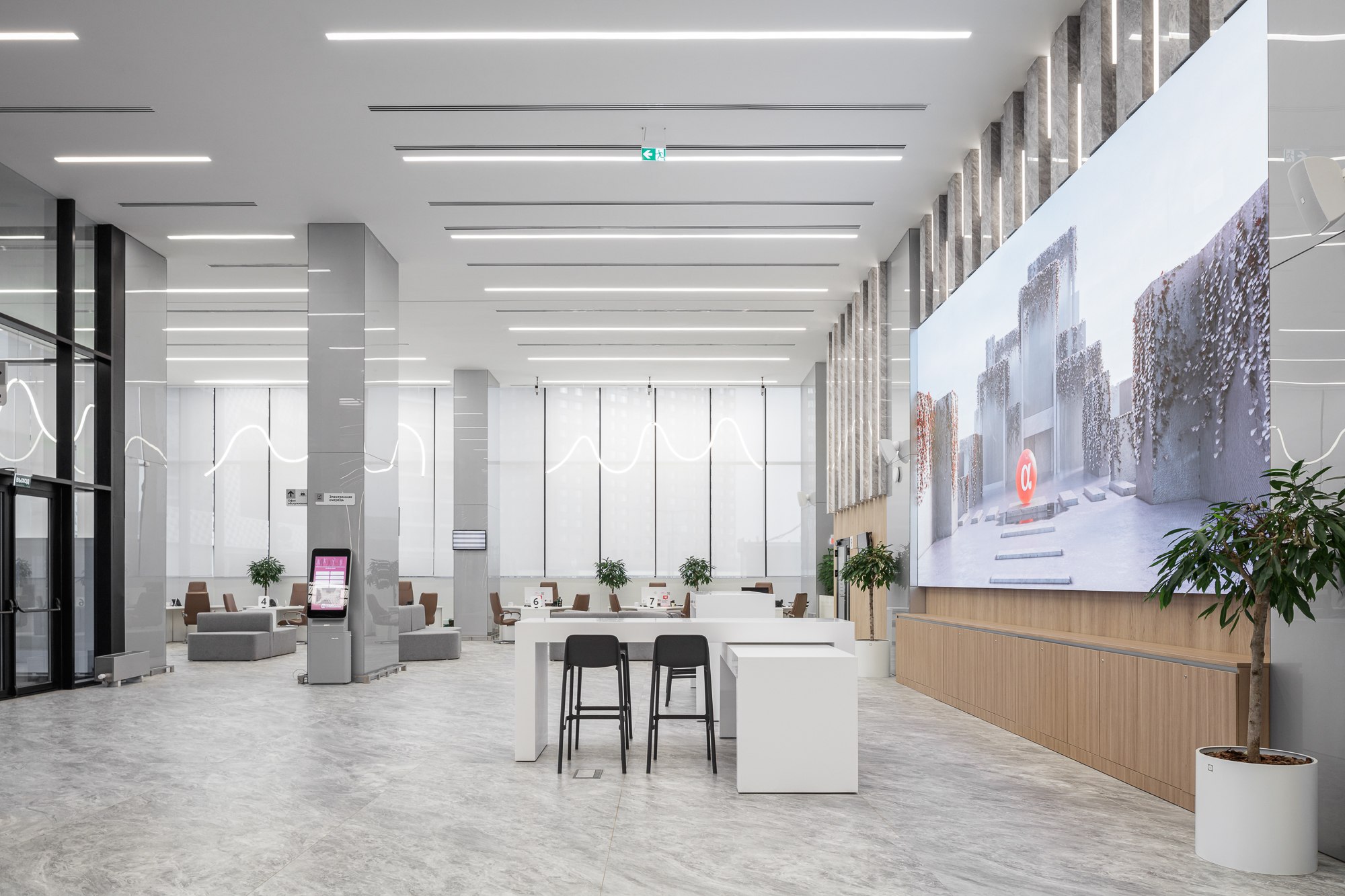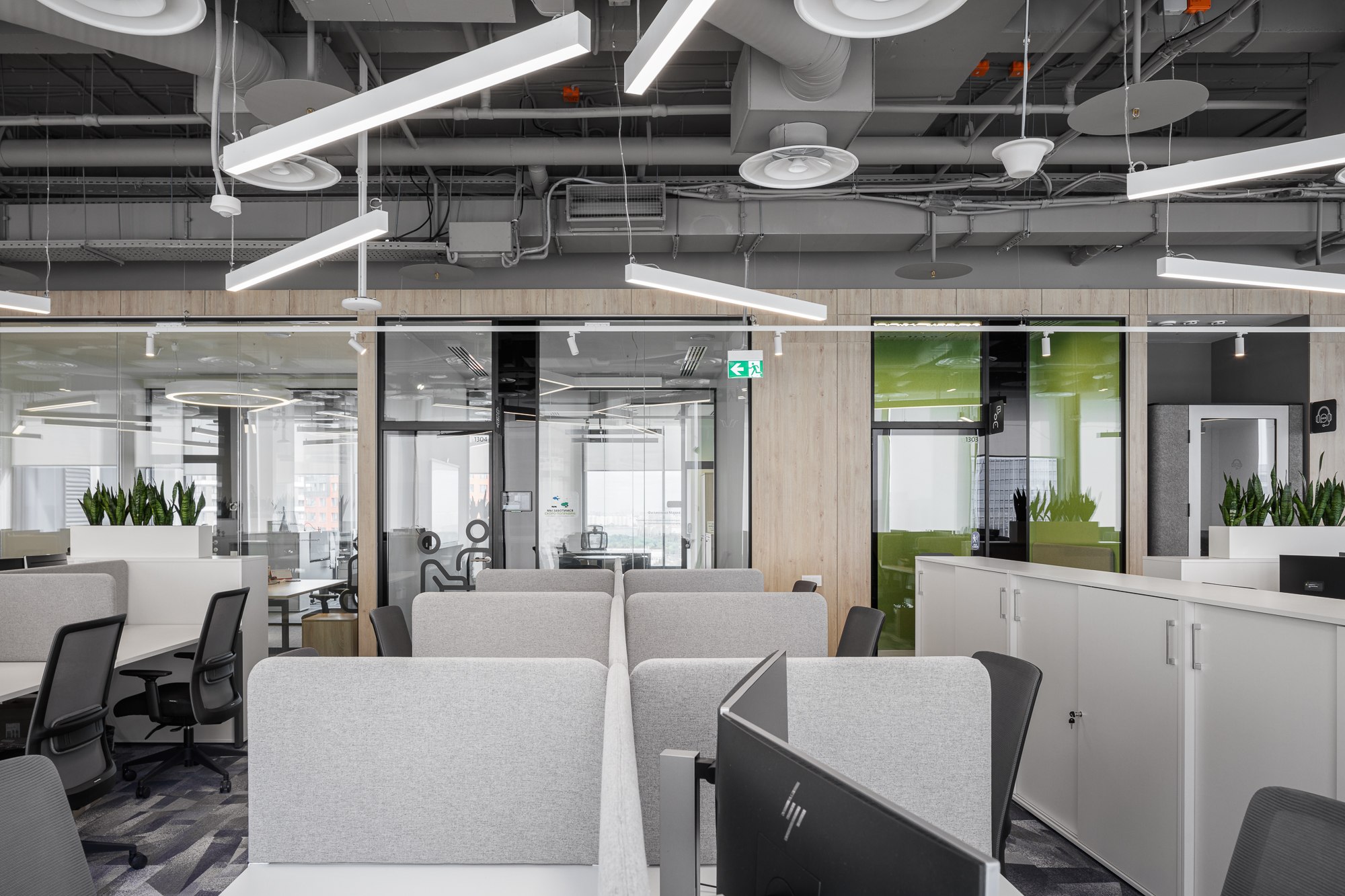 В интерьере офиса отразились ключевые ценности компании: новаторство, функциональность, внимание к деталям и забота о сотрудниках. Это выразилось в таких решениях, как продуманная эргономика, обширный фронт естественного освещения, комфортные санузлы, большое количество кофе-поинтов, помещения для индивидуальной работы разного размера, отделанные звукопоглощающим материалом, климат-контроль во всех помещениях. Особое внимание уделено акустическому комфорту и логике пространства. Например, представительские зоны и весь пятнадцатый этаж имеют специальное акустическое напыление за подвесным потолком.