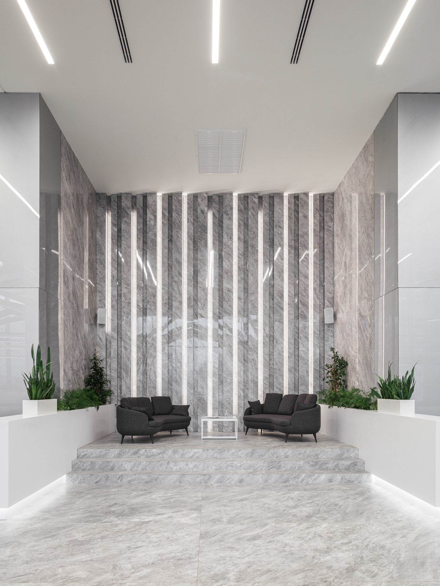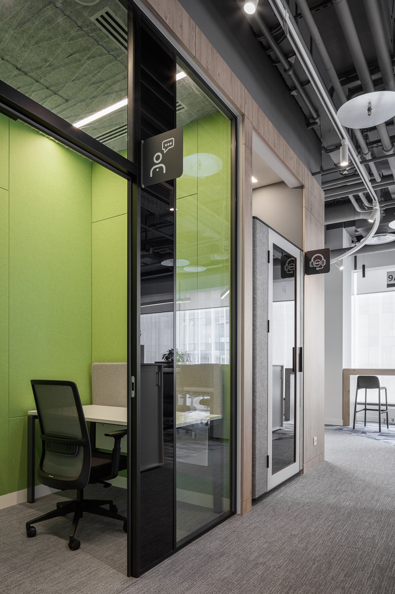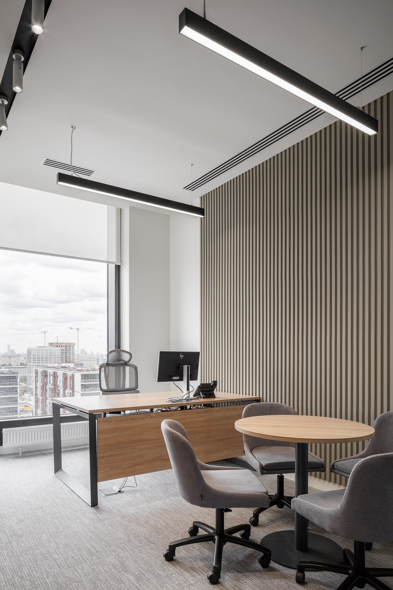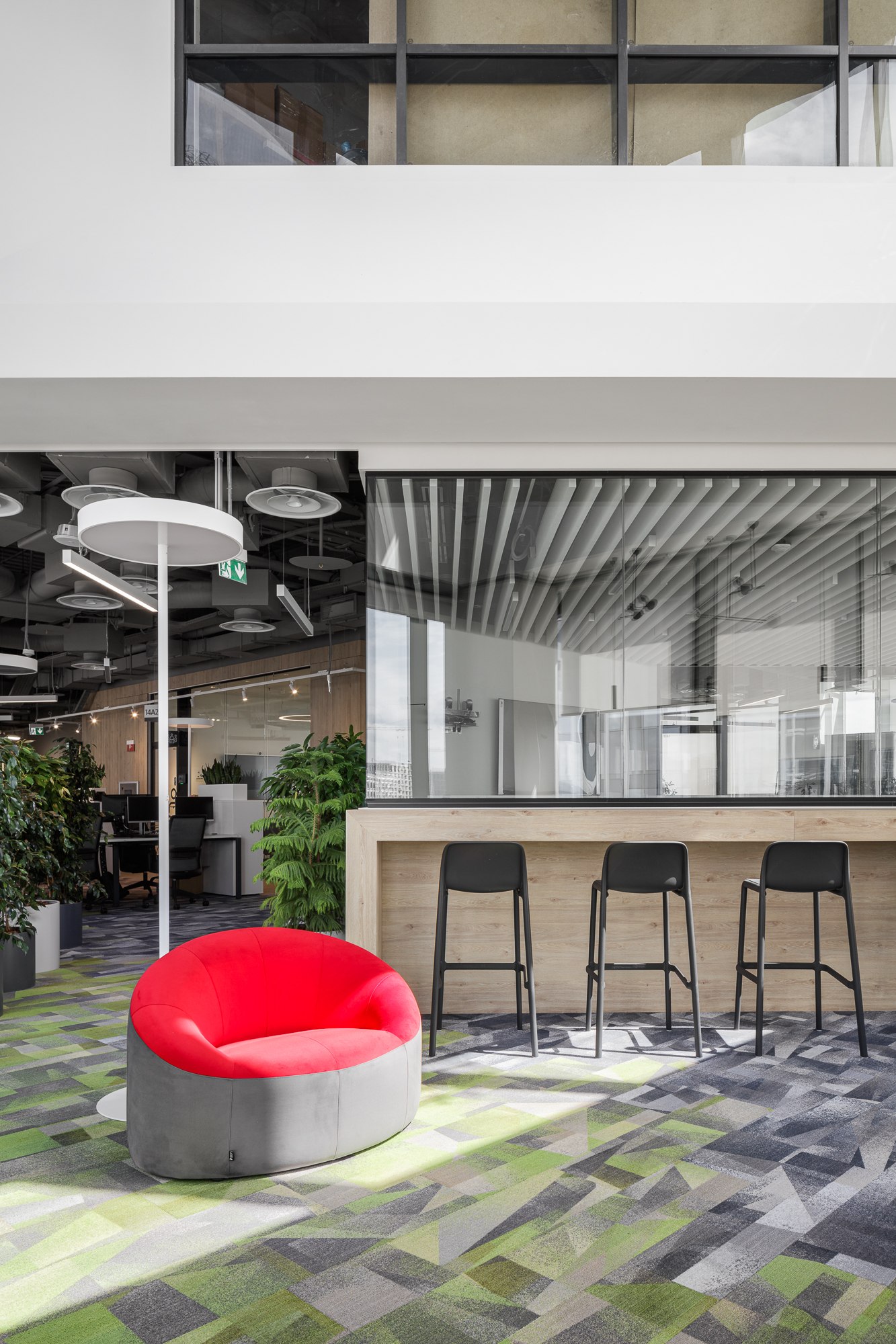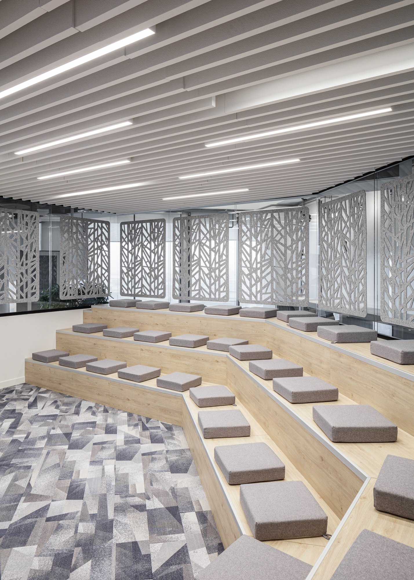 В интерьере офиса отразились ключевые ценности компании: новаторство, функциональность, внимание к деталям и забота о сотрудниках. Это выразилось в таких решениях, как продуманная эргономика, обширный фронт естественного освещения, комфортные санузлы, большое количество кофе-поинтов, помещения для индивидуальной работы разного размера, отделанные звукопоглощающим материалом, климат-контроль во всех помещениях. Особое внимание уделено акустическому комфорту и логике пространства. Например, представительские зоны и весь пятнадцатый этаж имеют специальное акустическое напыление за подвесным потолком.
