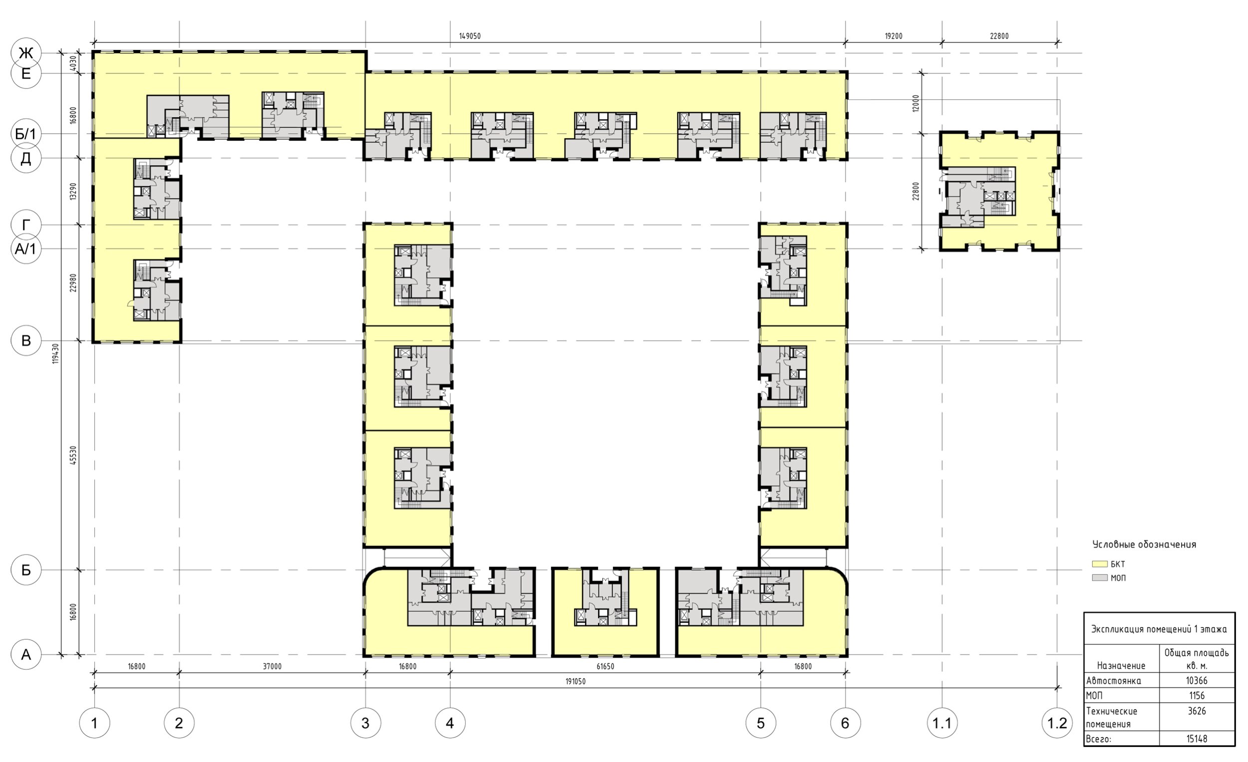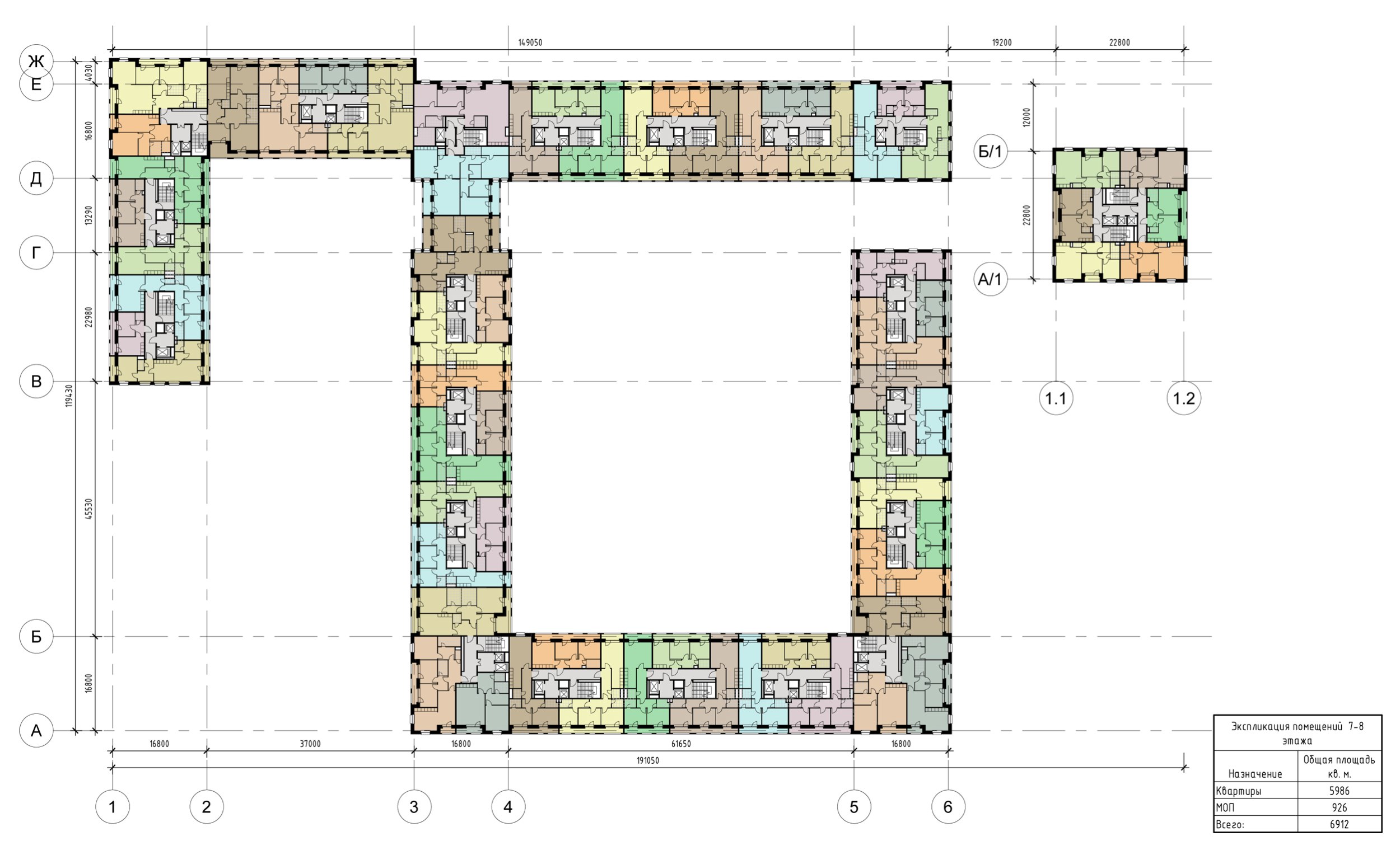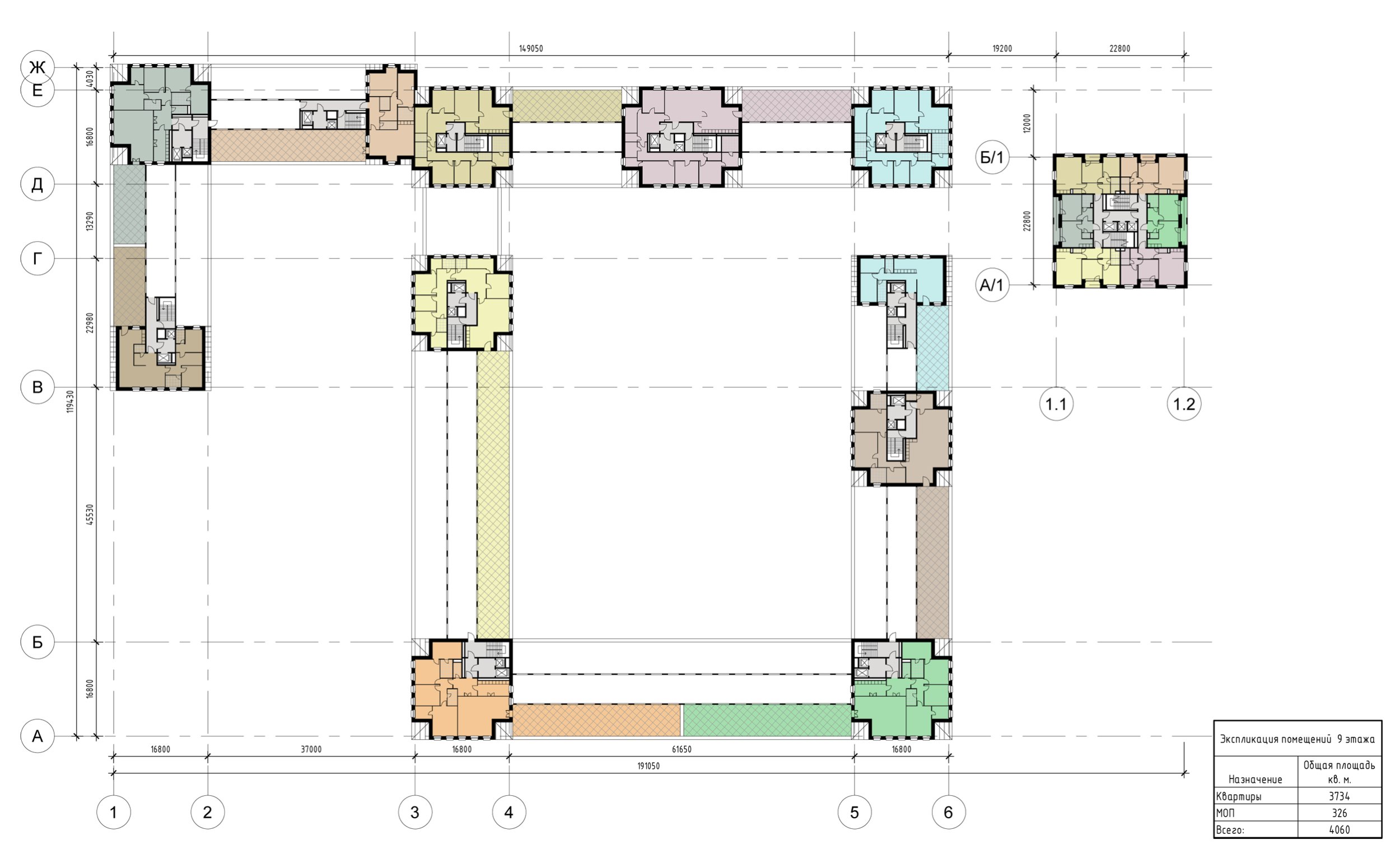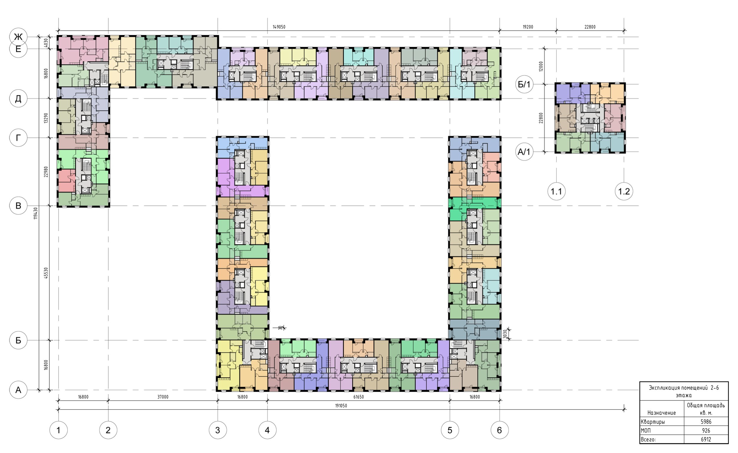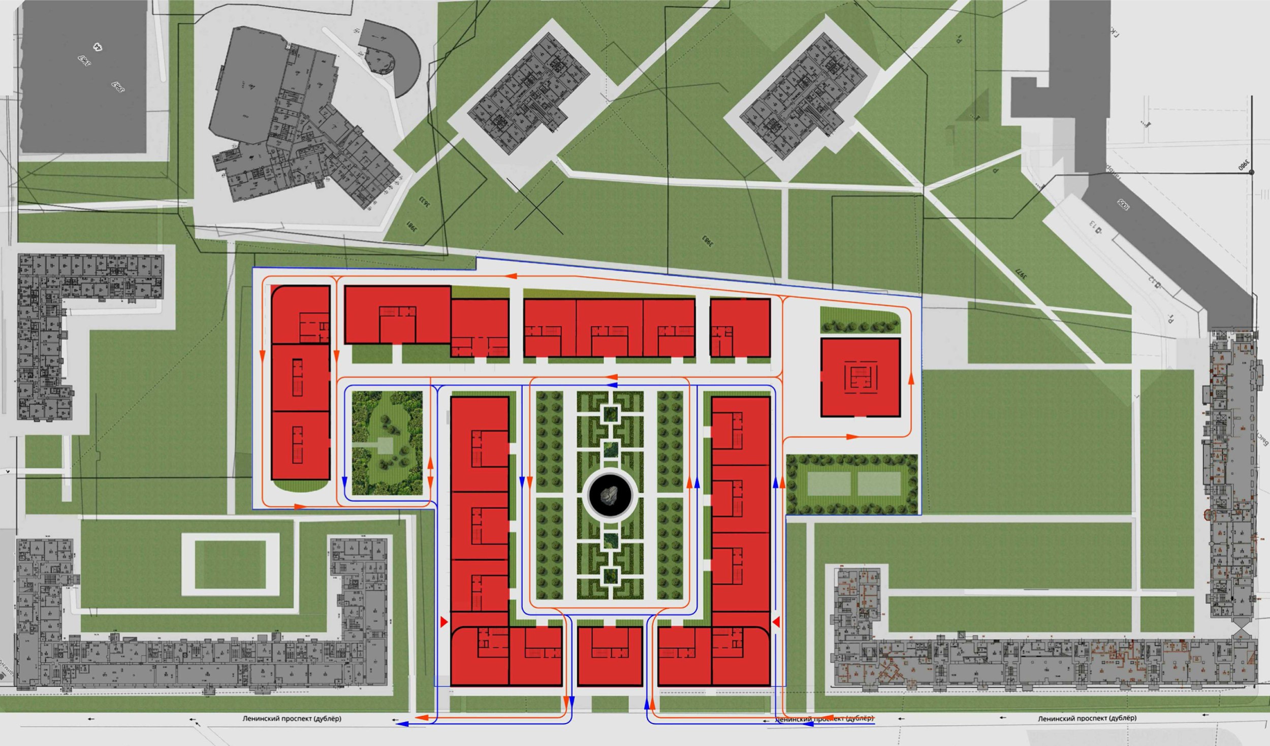 - 1-корпус – П-образный, протяженный, 8-9 этажный, 11-секционный, расположен по красной линии Ленинского проспекта.