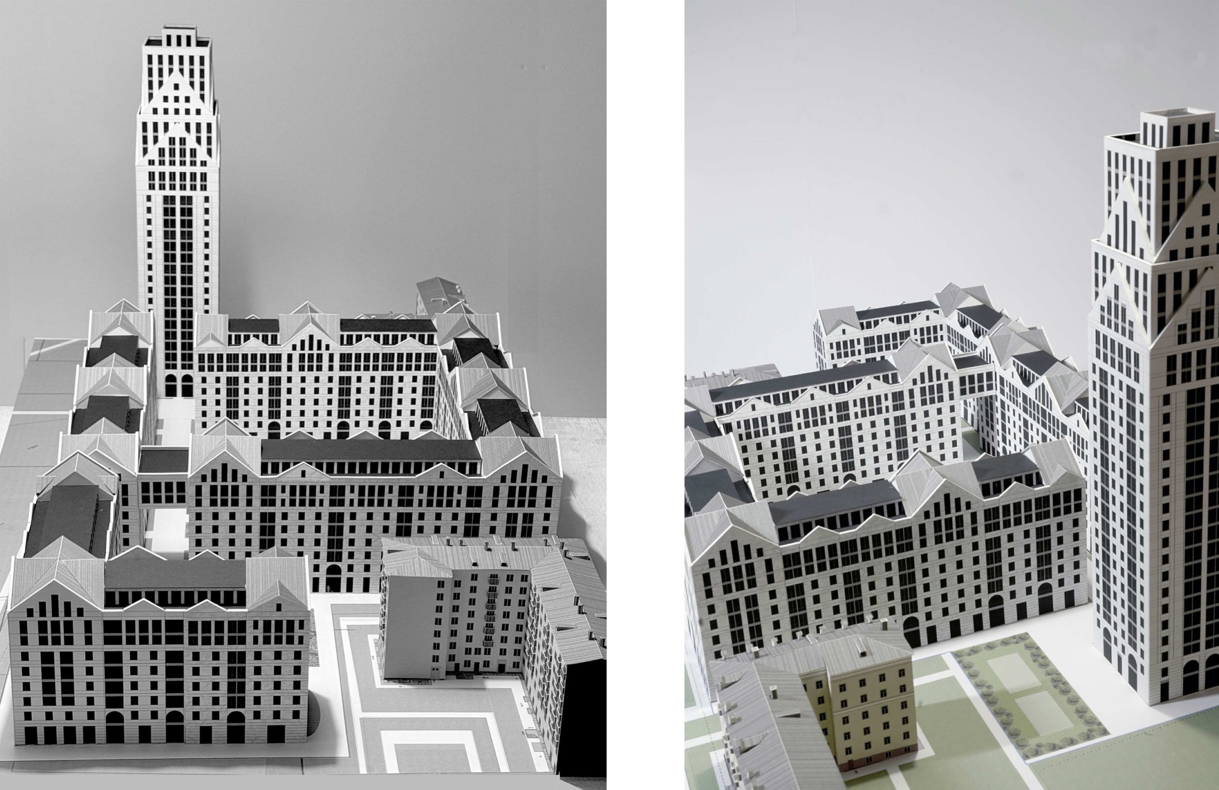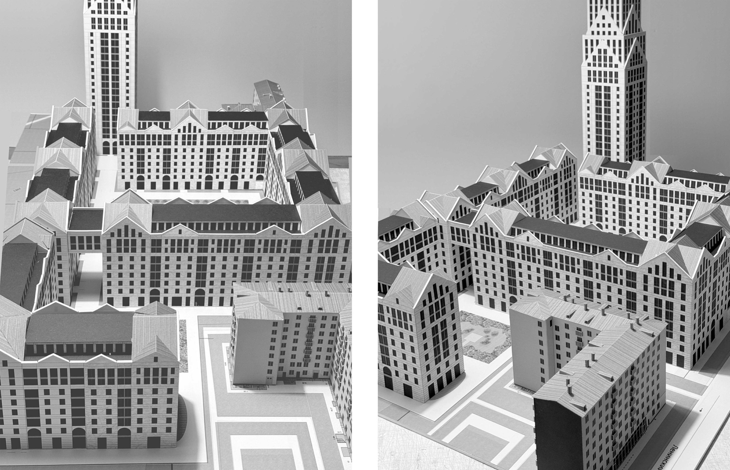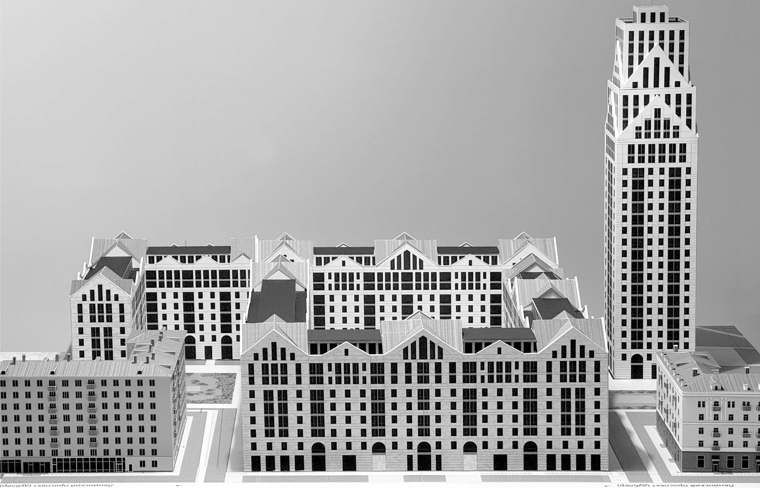 Также мы используем традиционный прием и вписываемся новыми зданиями в окружающую застройку, используя соседние дома в общей композиции всего квартала.