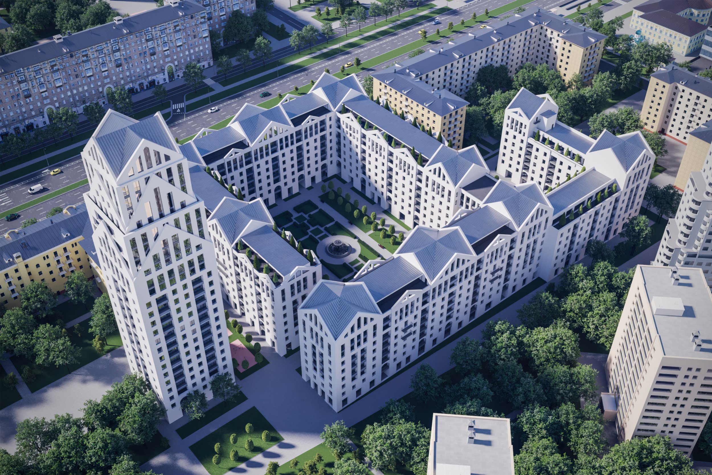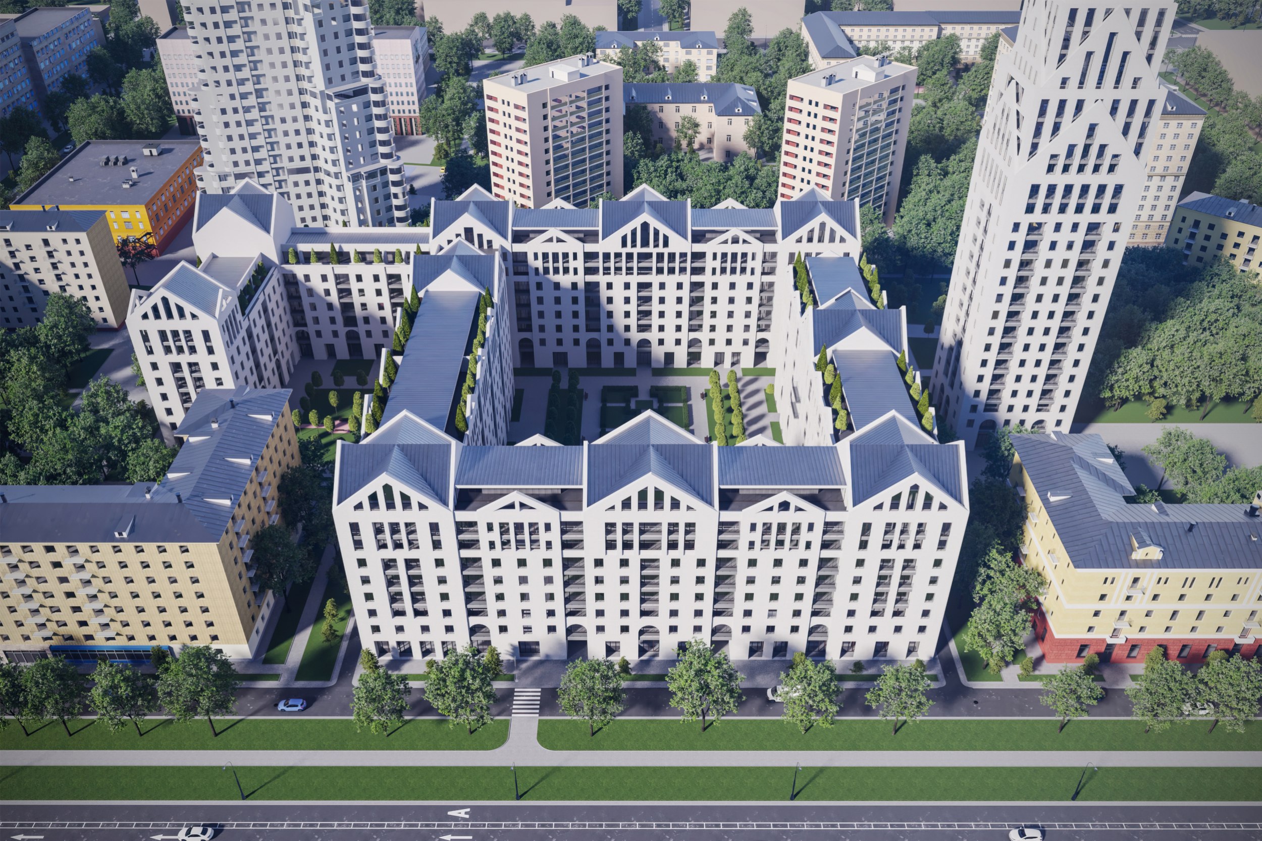 Используем классический ансамблевый прием, проектируя в едином архитектурном стиле всю новую застройку. Фасады домов масштабны к человеку с тщательно прорисованными деталями. Двор – как внутренняя площадь с зелеными партерами, газонами и клумбами. В композицию входит и Башня – многоэтажный жилой дом. Есть своя улица, соединяющая все части единого ансамбля.
