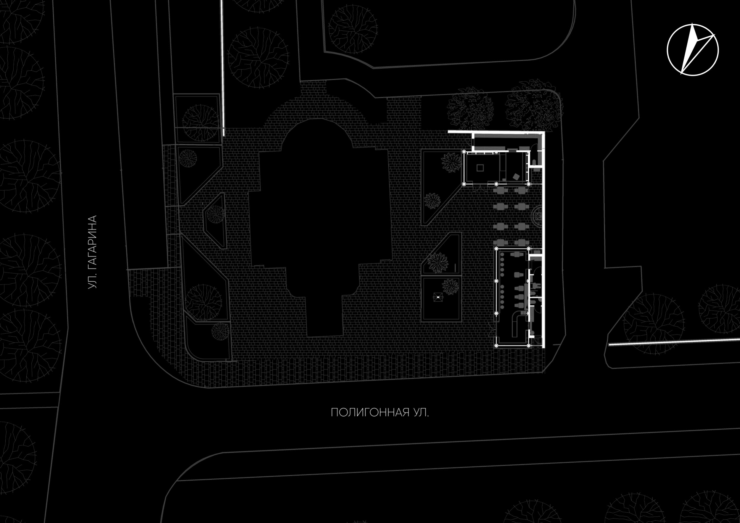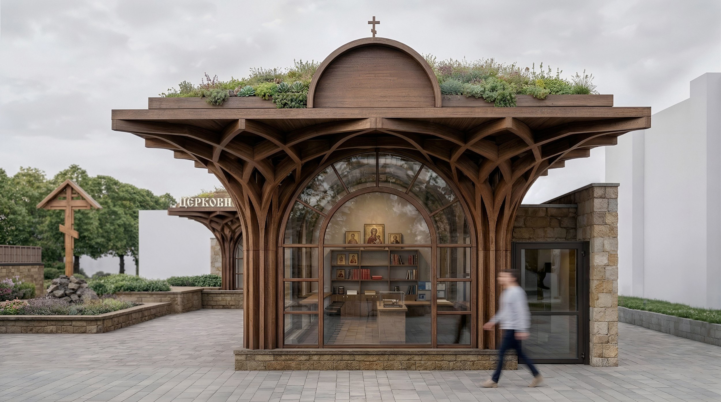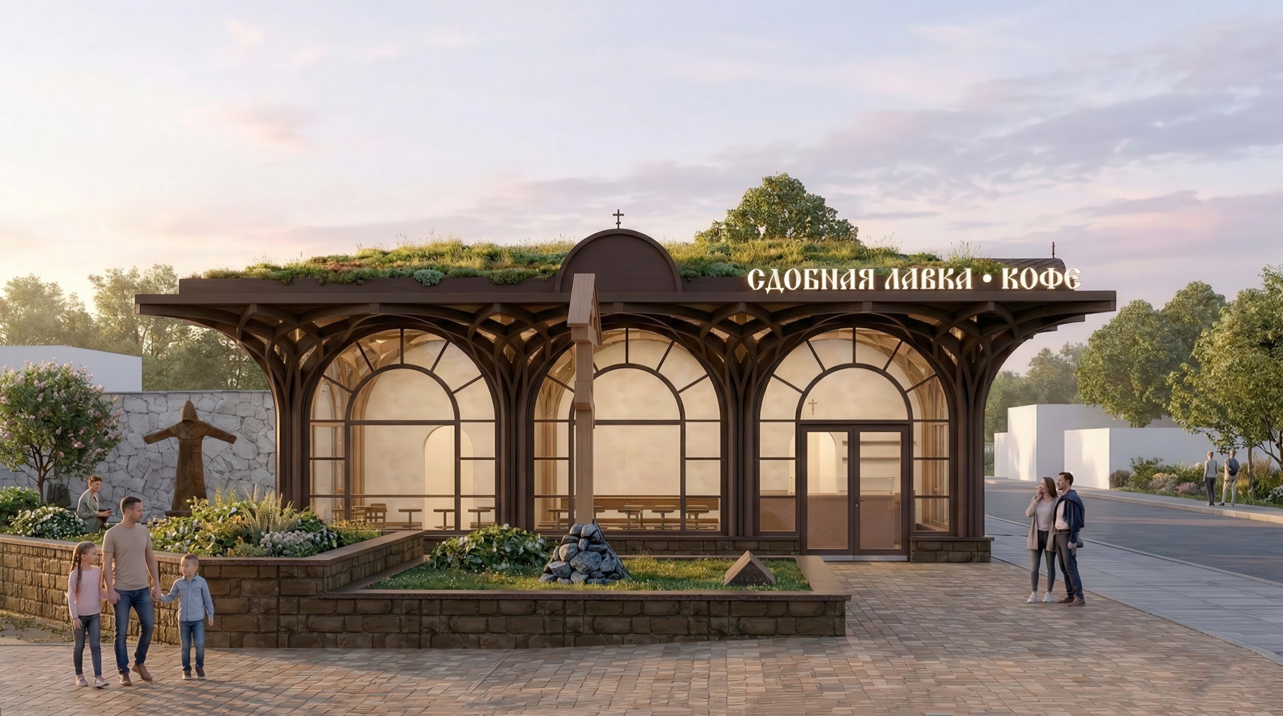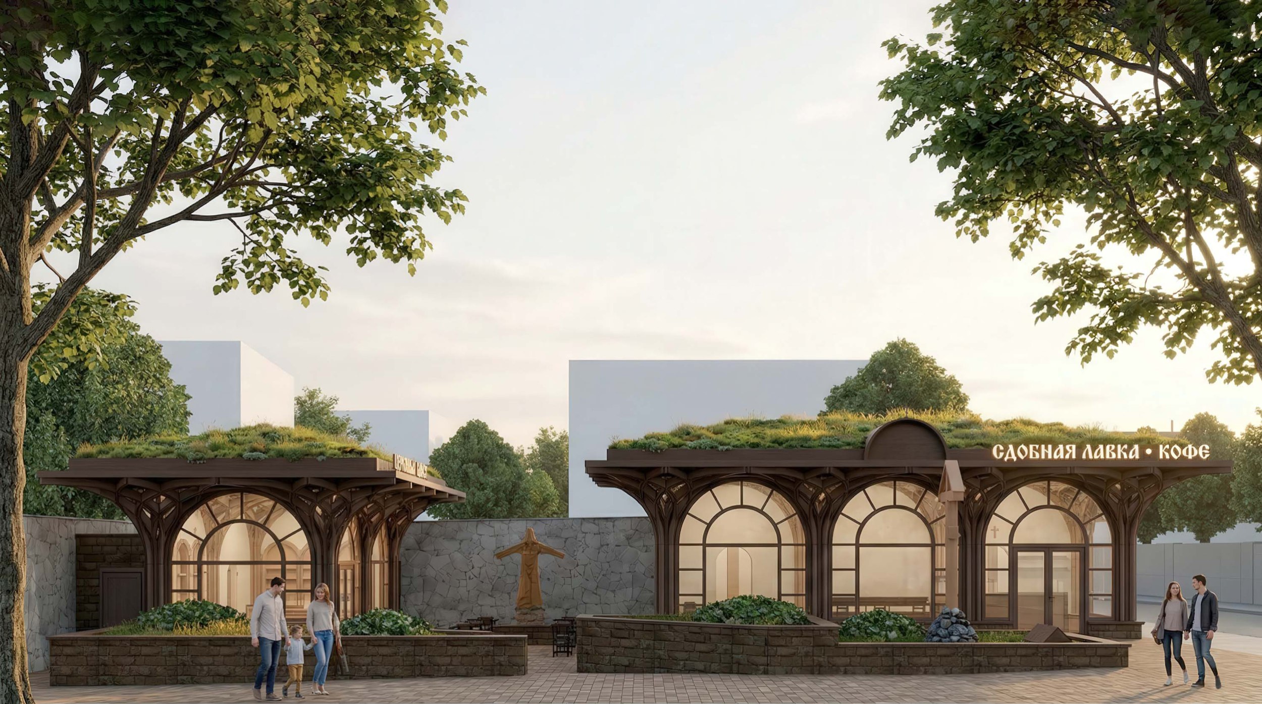 Новые здания церковной лавки и сдобной лавки с функцией кафе деликатно вписываются в существующий ансамбль. Каменный собор остается безусловной доминантой, в то время как распластанные по горизонтали павильоны формируют визуальный стилобат – живое зеленое подножие. Ритмика деревянных фасадных арок аккуратно цитирует силуэт закомар главного храма.