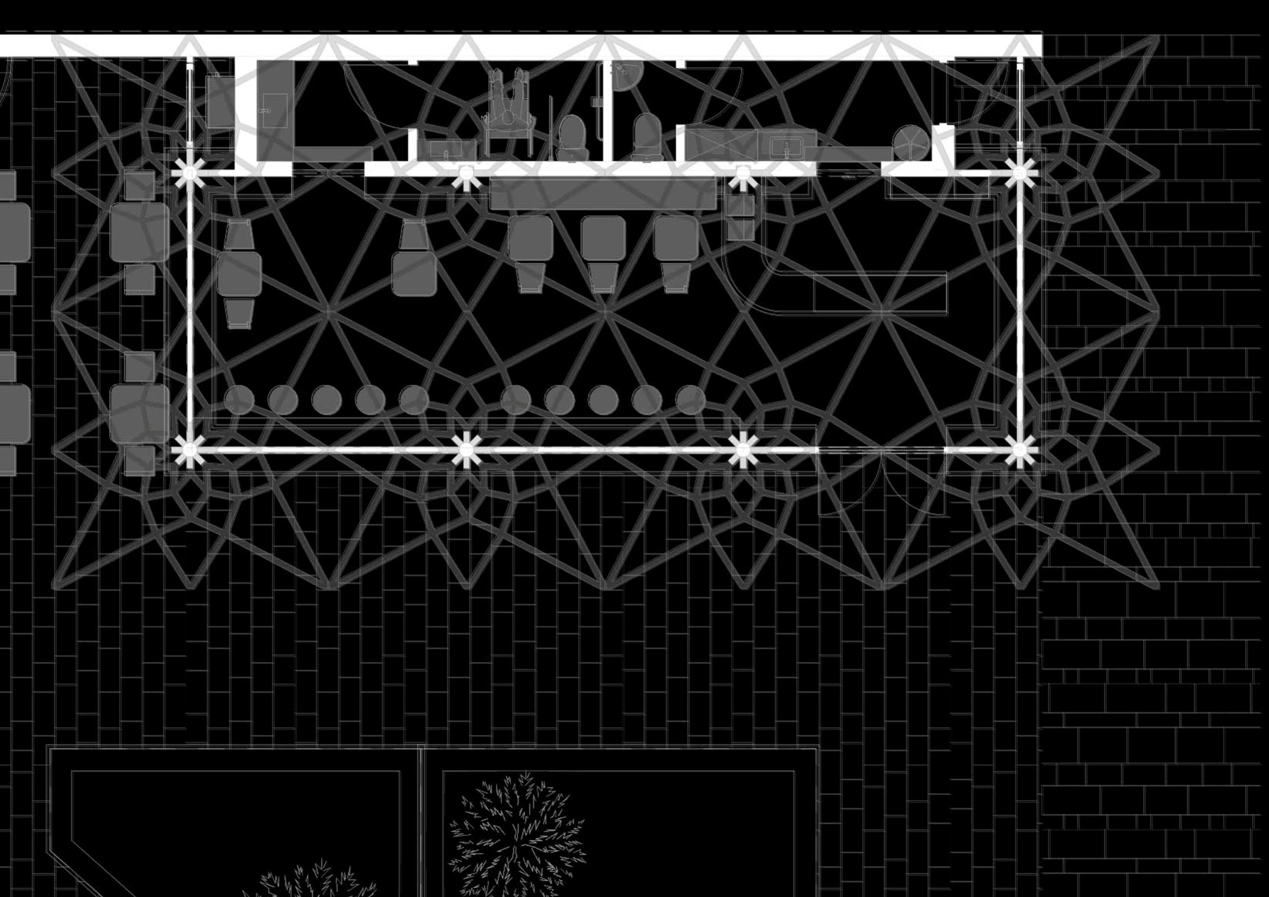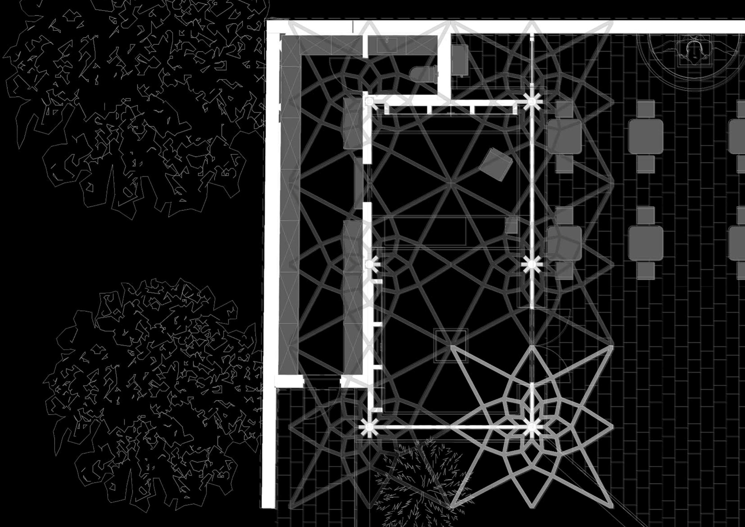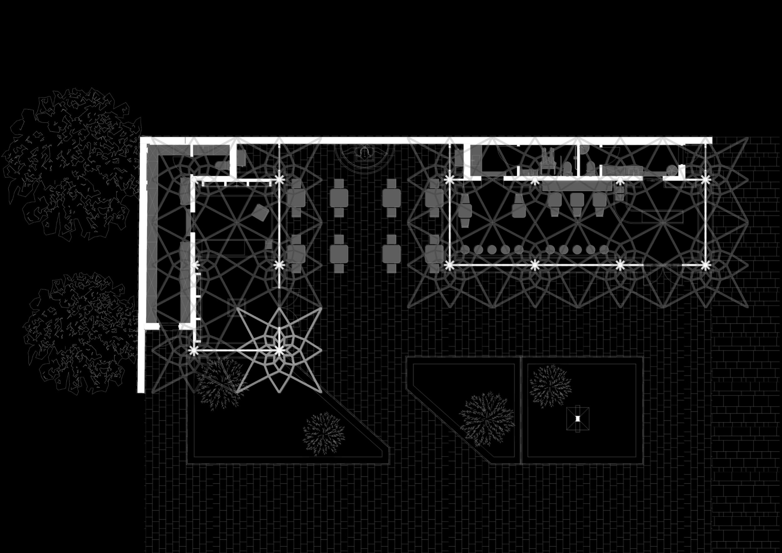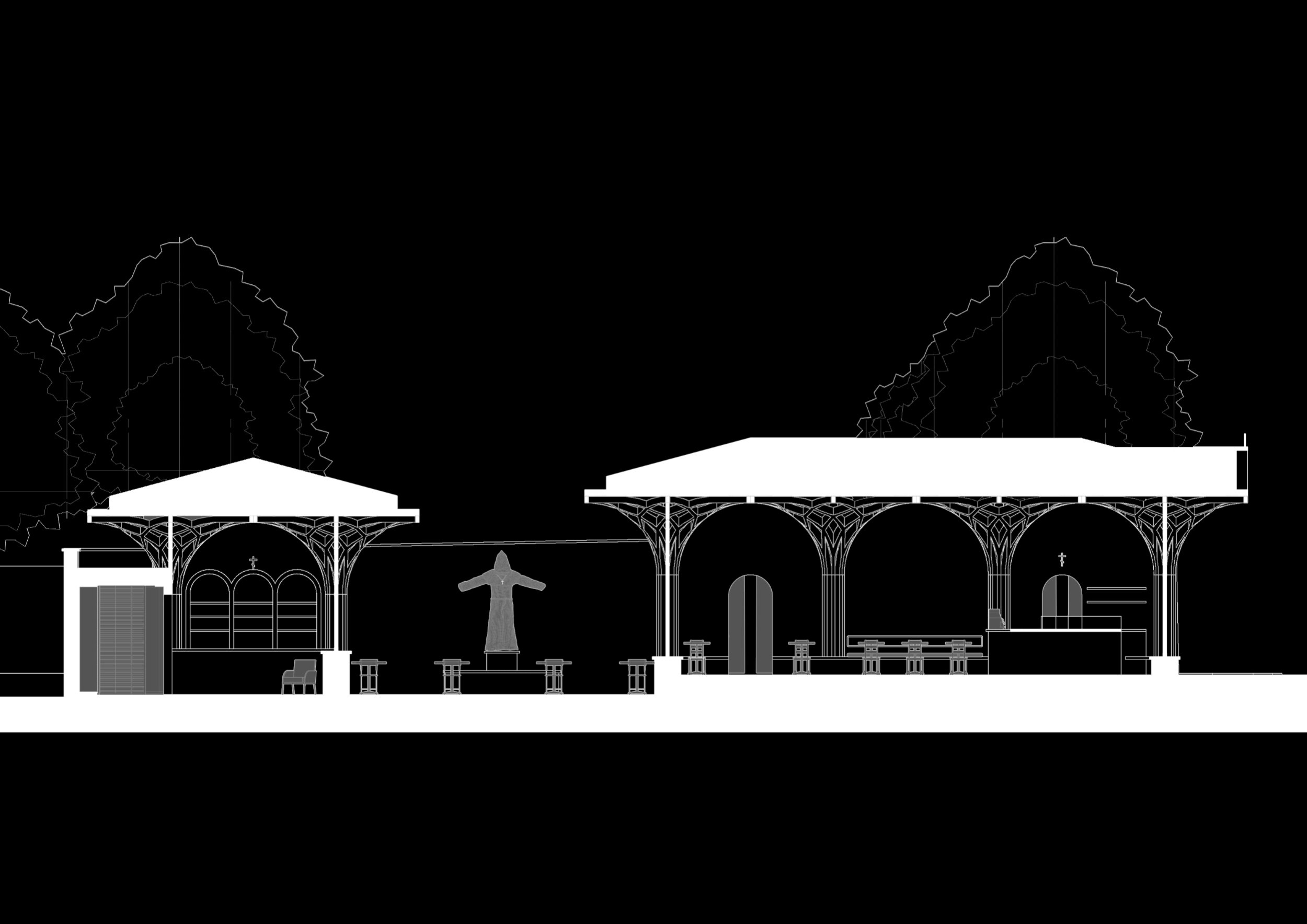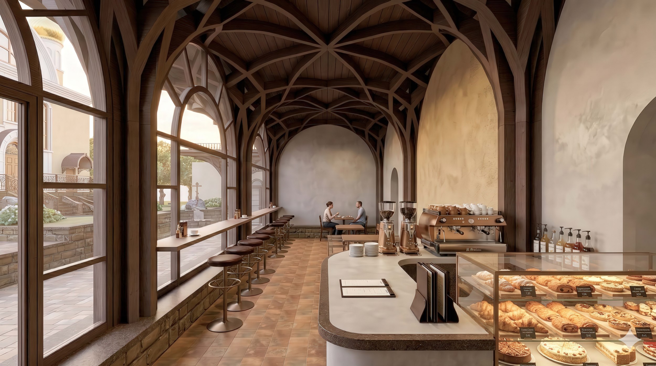 В основе тектоники павильонов – несущие конструкции из клееного бруса, которые раскрываются к сводам, подобно кронам деревьев. Пространственная геометрия скрывает глубокий сакральный смысл: в плане переплетение деревянных балок каркаса образует восьмиконечную Вифлеемскую звезду. Дерево задает максимально теплую, «терапевтичную» тактильность интерьеру, а панорамное остекление стирает границу между внутренним пространством и площадью. Глубокие выносы кровли создают всесезонные террасы.