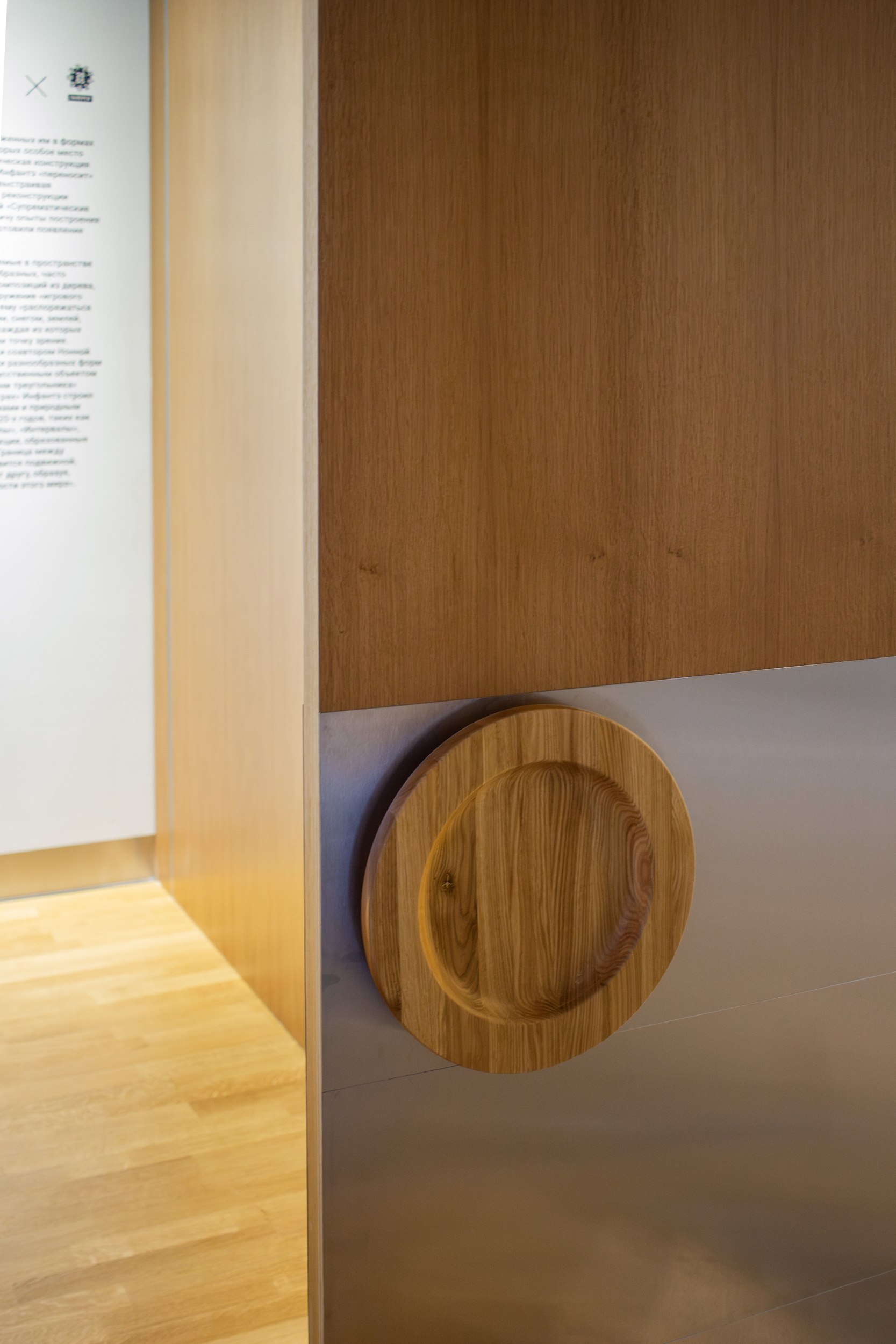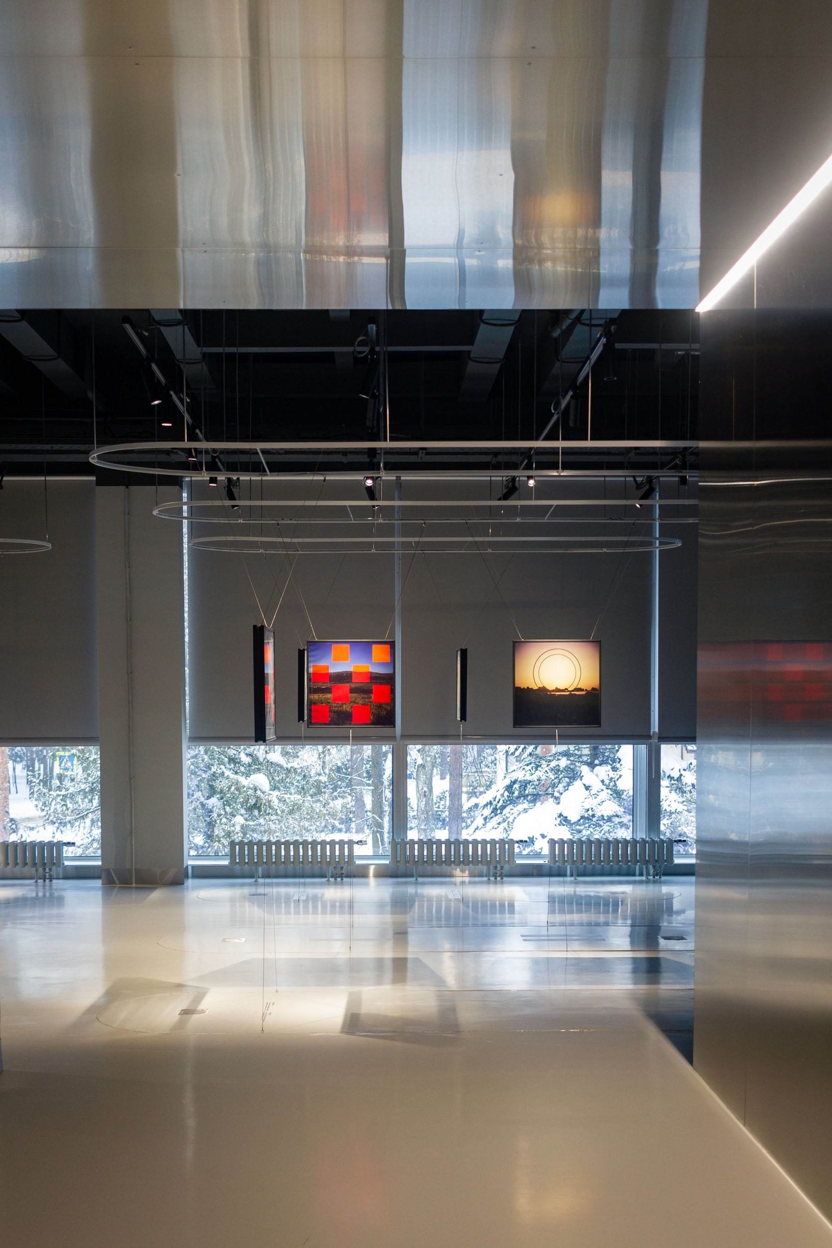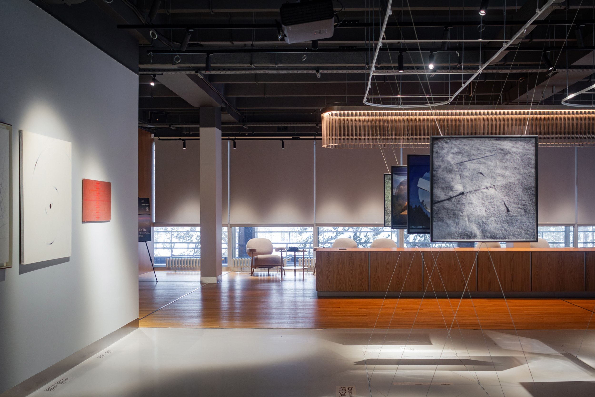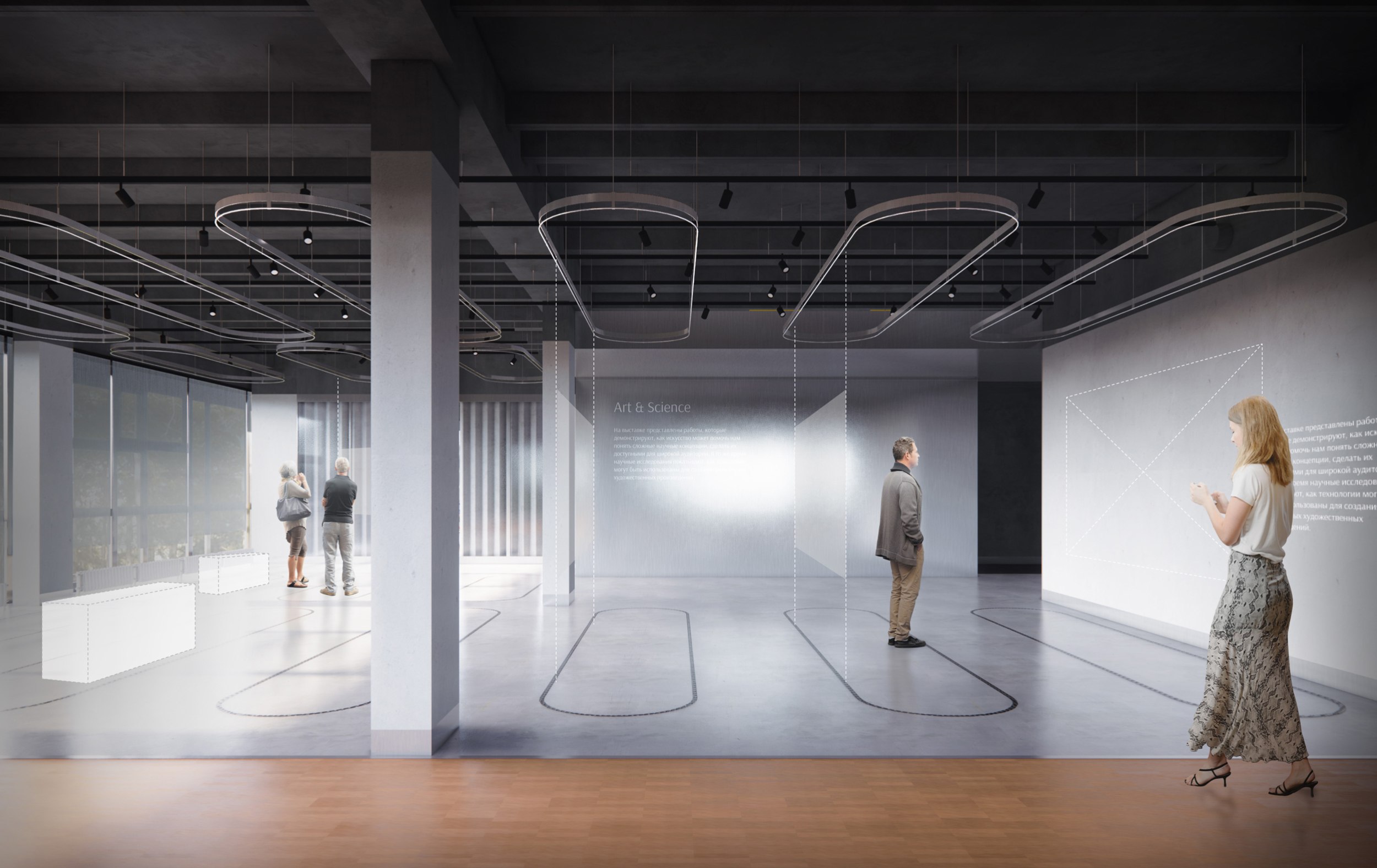 Проект бережно сохраняет наследие позднего советского модернизма. Панорамное остекление – главная архитектурная ценность – проходит через все залы, сохраняя визуальную связь с городом. Контраст используемых теплых и холодных материалов делит пространство на функциональные и смысловые зоны. Узнаваемый элемент интерьера – эллиптическая выставочная система из подвесных и напольных рельс индивидуального изготовления, вдохновленная деталями и линиями ускорительной установки. Она позволяет адаптировать галерею под разные форматы и масштабы экспозиции.