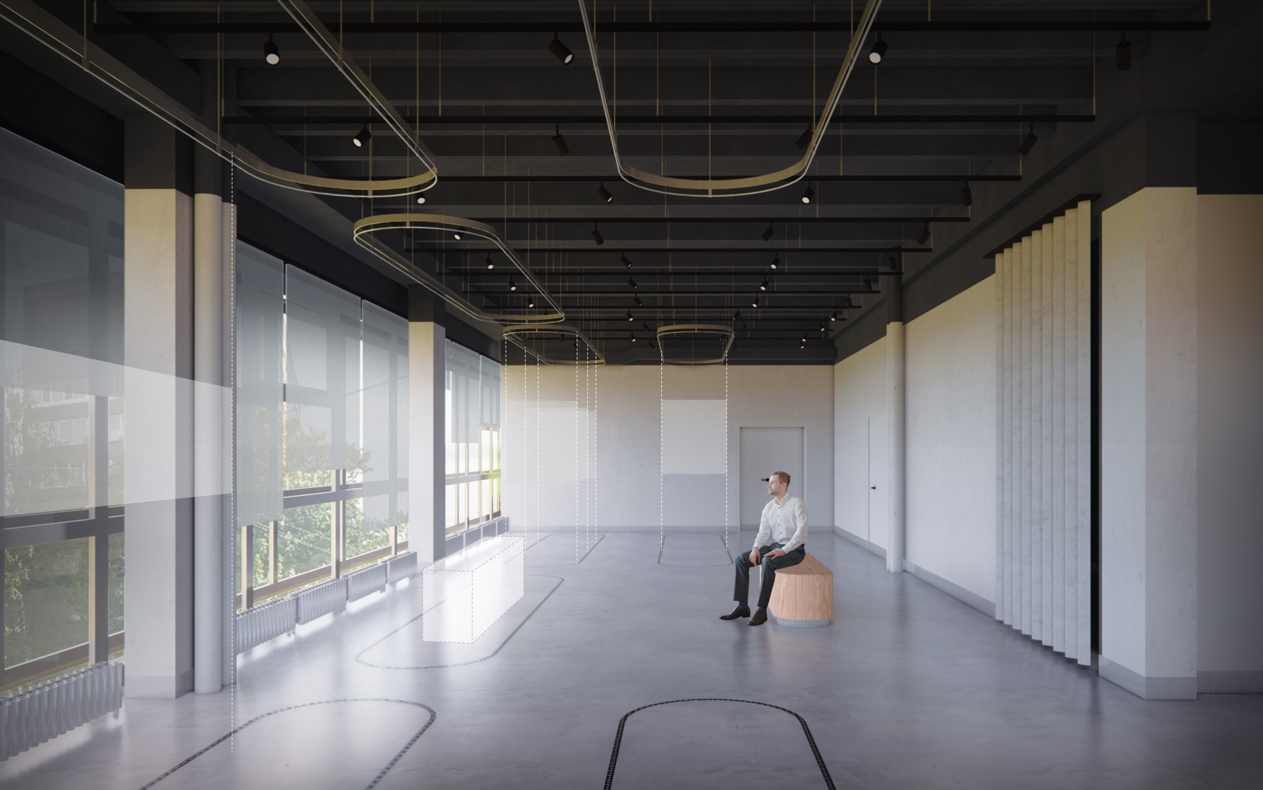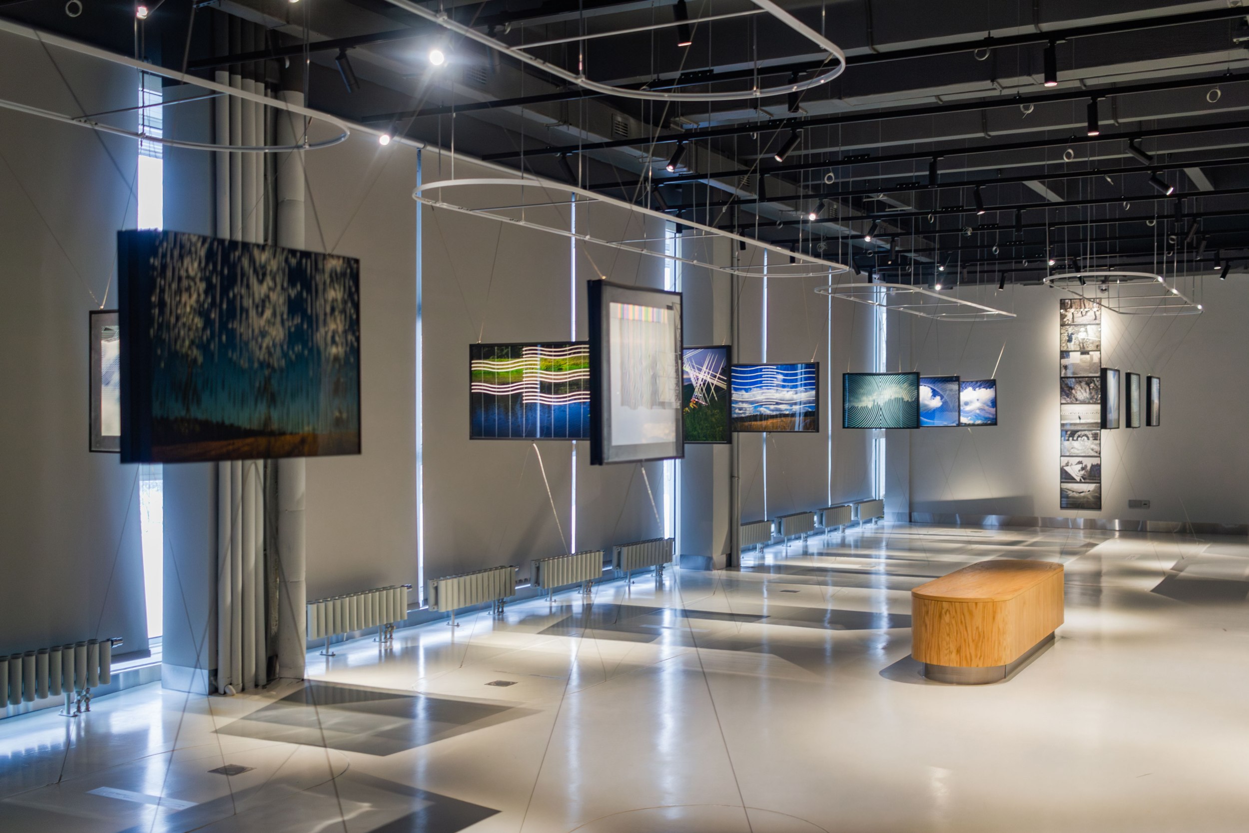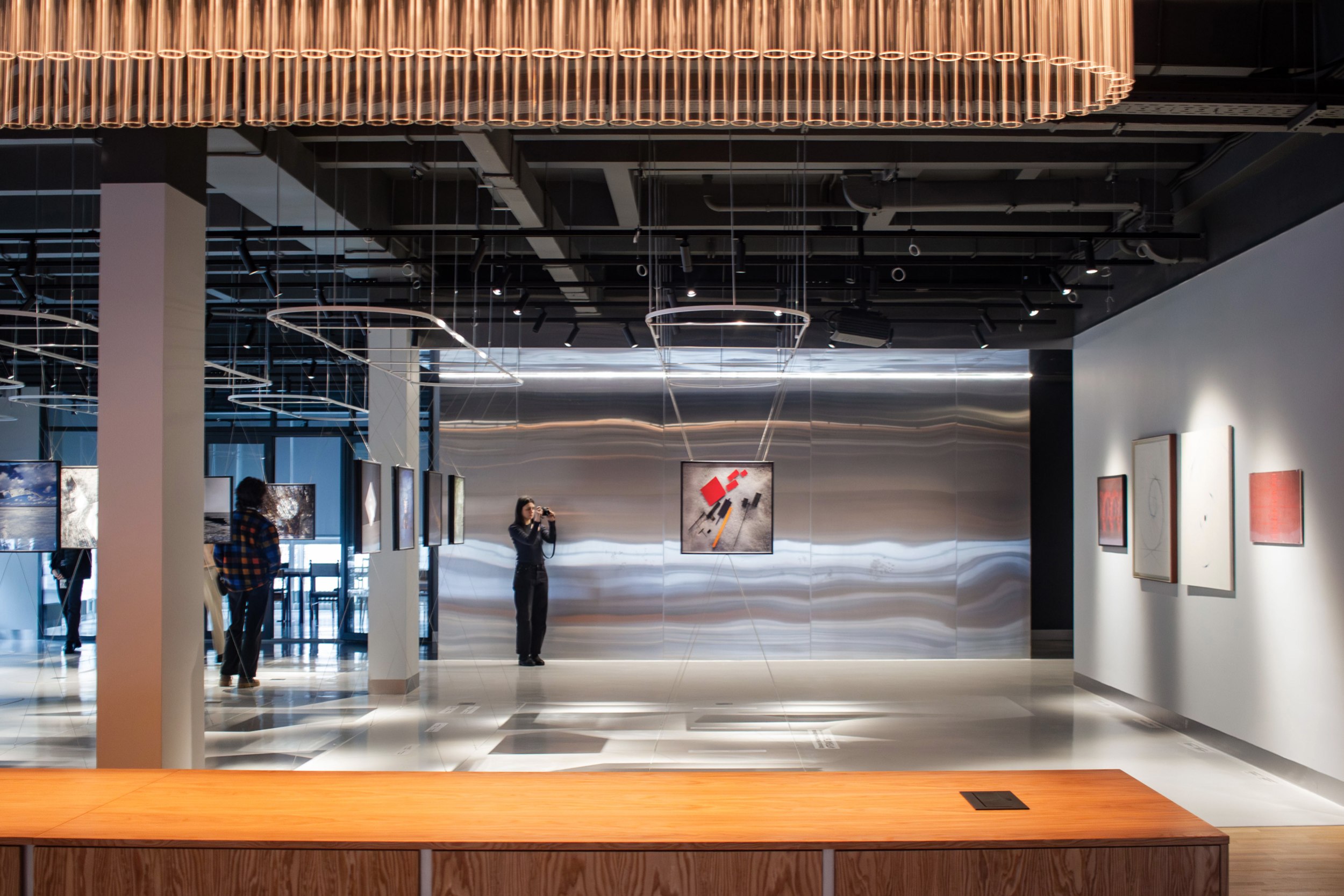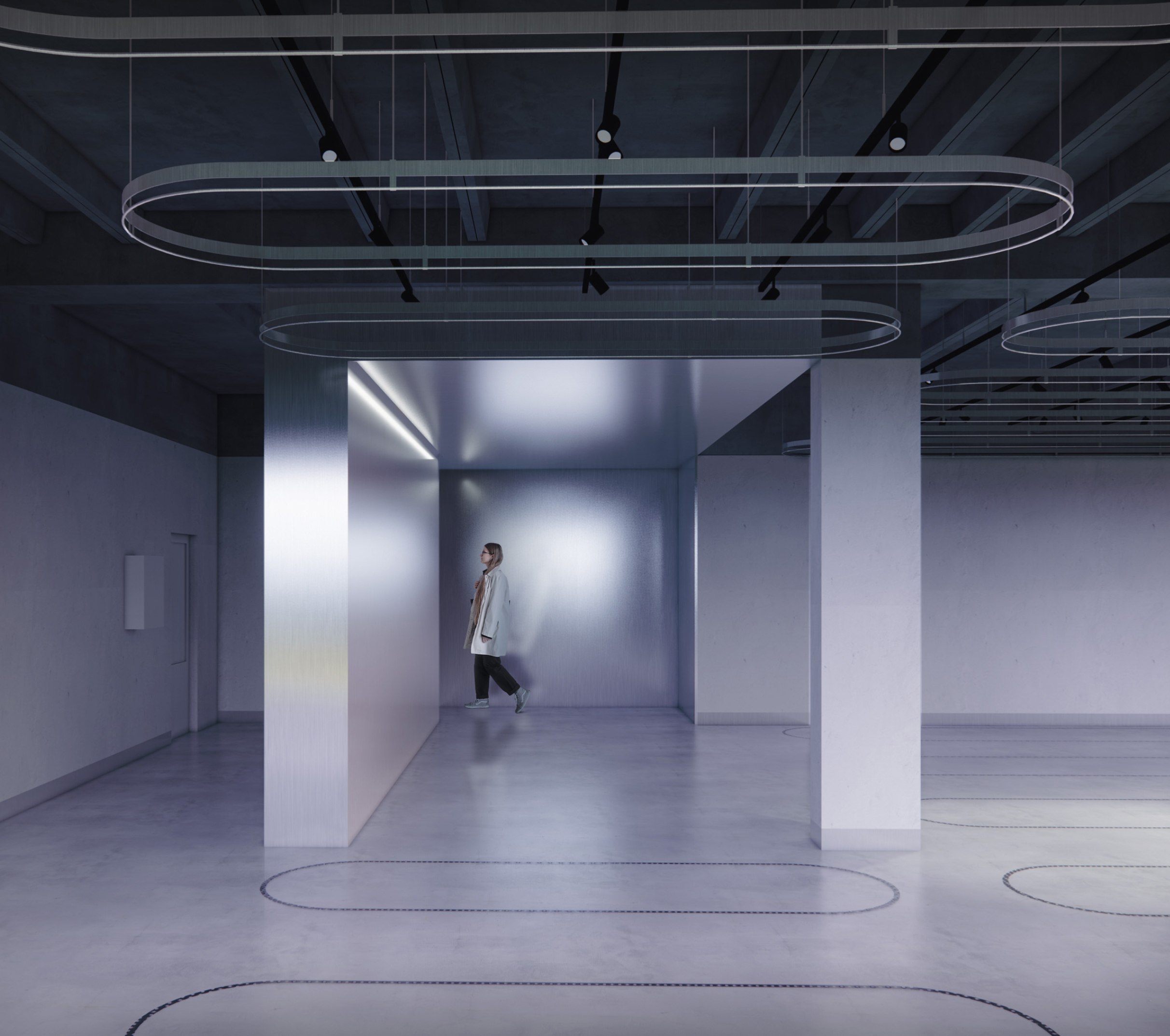 Проект бережно сохраняет наследие позднего советского модернизма. Панорамное остекление – главная архитектурная ценность – проходит через все залы, сохраняя визуальную связь с городом. Контраст используемых теплых и холодных материалов делит пространство на функциональные и смысловые зоны. Узнаваемый элемент интерьера – эллиптическая выставочная система из подвесных и напольных рельс индивидуального изготовления, вдохновленная деталями и линиями ускорительной установки. Она позволяет адаптировать галерею под разные форматы и масштабы экспозиции.