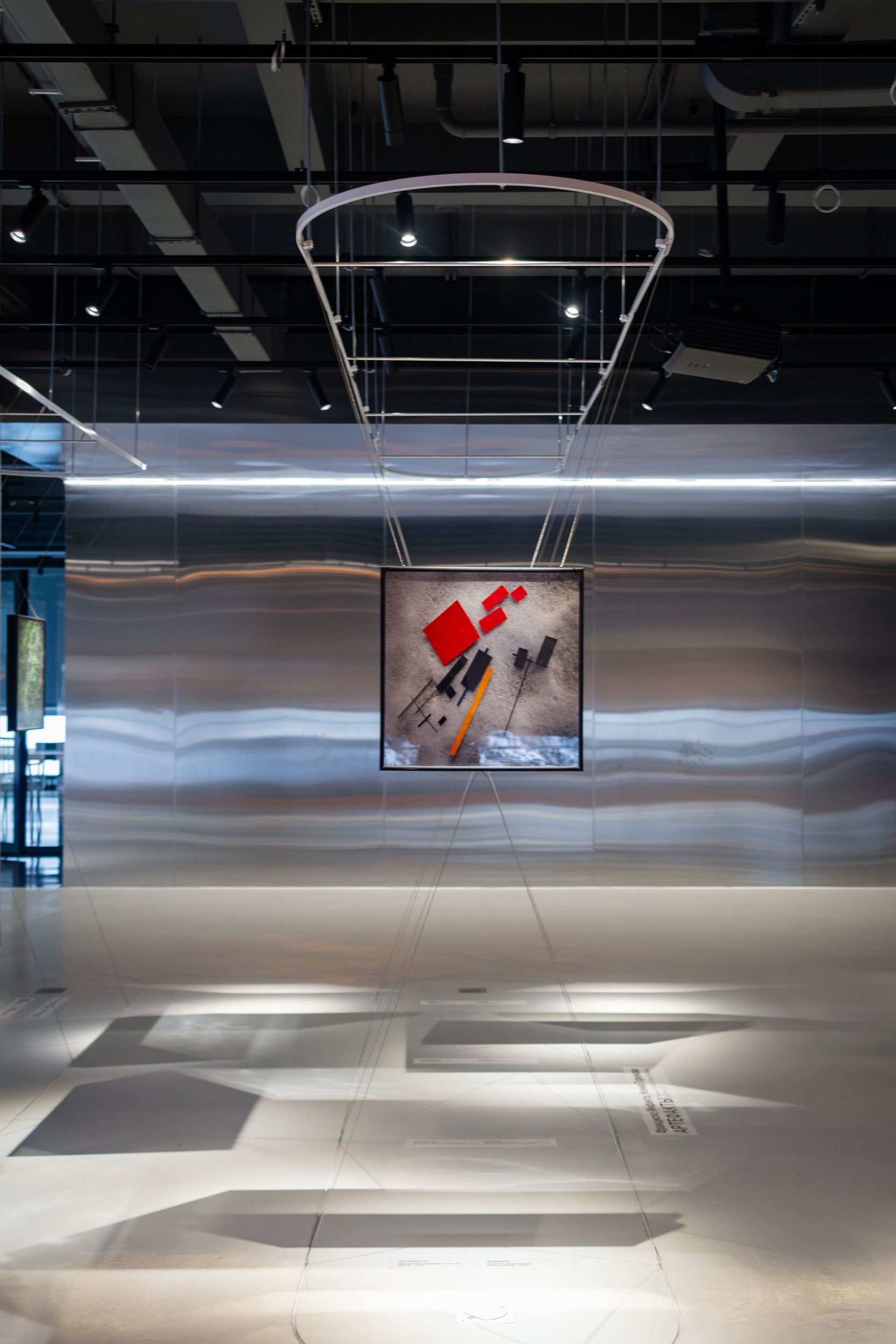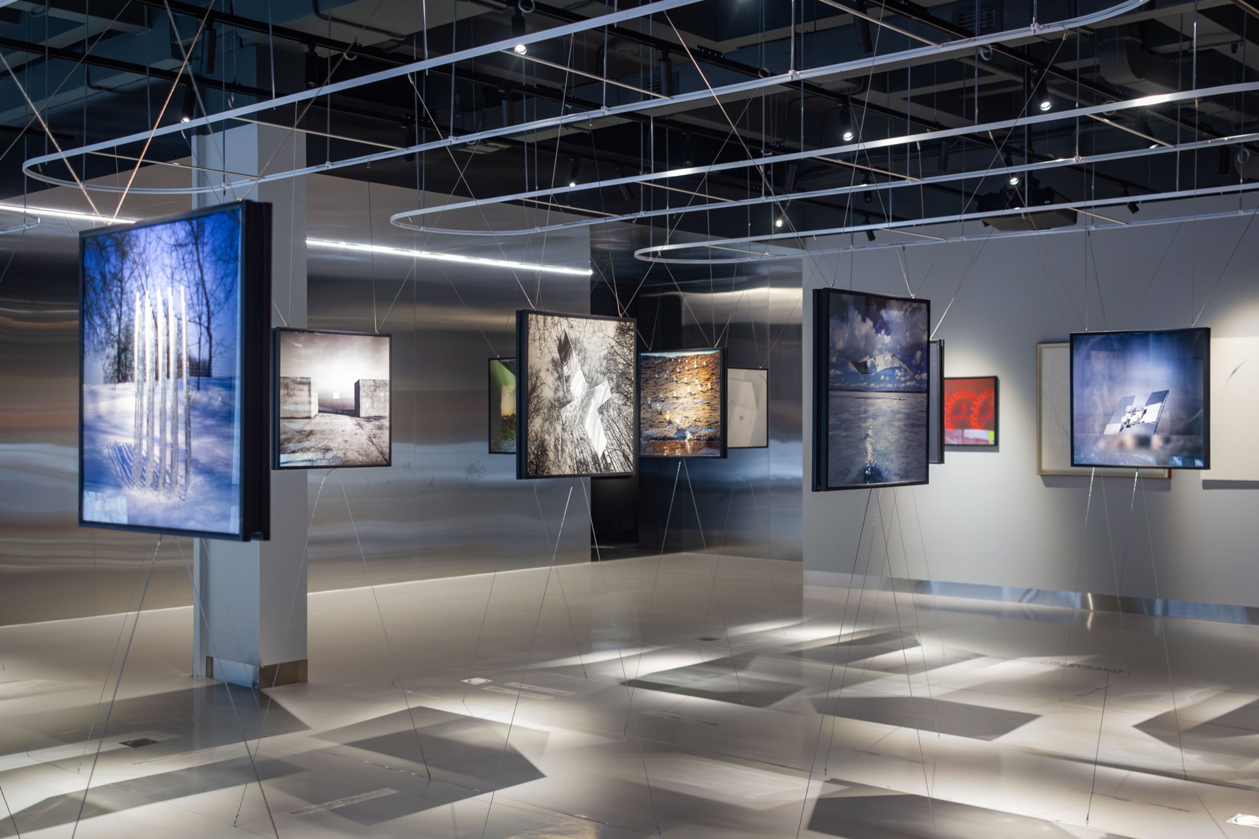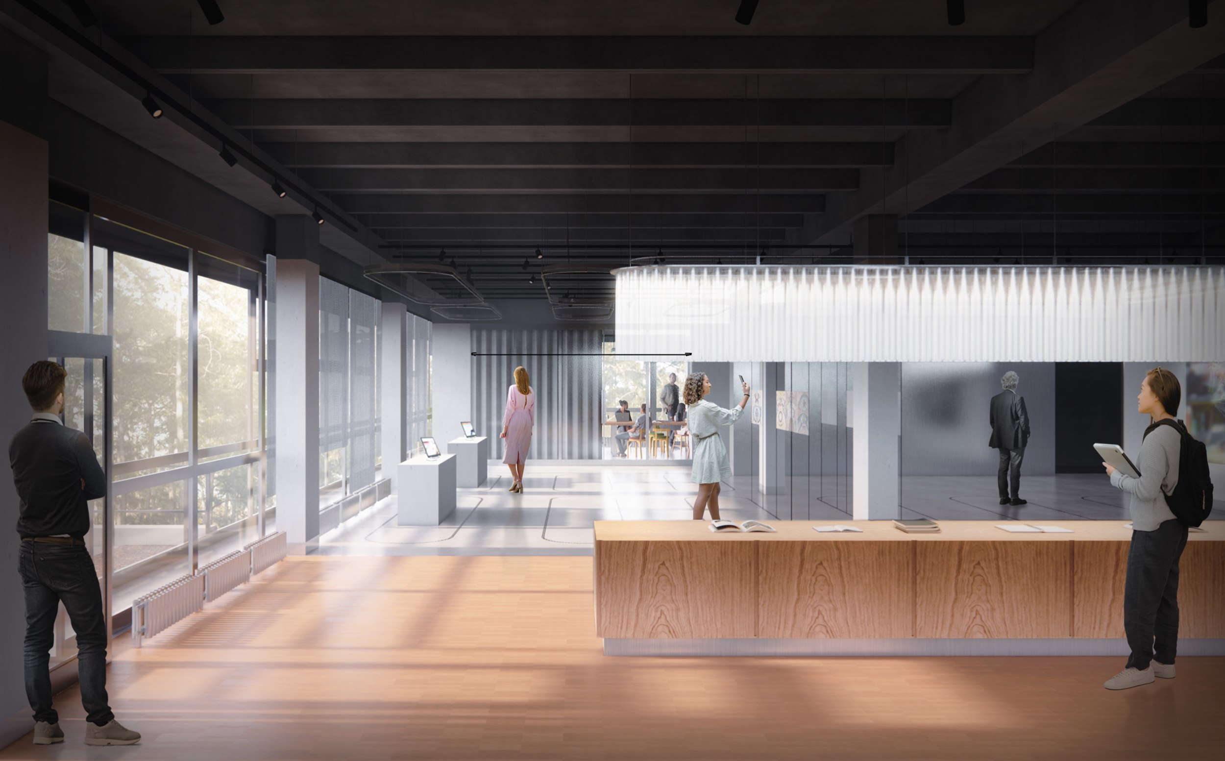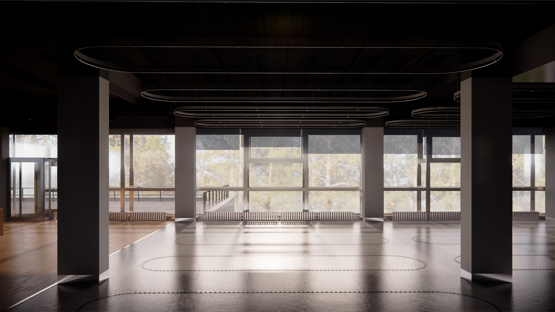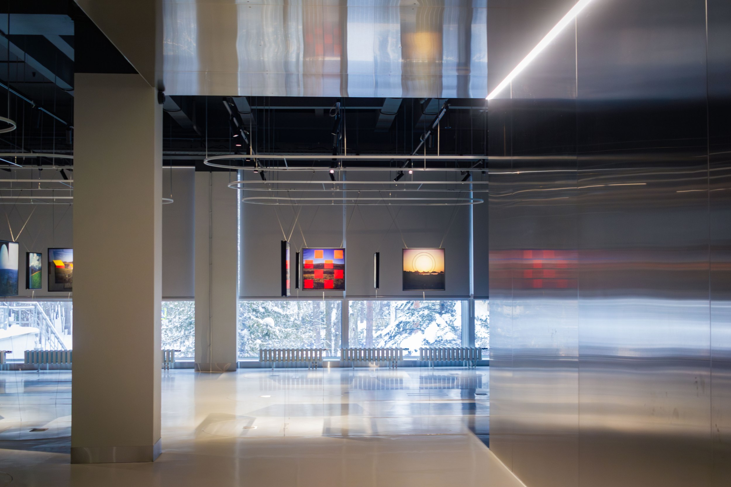 Проект бережно сохраняет наследие позднего советского модернизма. Панорамное остекление – главная архитектурная ценность – проходит через все залы, сохраняя визуальную связь с городом. Контраст используемых теплых и холодных материалов делит пространство на функциональные и смысловые зоны. Узнаваемый элемент интерьера – эллиптическая выставочная система из подвесных и напольных рельс индивидуального изготовления, вдохновленная деталями и линиями ускорительной установки. Она позволяет адаптировать галерею под разные форматы и масштабы экспозиции.
