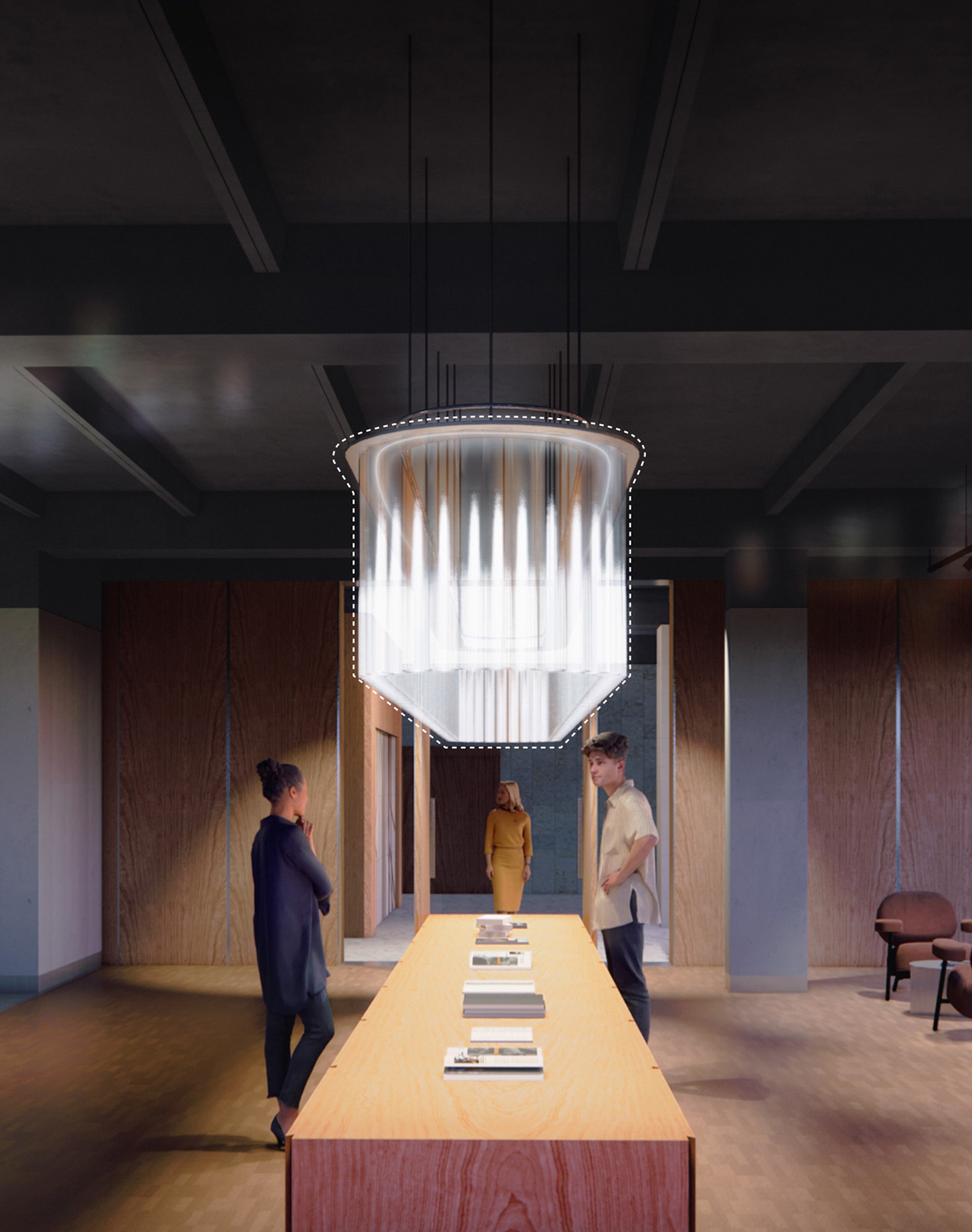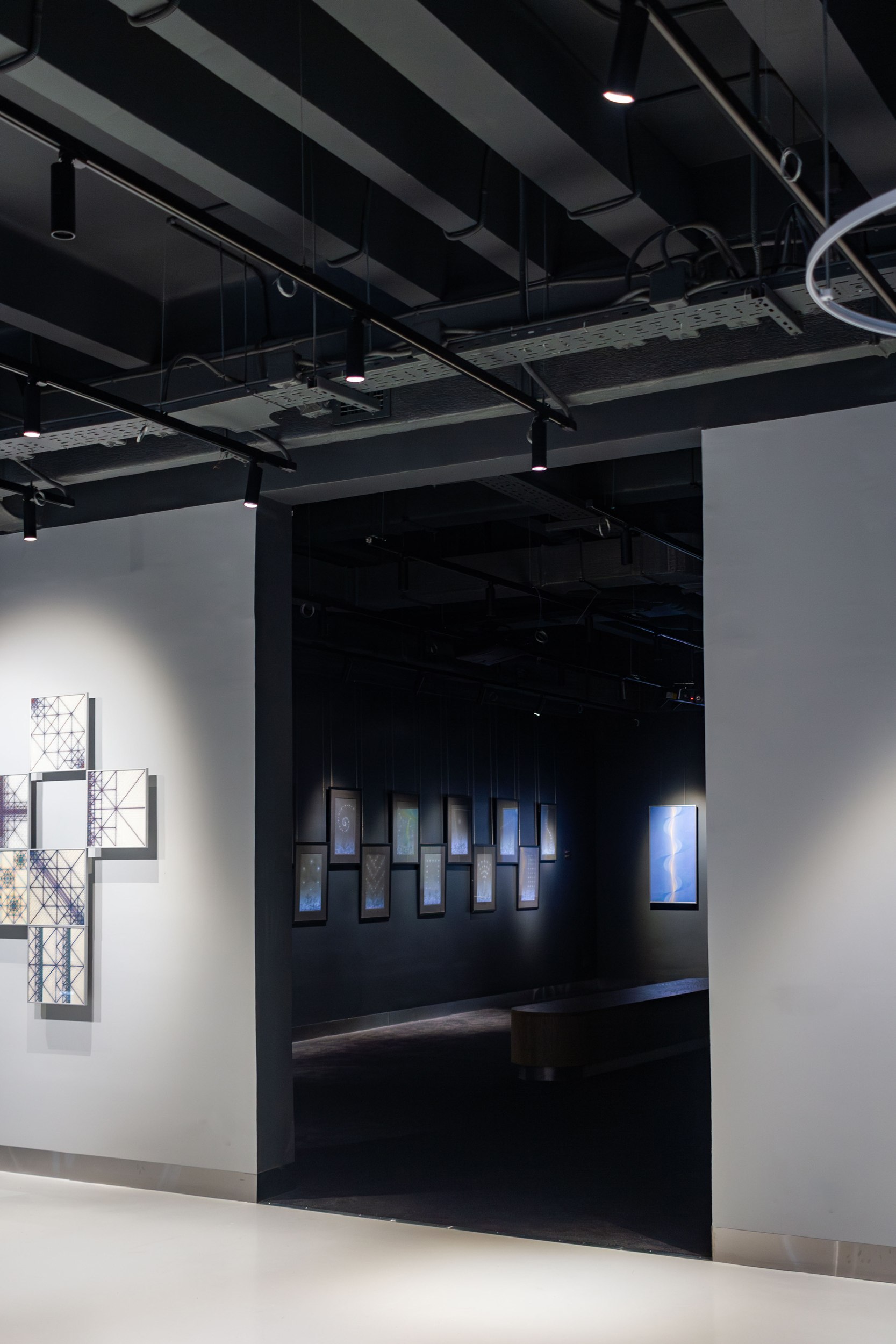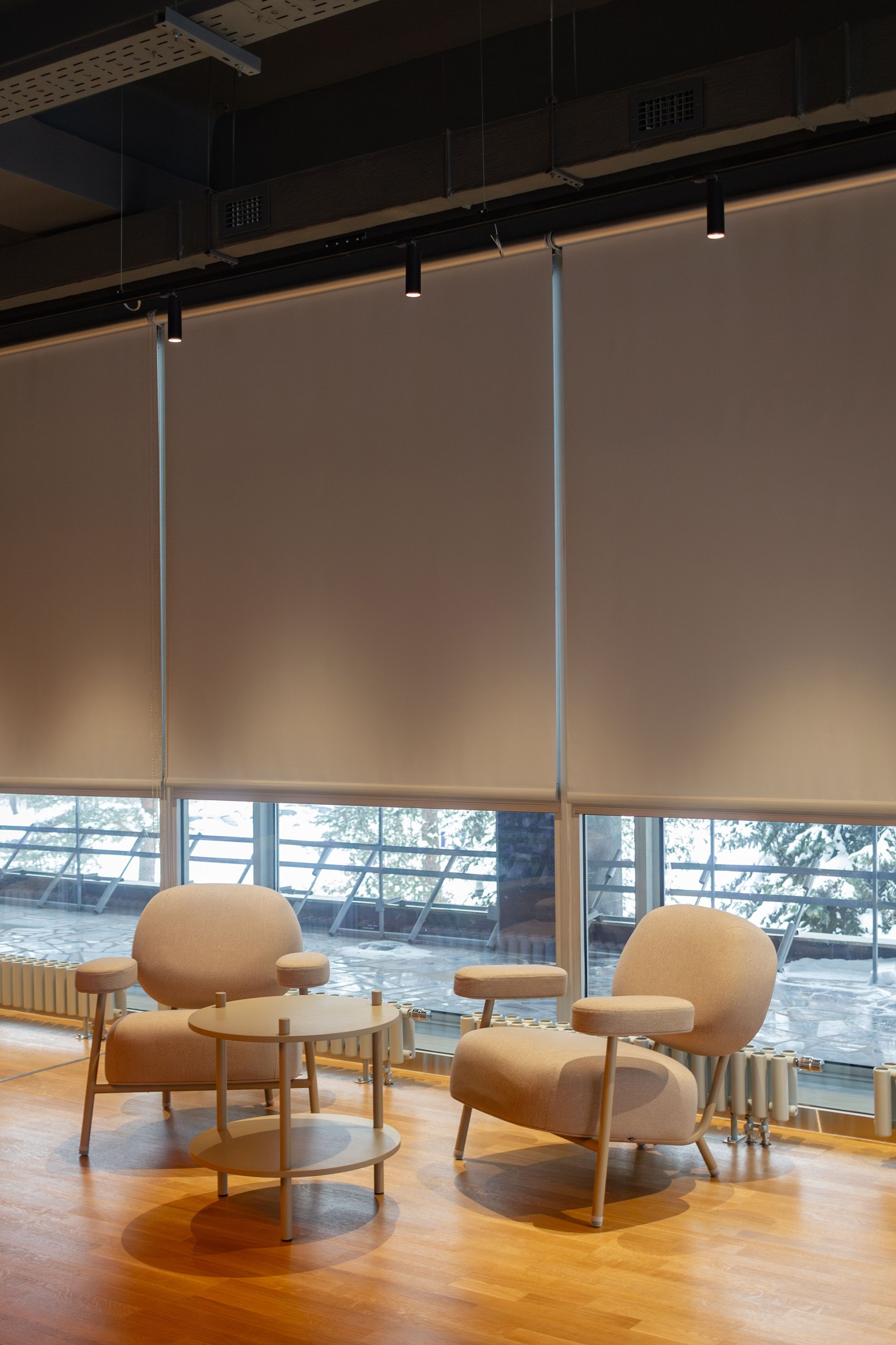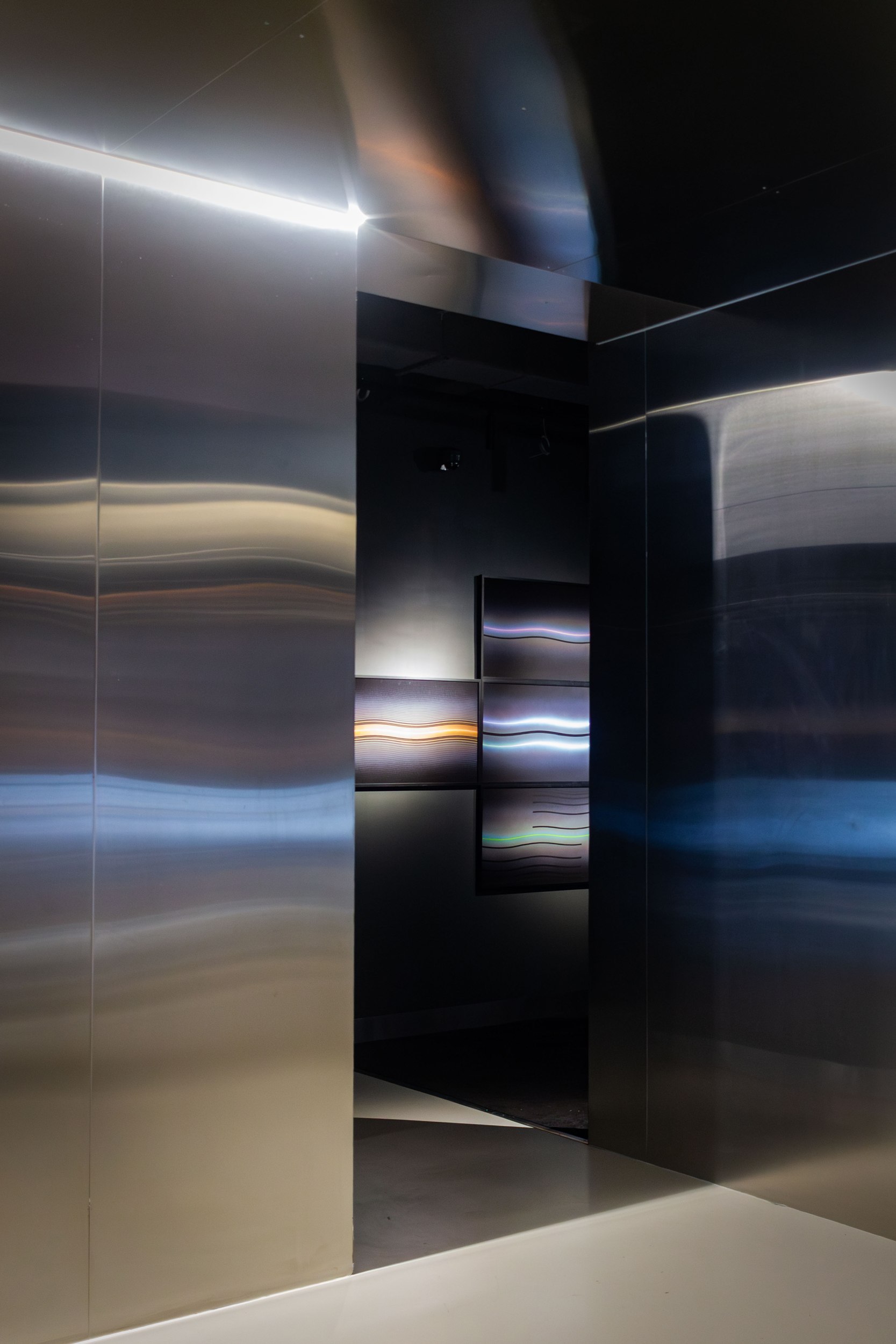 Проект бережно сохраняет наследие позднего советского модернизма. Панорамное остекление – главная архитектурная ценность – проходит через все залы, сохраняя визуальную связь с городом. Контраст используемых теплых и холодных материалов делит пространство на функциональные и смысловые зоны. Узнаваемый элемент интерьера – эллиптическая выставочная система из подвесных и напольных рельс индивидуального изготовления, вдохновленная деталями и линиями ускорительной установки. Она позволяет адаптировать галерею под разные форматы и масштабы экспозиции.