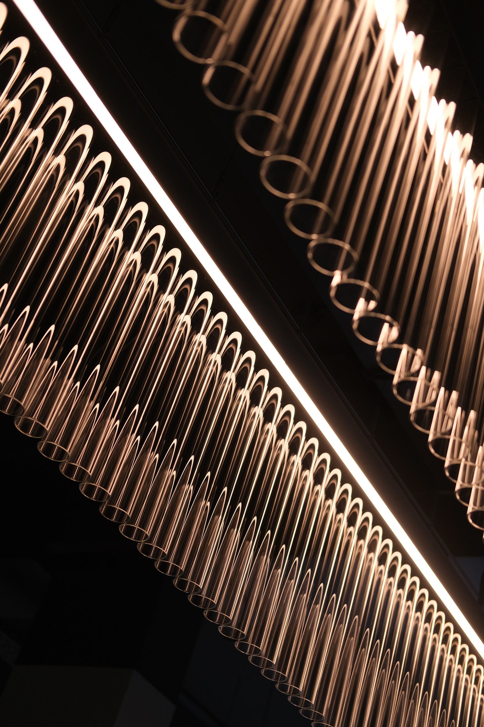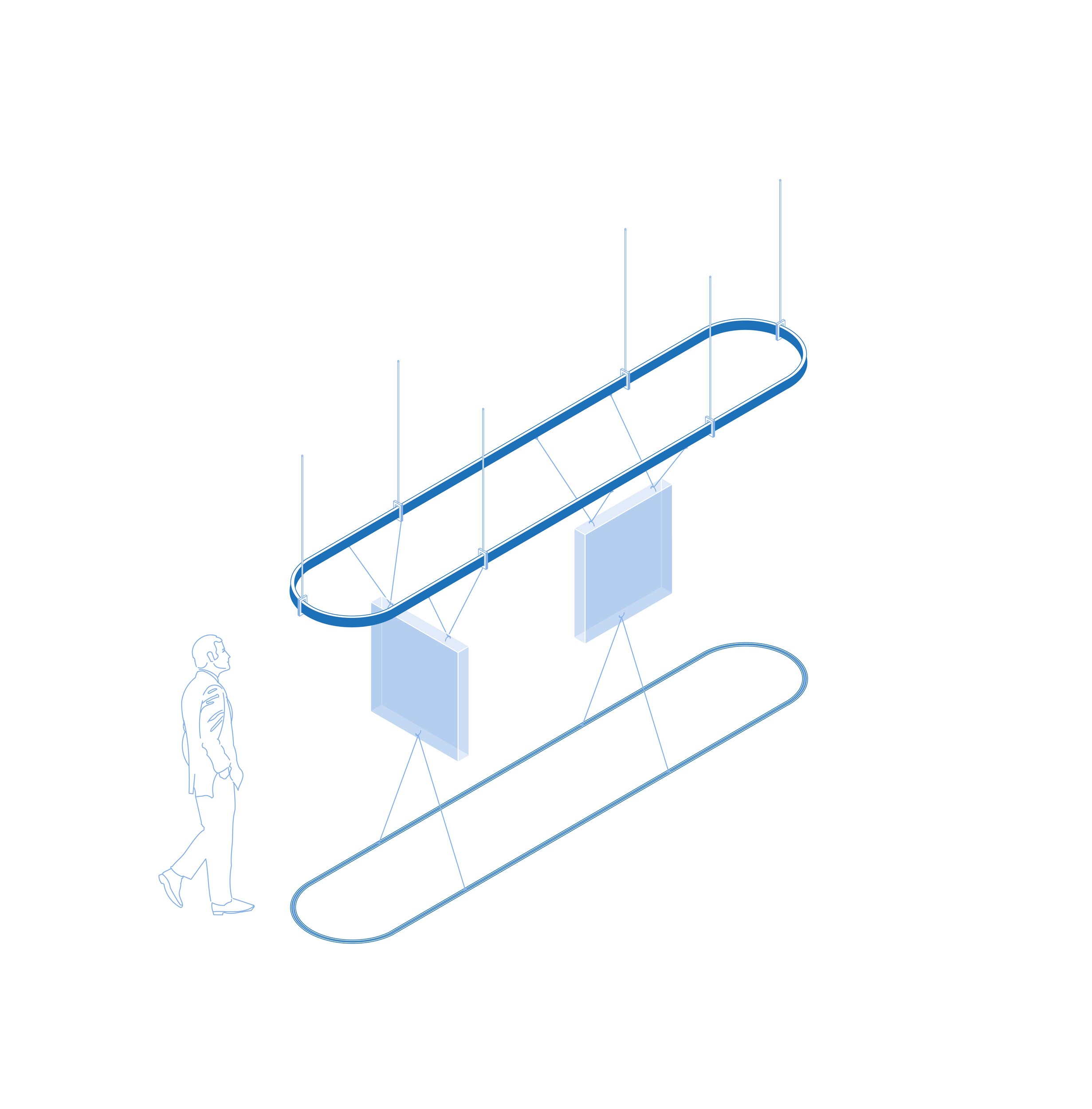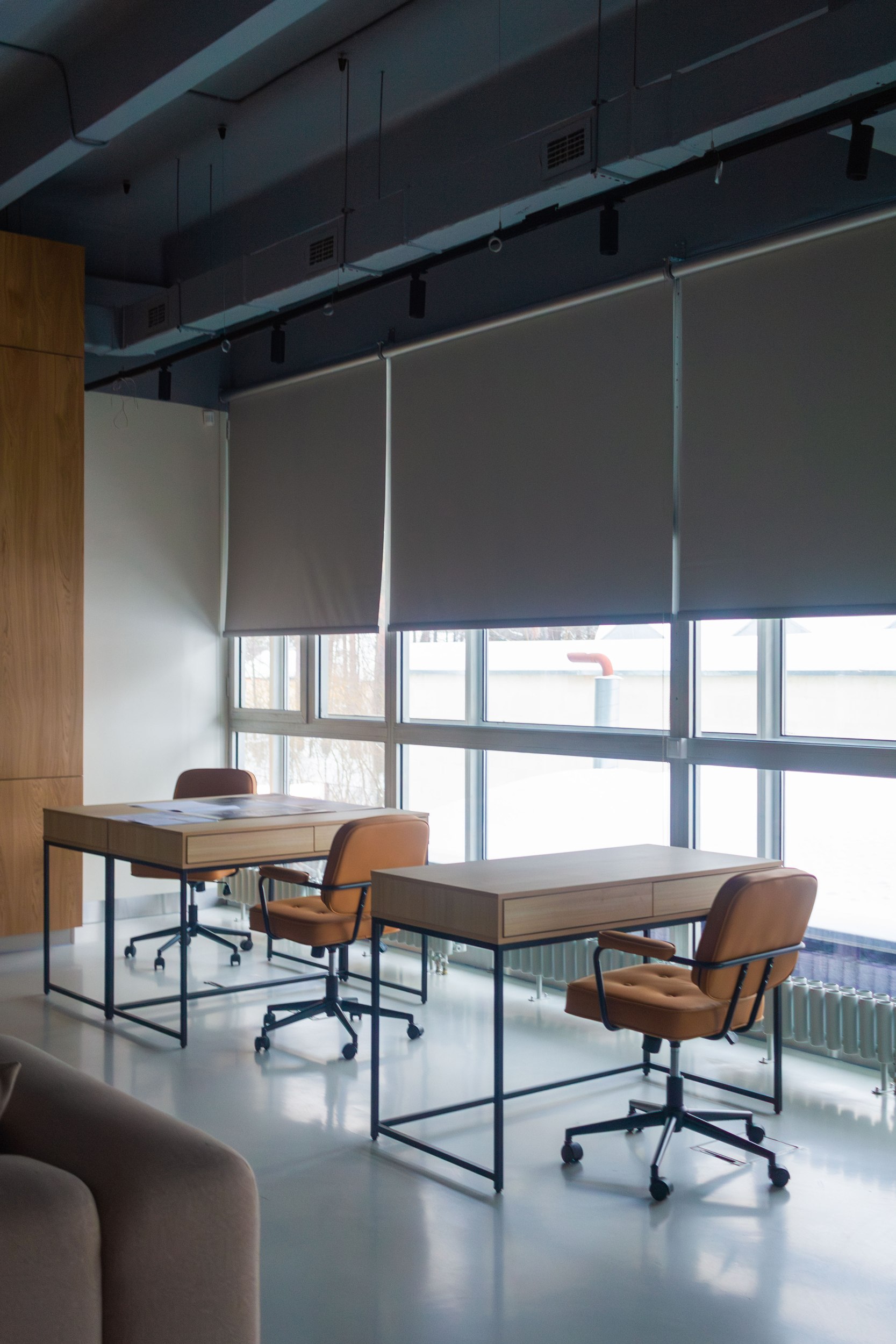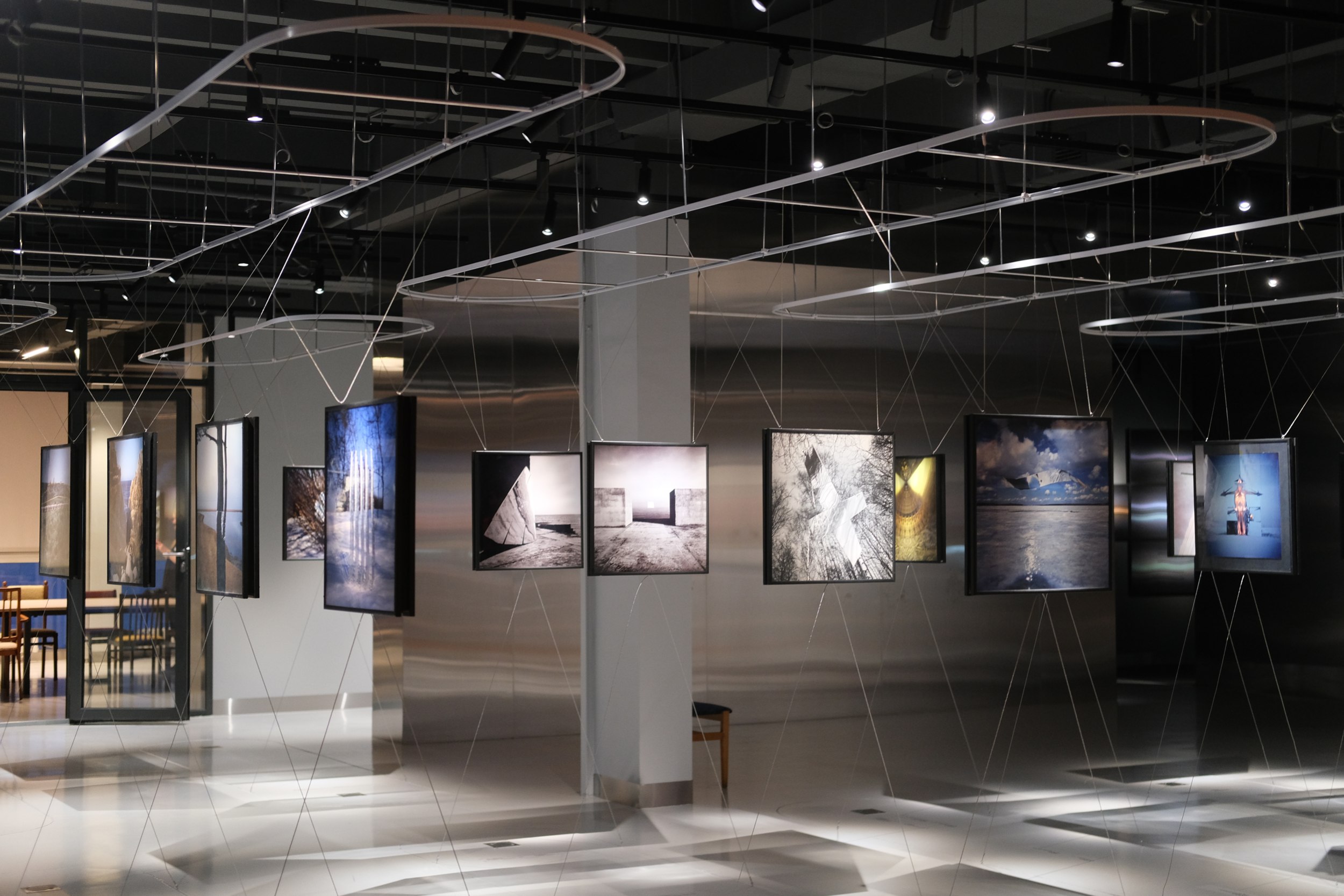 Проект бережно сохраняет наследие позднего советского модернизма. Панорамное остекление – главная архитектурная ценность – проходит через все залы, сохраняя визуальную связь с городом. Контраст используемых теплых и холодных материалов делит пространство на функциональные и смысловые зоны. Узнаваемый элемент интерьера – эллиптическая выставочная система из подвесных и напольных рельс индивидуального изготовления, вдохновленная деталями и линиями ускорительной установки. Она позволяет адаптировать галерею под разные форматы и масштабы экспозиции.