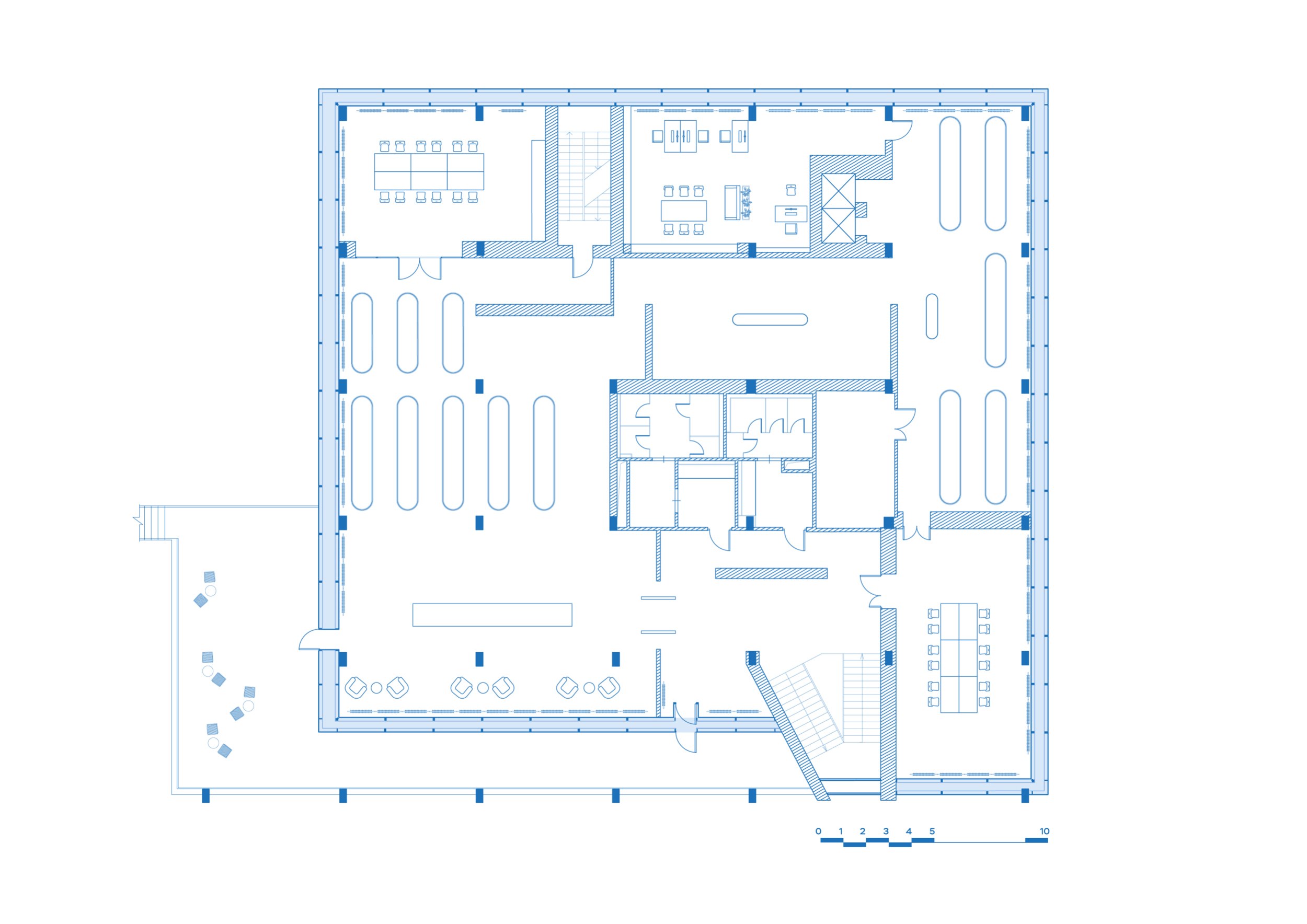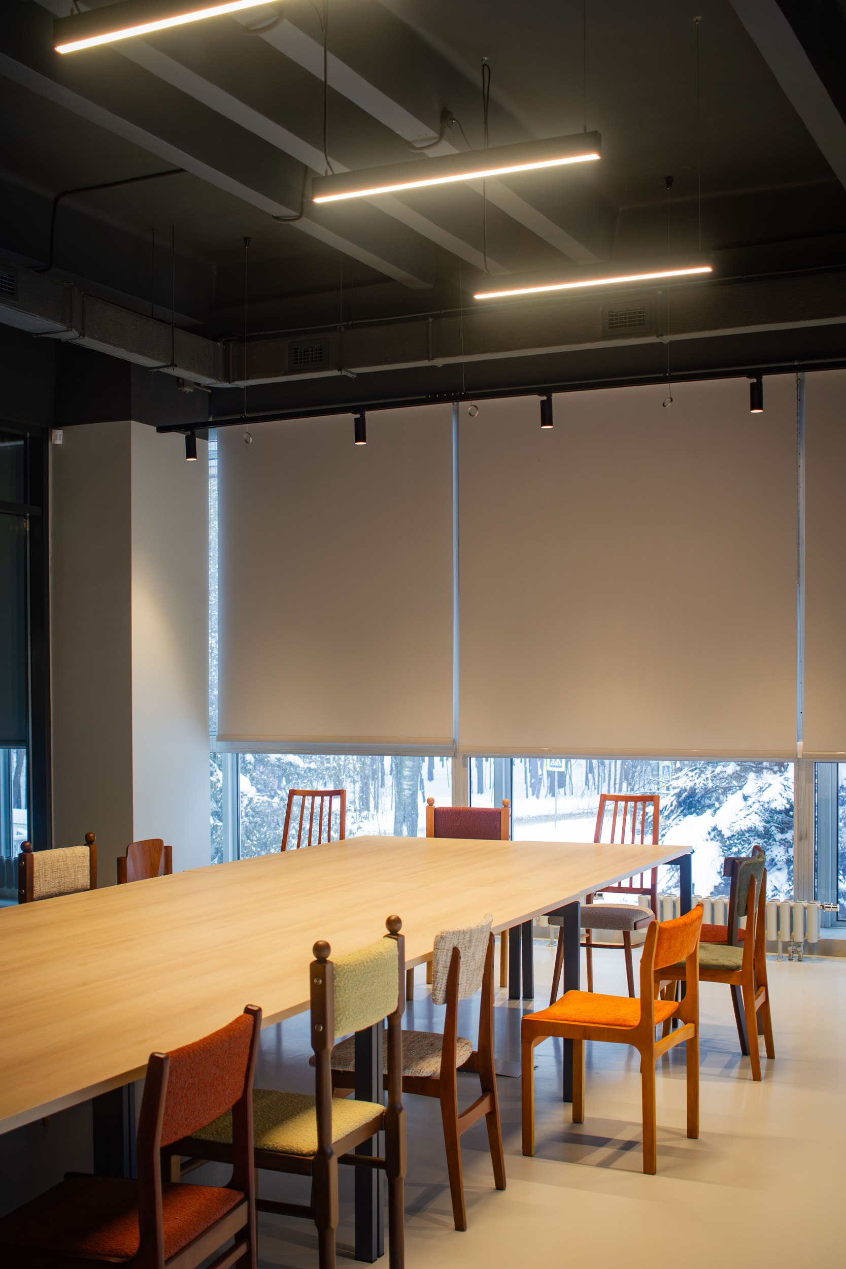 Планировки прилегающих помещений мастерской, лекционного зала и офиса меняются под различные сценарии: лекции, хакатоны, подкасты, конференции и школьные программы.