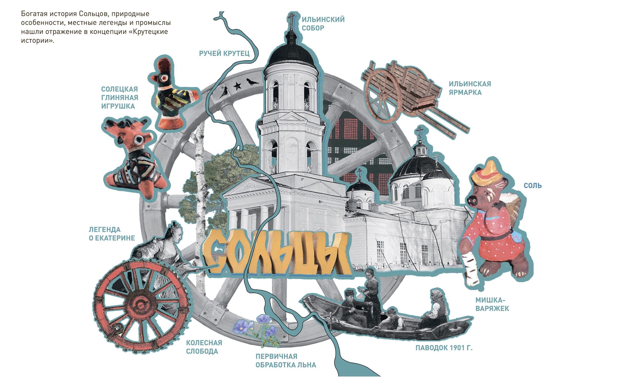 Перед командой проекта стояла задача сделать территорию всесезонной точкой притяжения, раскрывающей колорит города его гостям и интересной для посетителей разных возрастов. При работе над проектом учитывалось мнение горожан, которые участвовали в рабочих встречах, интервью, анкетировании и общественных обсуждениях. Концепция «Крутецкие истории» включила отсылки к прошлому Сольцов, природным особенностям края, местным легендам и промыслам.