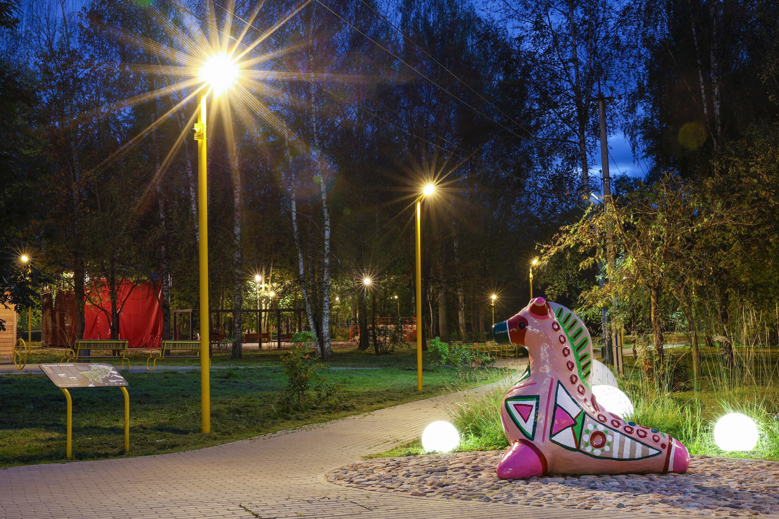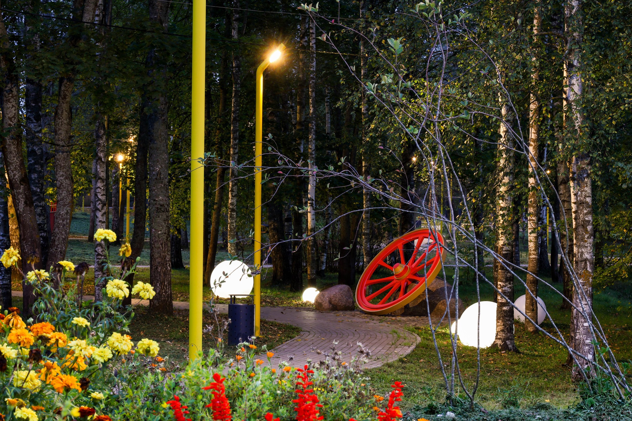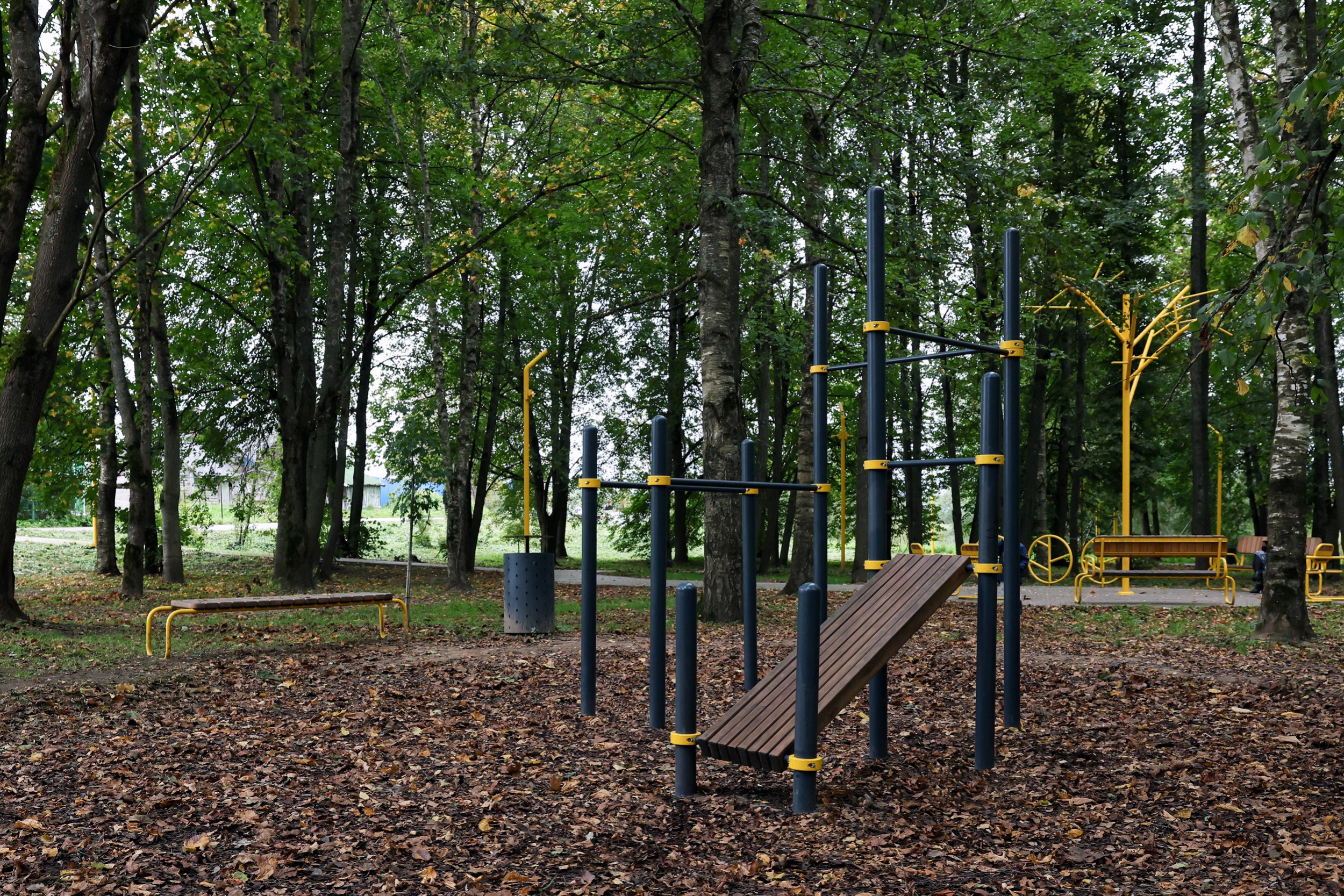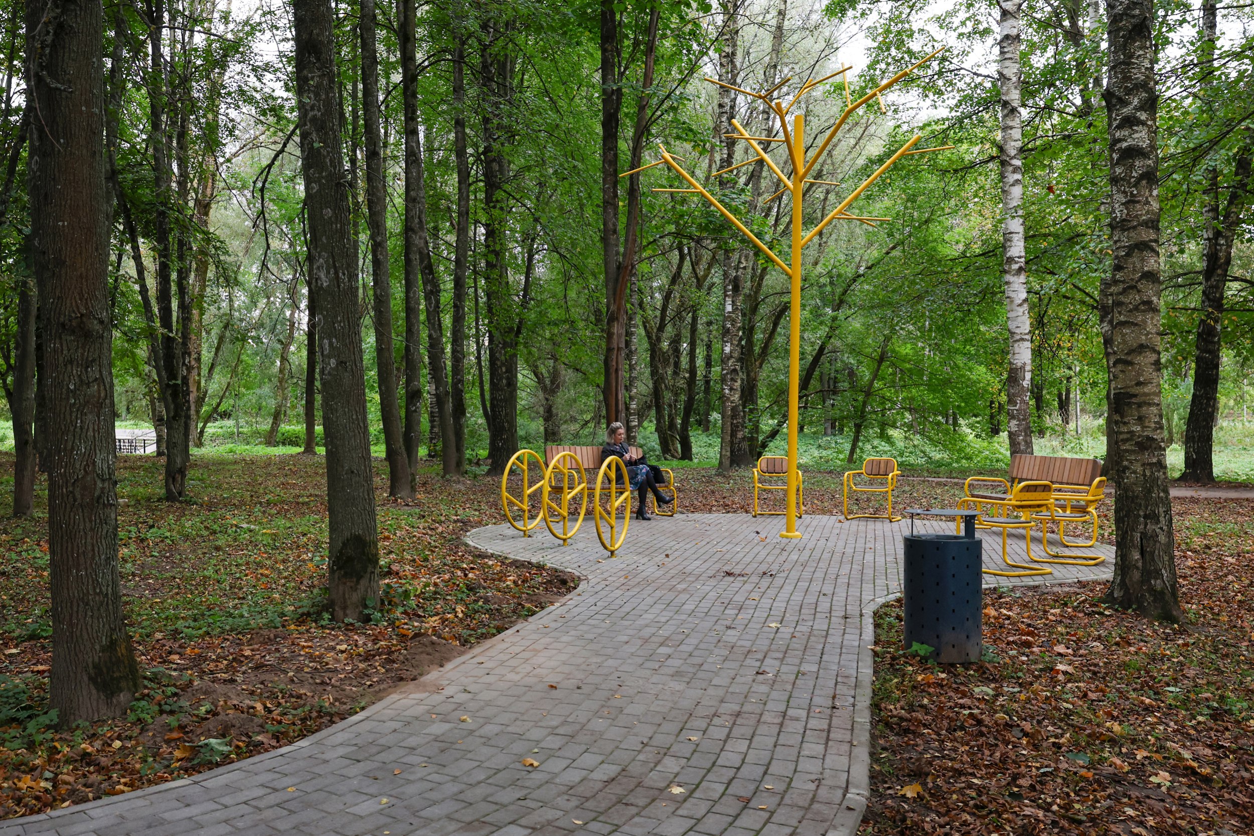 Благоустройство выполнено с бережным отношением к сложившемуся озеленению. Дополнительно в парке высажены ивы, сосны, ясени, дубы и декоративные кустарники. В теплое время года территорию украшают цветники. По запросу жителей на территории появилась площадка для молодежи с необычной опорой освещения в виде дерева и комплексом для воркаута на небольшом отдалении.