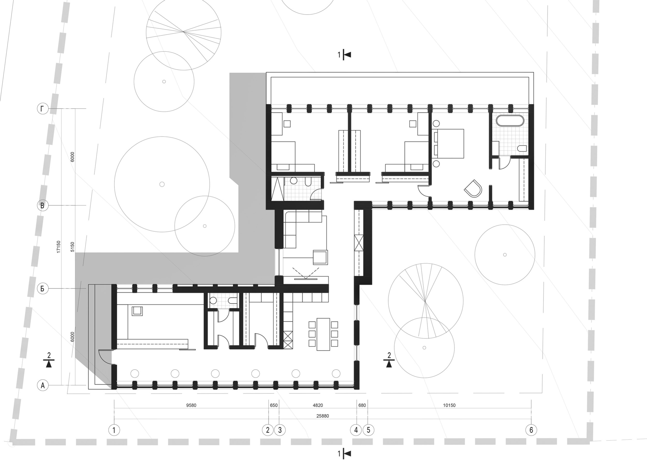 Дом расположен вдоль в северной части участка. Его архитектурный облик образуют три сочлененных объема, разделенных функционально и эстетически. Два крыла хозяйского и гостевого блока расходятся от доминантного объема Печи-гостиной. Гостевой блок размещен вдоль проезда, хозяйский блок обращен в глубину участка и имеет выход на террасу. В гостевом блоке размещена кухня, гостевой санузел, кабинет-мастерская хозяина дома и просторная галерея с возможностью размещения макетов и скульптур. Через кухню можно пройти в уютную гостиную с камином и световым фонарем. В жилом блоке размещены детские спальни и мастер-спальня хозяев.