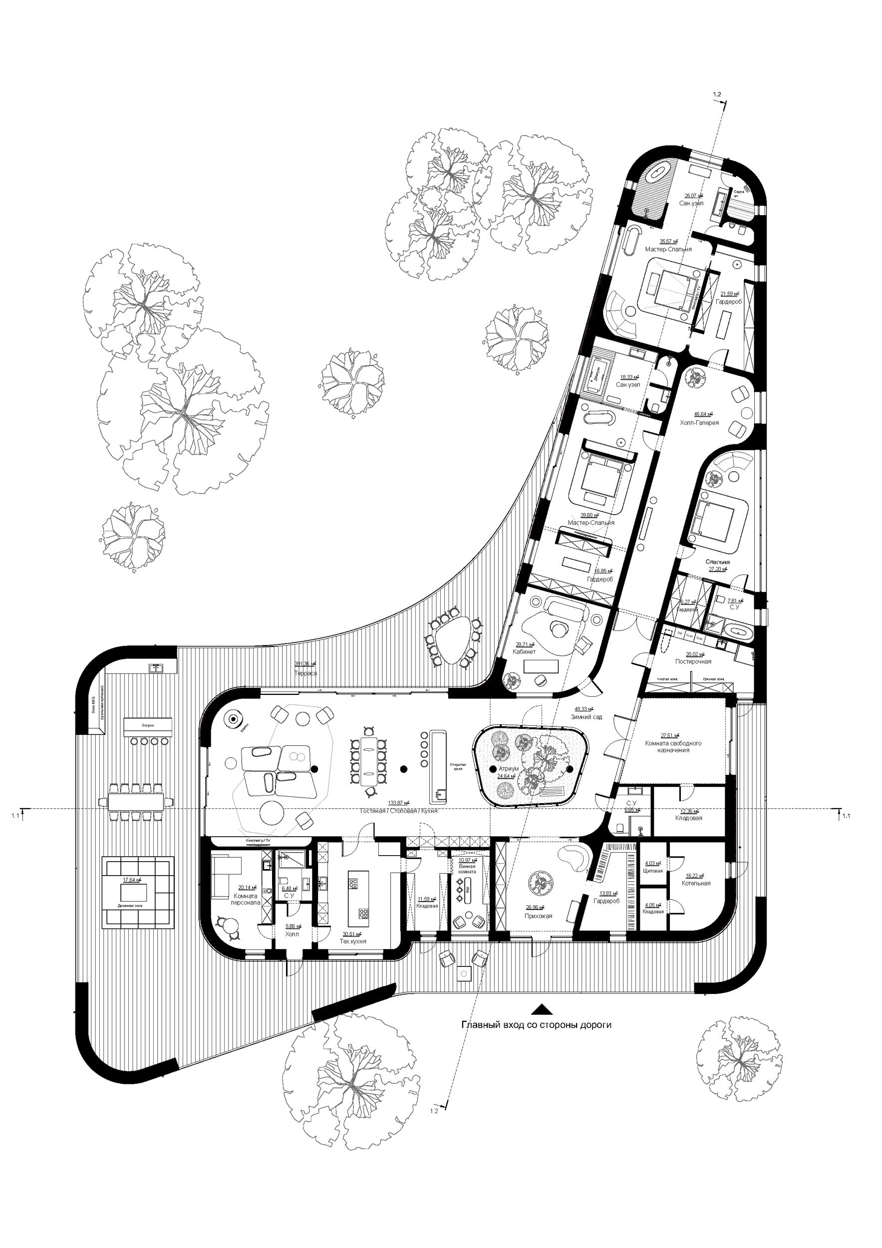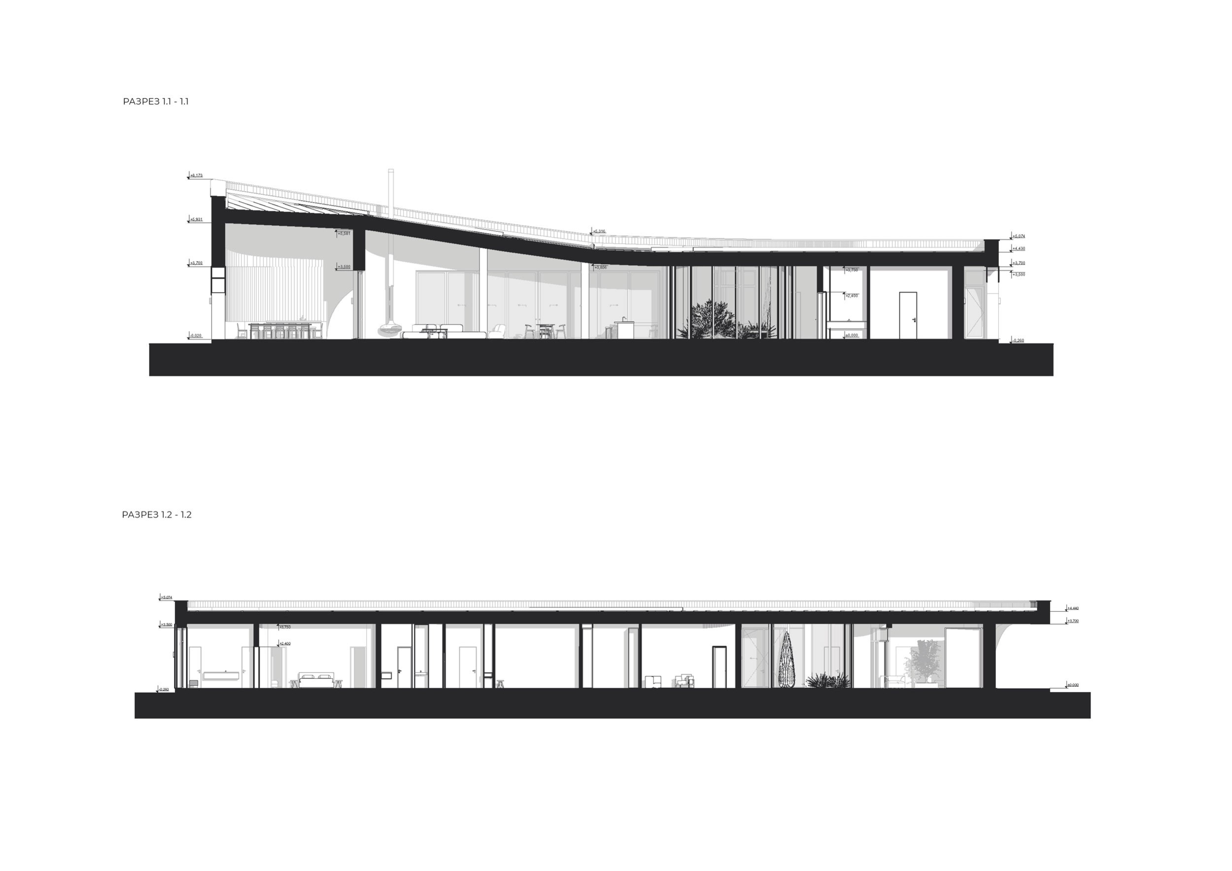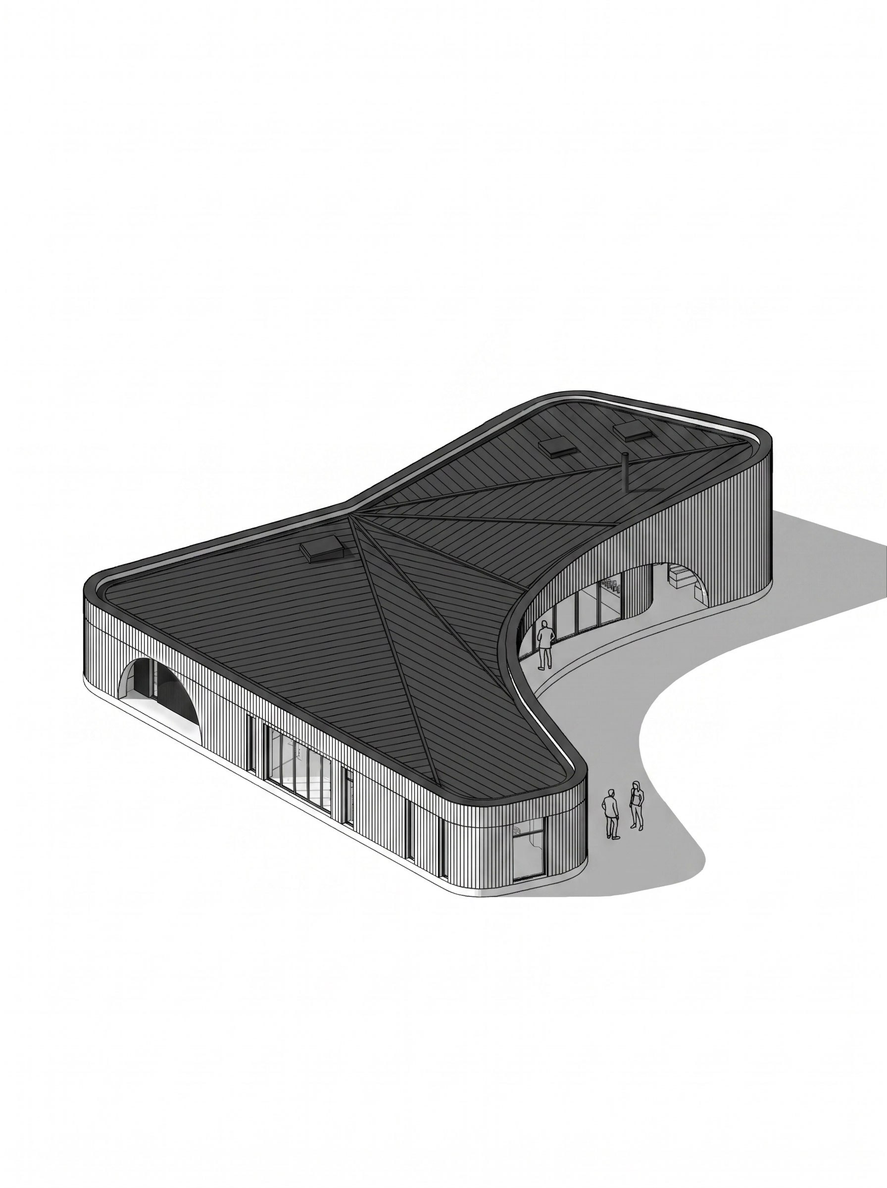 Мы осознанно отказались от вертикального развития в пользу распластанной, одноэтажной структуры. Здание формируется как вытянутые линии рельефа, огибающие дом и создающие внутри ощущение прохлады. Форма работает как защитный «каркас-оболочка», накрывающий текучее внутреннее пространство. Планировка лишена жесткой ортогональной геометрии – она строится на мягких перепадах высот и плавных линиях, отсылающих к архетипичным природным укрытиям, пещерам и пологим склонам.