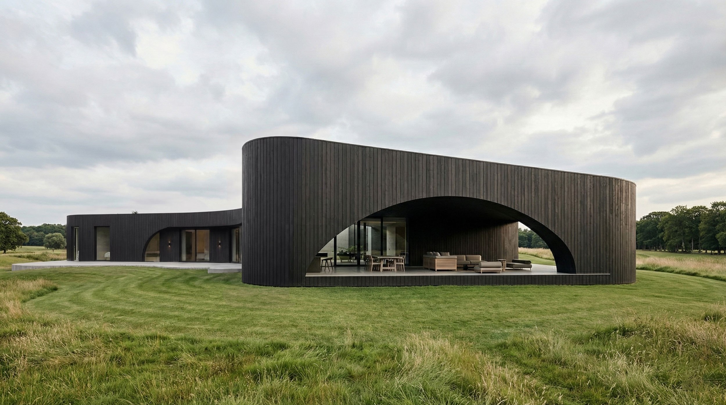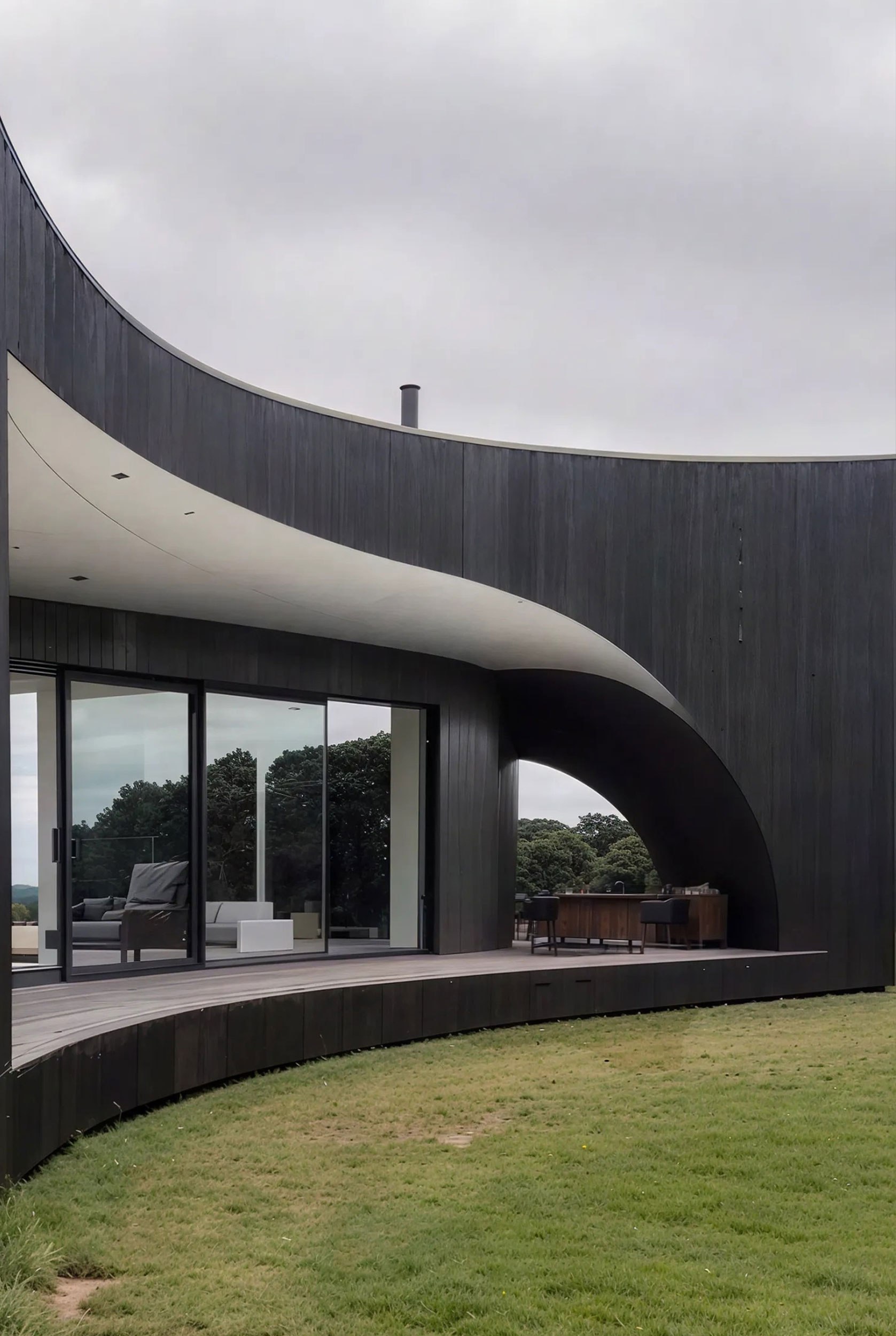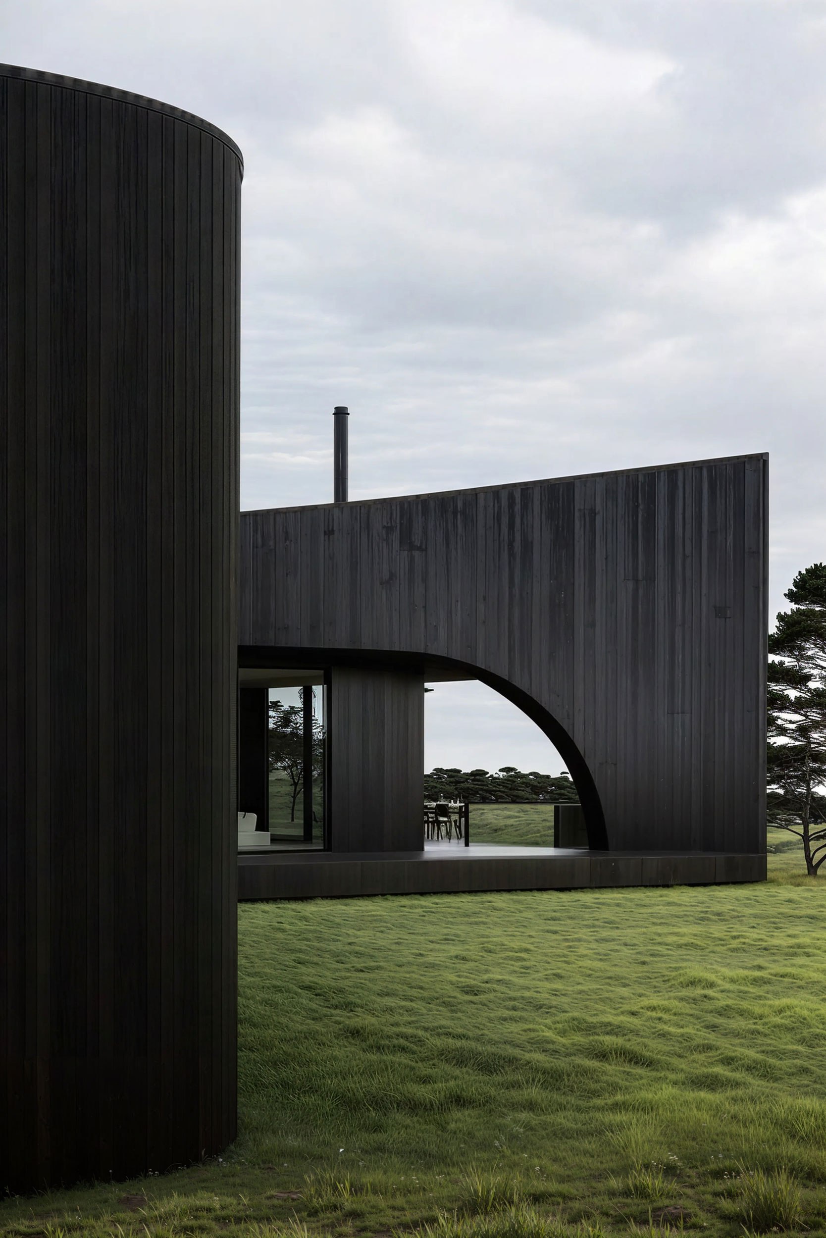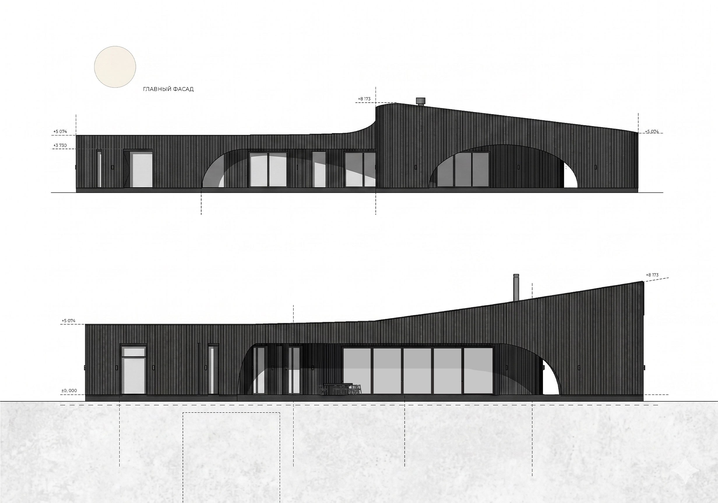 Дом полностью формируется из единого материала – обожжённого дерева глубокого чёрного оттенка. Это работает как нейтральный фон, усиливая природные краски Поволжья, и одновременно превращает здание в скульптурную композицию.
