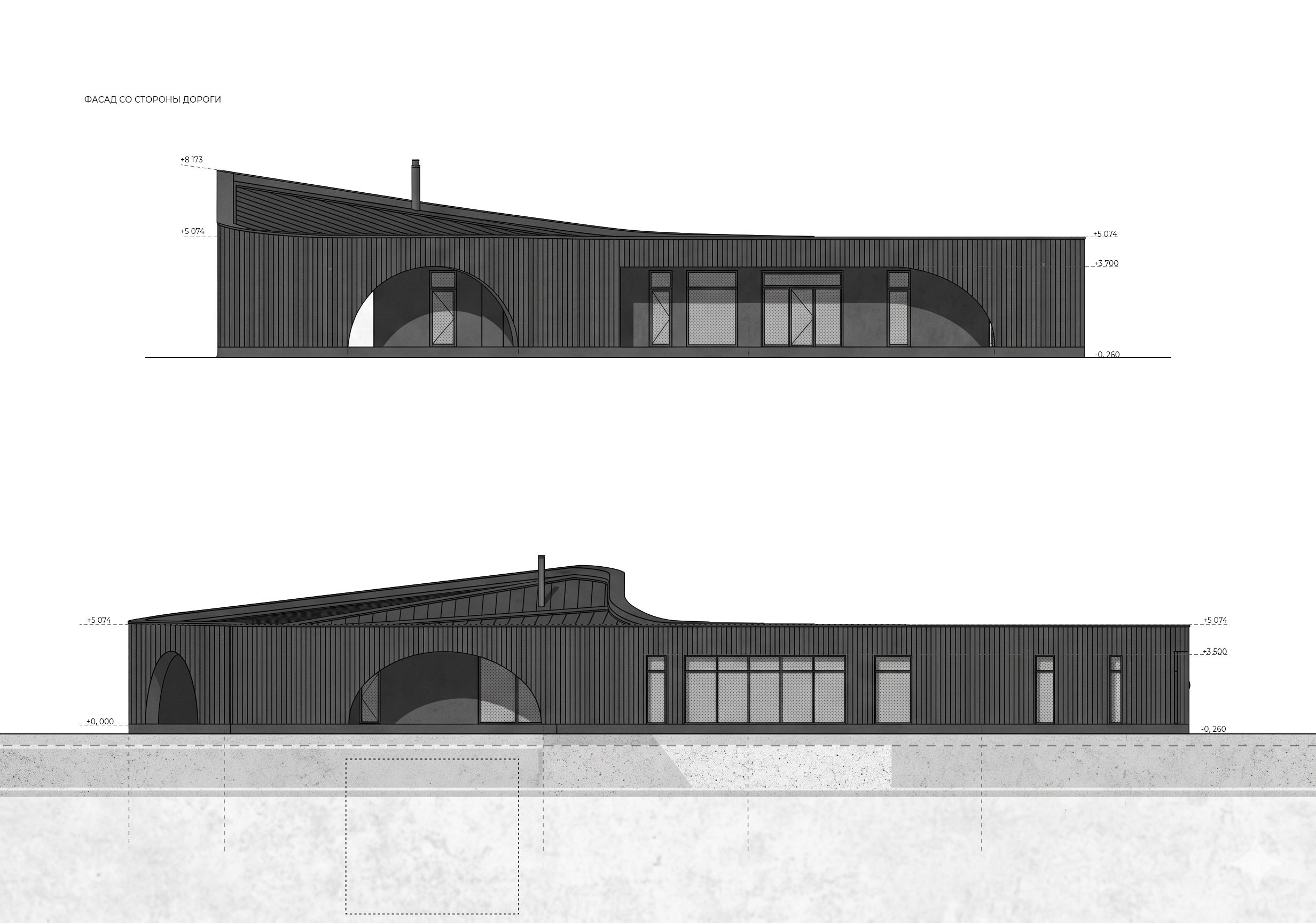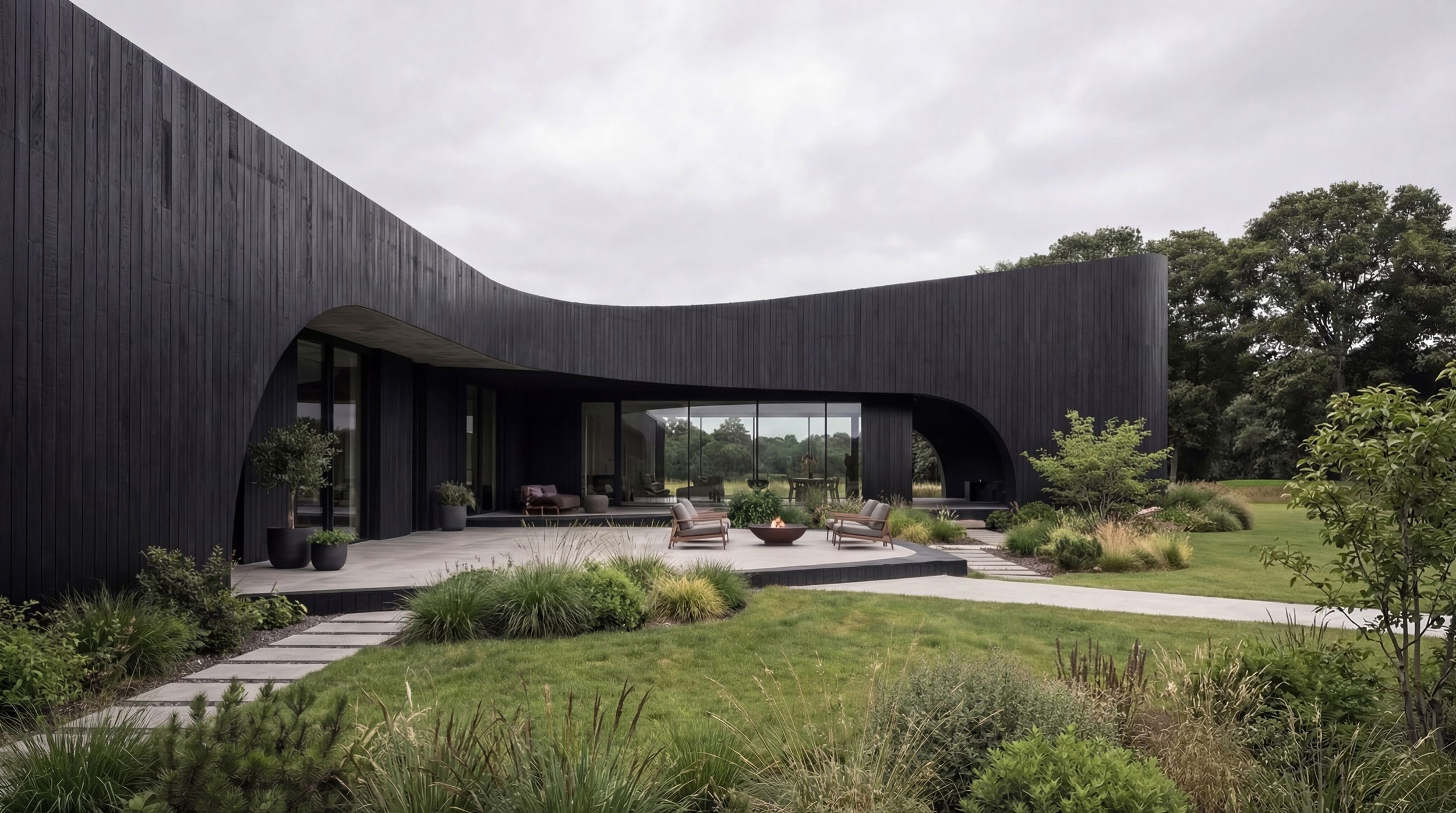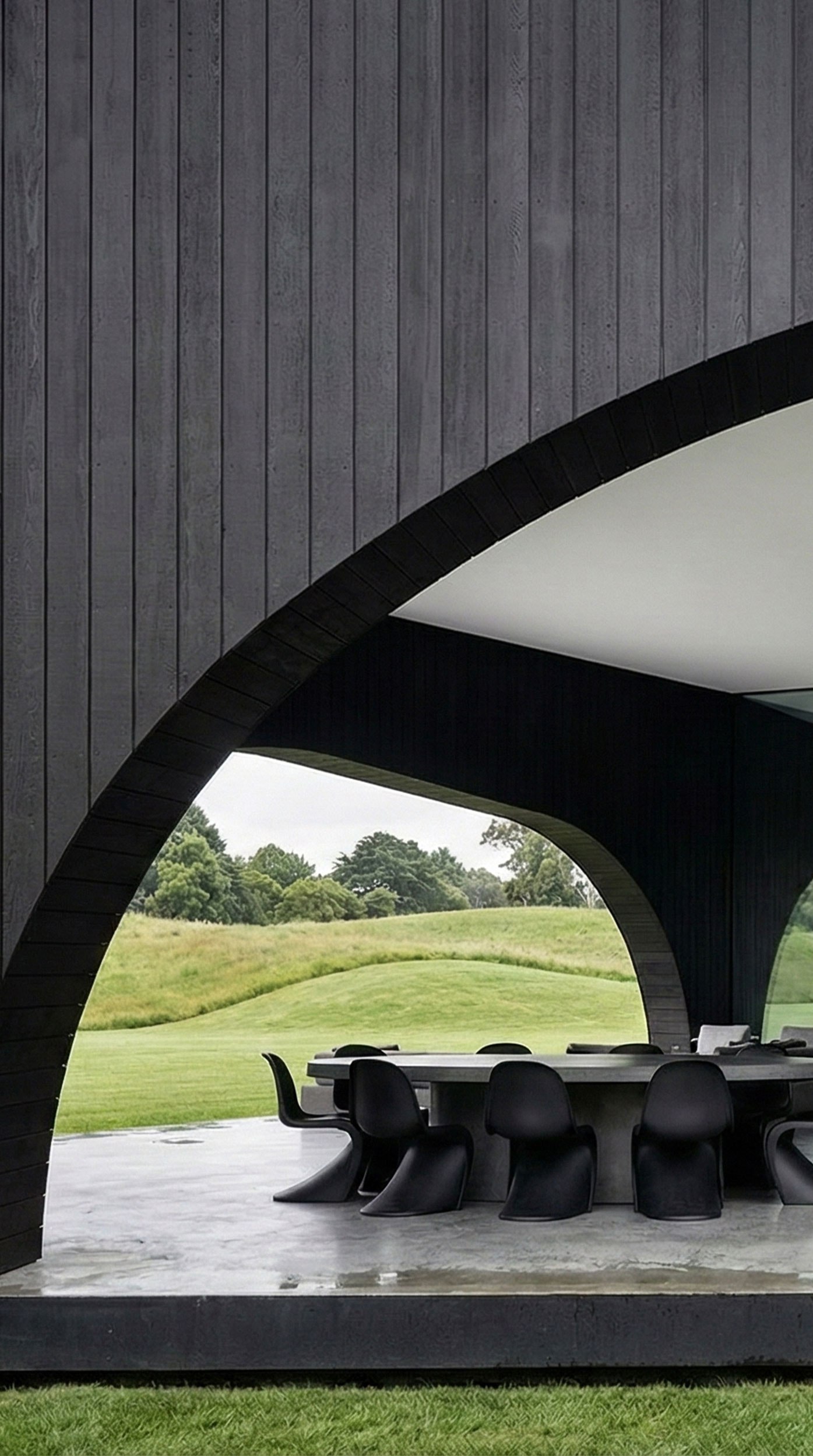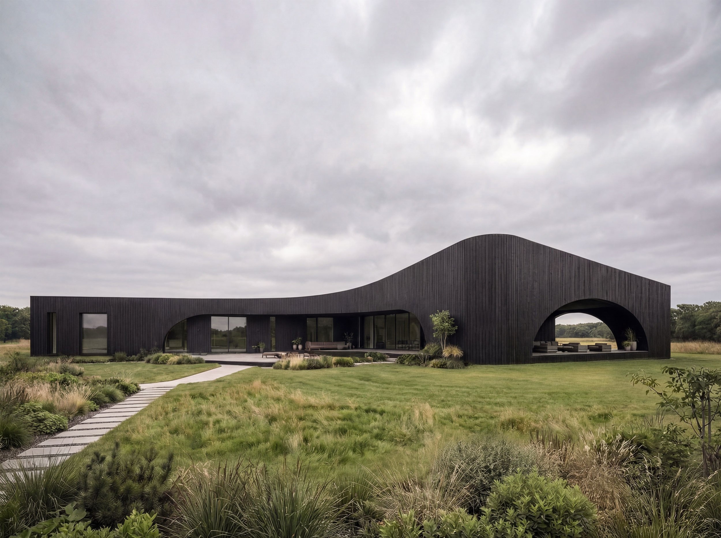 Дом полностью формируется из единого материала – обожжённого дерева глубокого чёрного оттенка. Это работает как нейтральный фон, усиливая природные краски Поволжья, и одновременно превращает здание в скульптурную композицию.