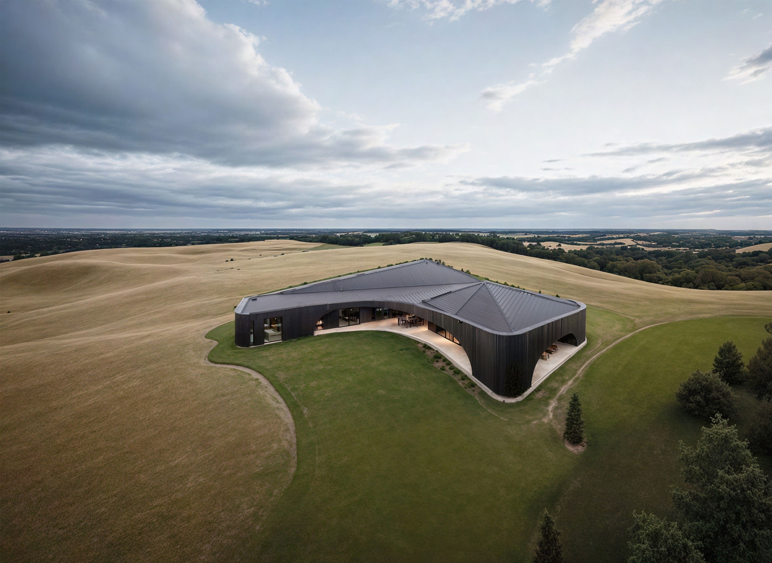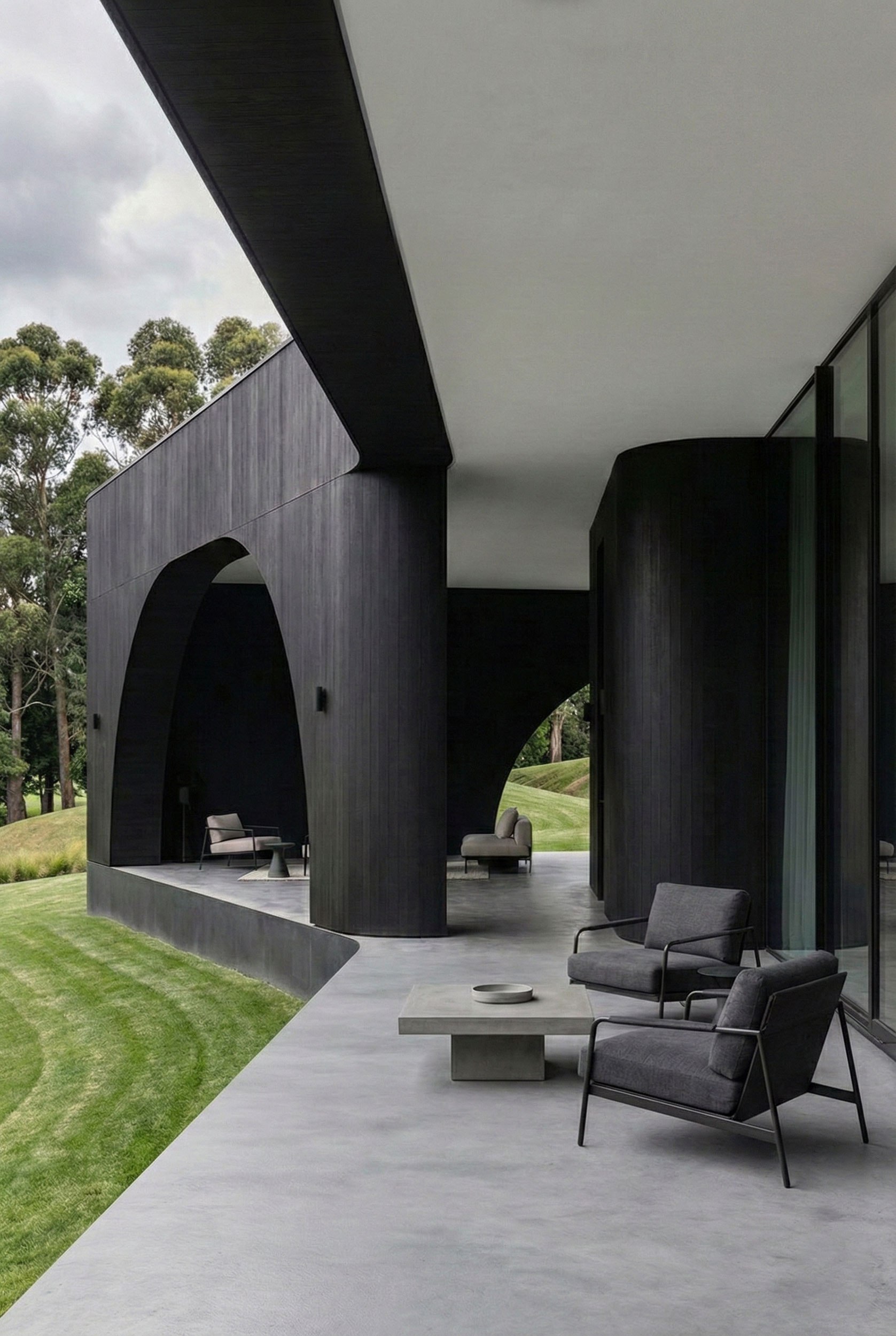 Конфигурация объема замыкается вокруг приватного внутреннего двора – тихого ядра, скрытого от внешних глаз. Пространство дома работает как единый «текучий объем», где благодаря панорамным окнам внутренние перспективы раскрываются на ключевые видовые точки ландшафта, стирая границу между интерьером и экстерьером.