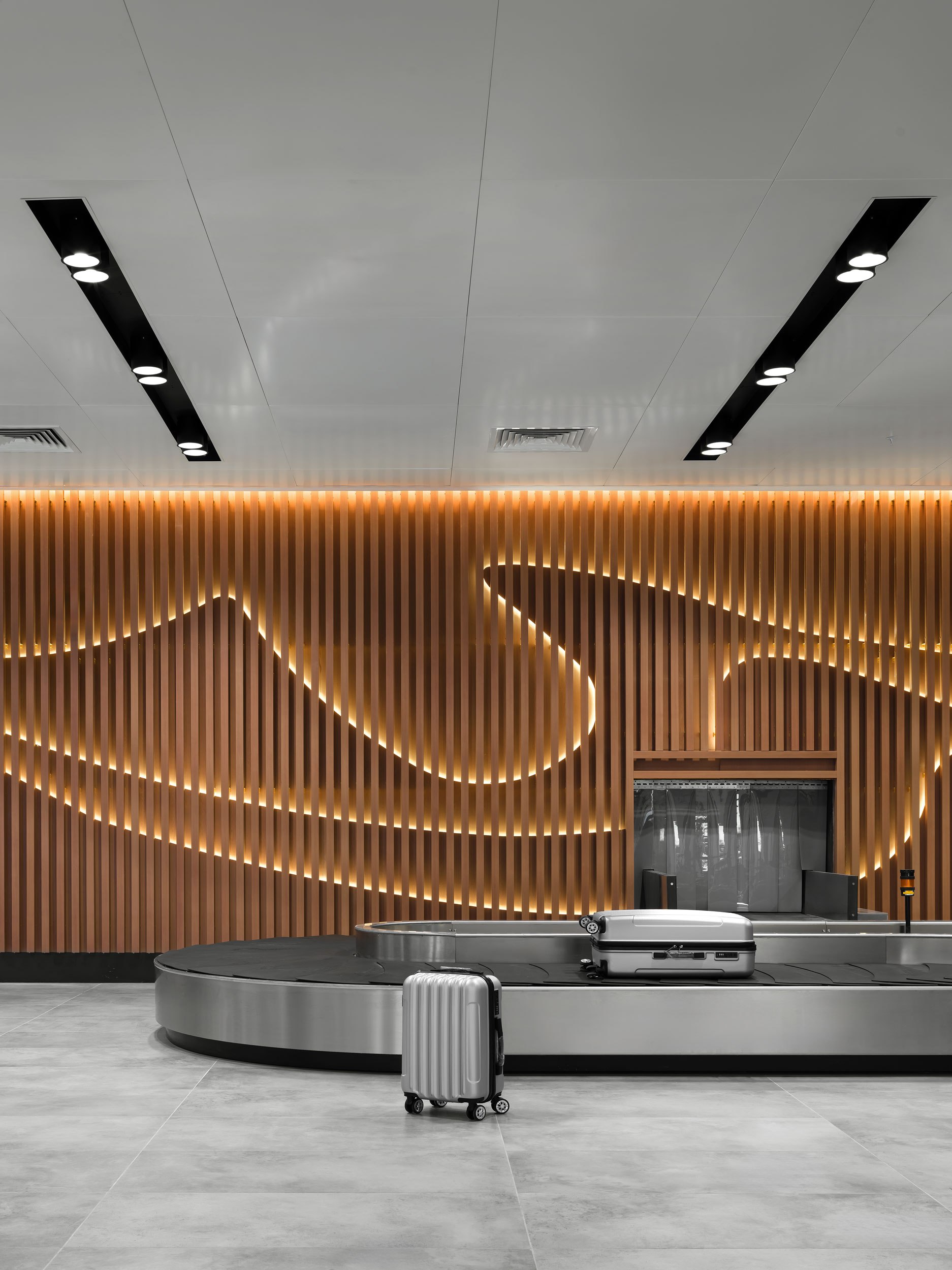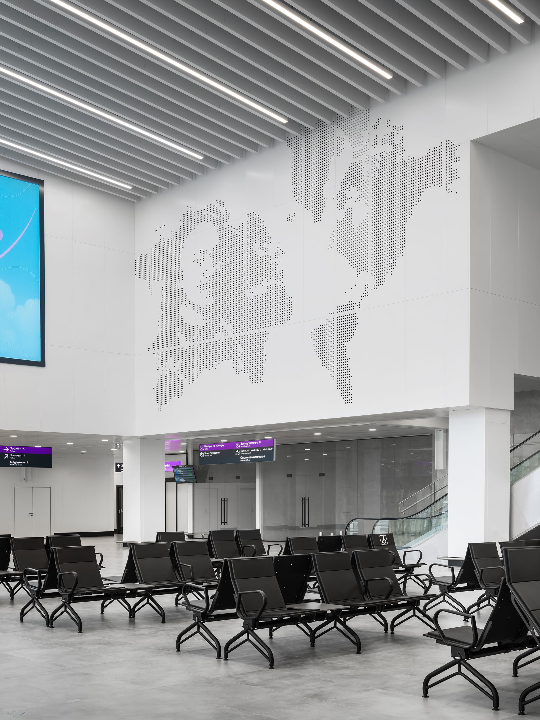 Интерьер терминала включает зоны регистрации, ожидания, вылета, выдачи багажа, детские спальни, игровую, три зала повышенной комфортности и переговорный зал. Он выполнен в минималистичном ключе с натуральными текстурами, спокойной палитрой и лаконичными формами, обеспечивая долговременную актуальность и визуальную чистоту.