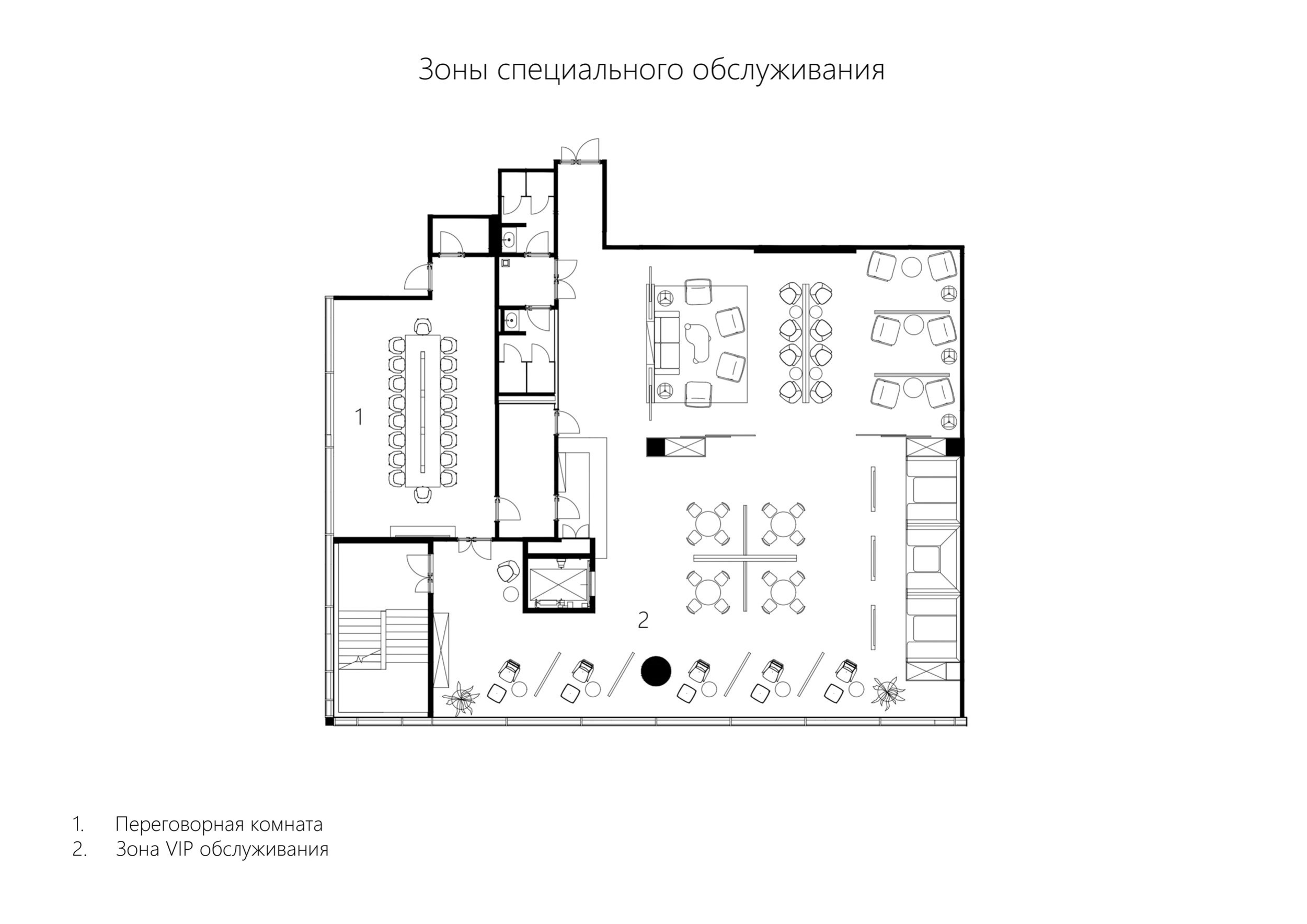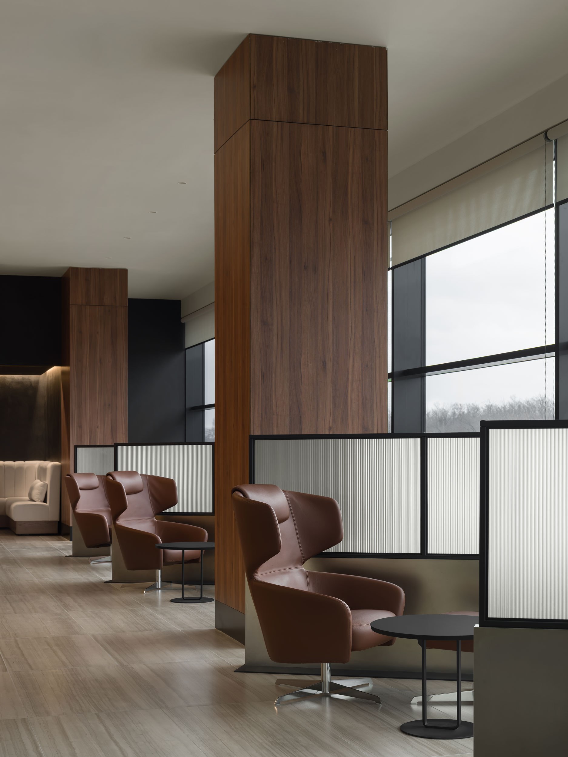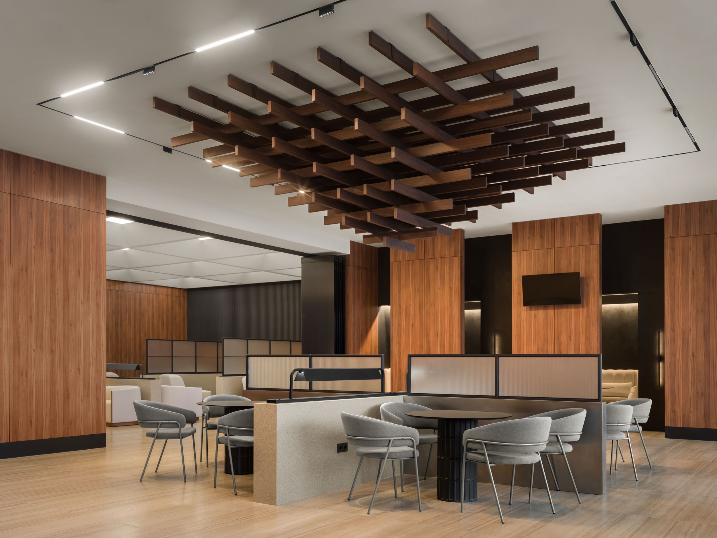 Залы повышенной комфортности – «Бизнес», «Приорити» и VIP – предлагают приватность и камерную атмосферу. Использованы натуральные материалы, мягкое освещение, органичные формы и функциональные элементы, включая трансформируемые перегородки и продуманное зонирование. VIP-зал выделяется премиальным дизайном, масштабной потолочной инсталляцией и приватной переговорной комнатой.