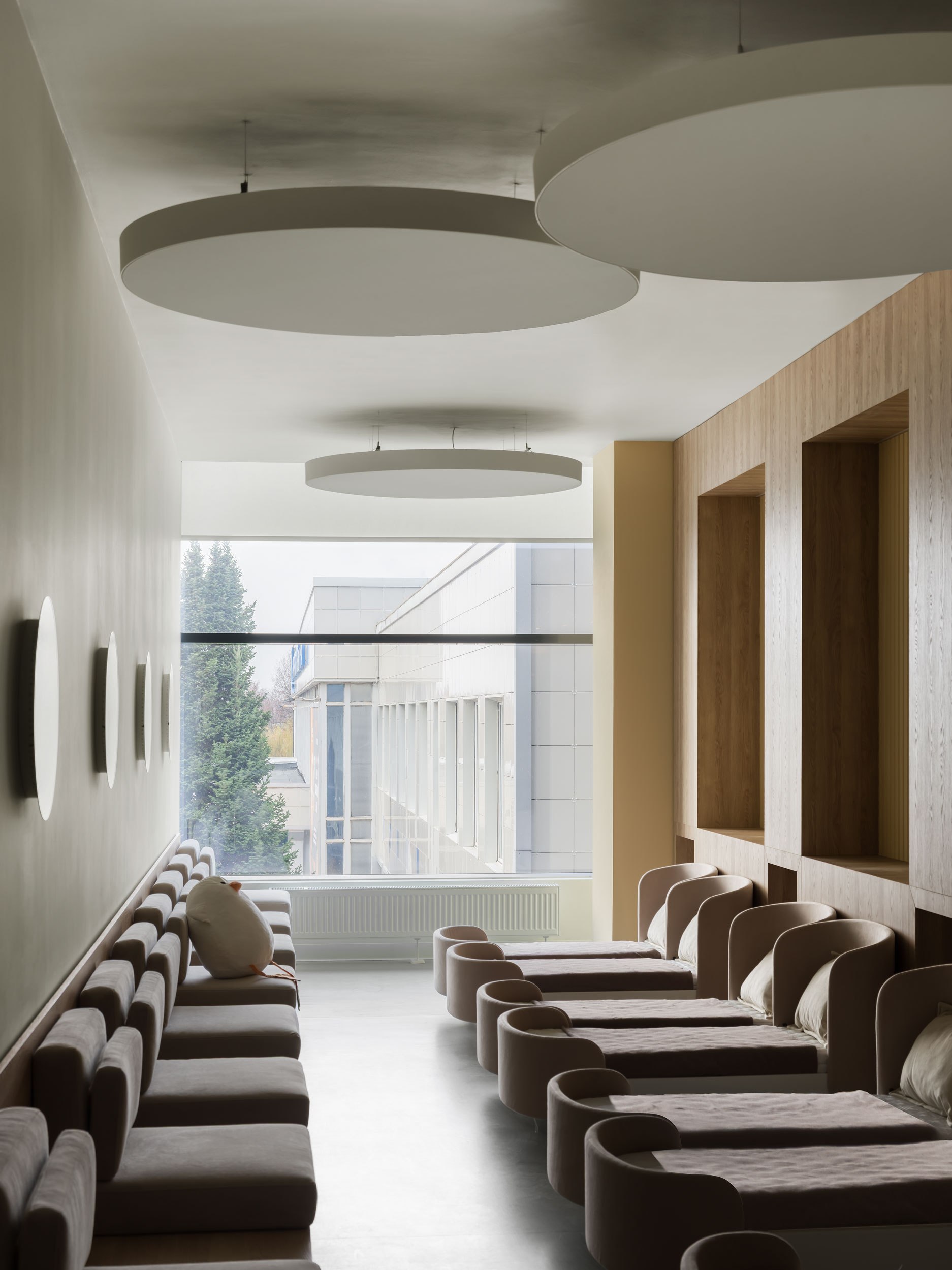Атриум с панорамными витражами и волнообразным потолком наполняет пространство светом, а бионические формы и контрастные детали мебели создают плавность и динамику восприятия. Цветовой акцент – синий – помогает навигации и отсылает к небу, воде и истории города. Для самых маленьких пассажиров предусмотрены безопасные спальни и игровая зона, где мягкие формы и светлые оттенки снижают стресс.