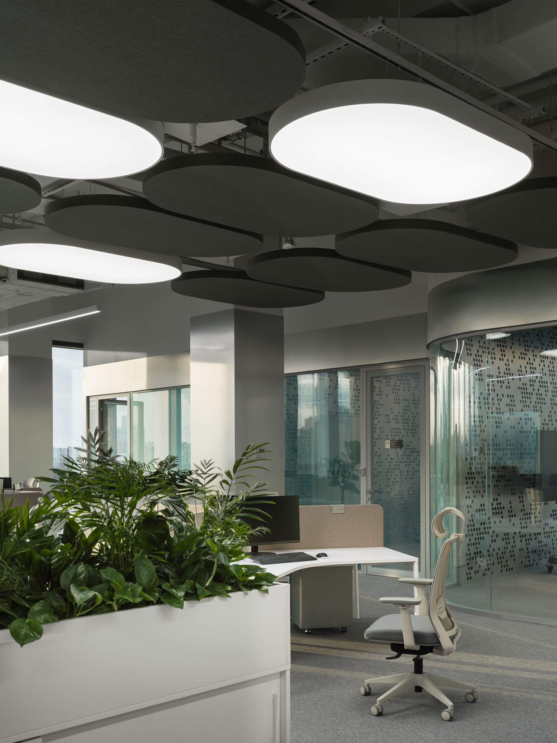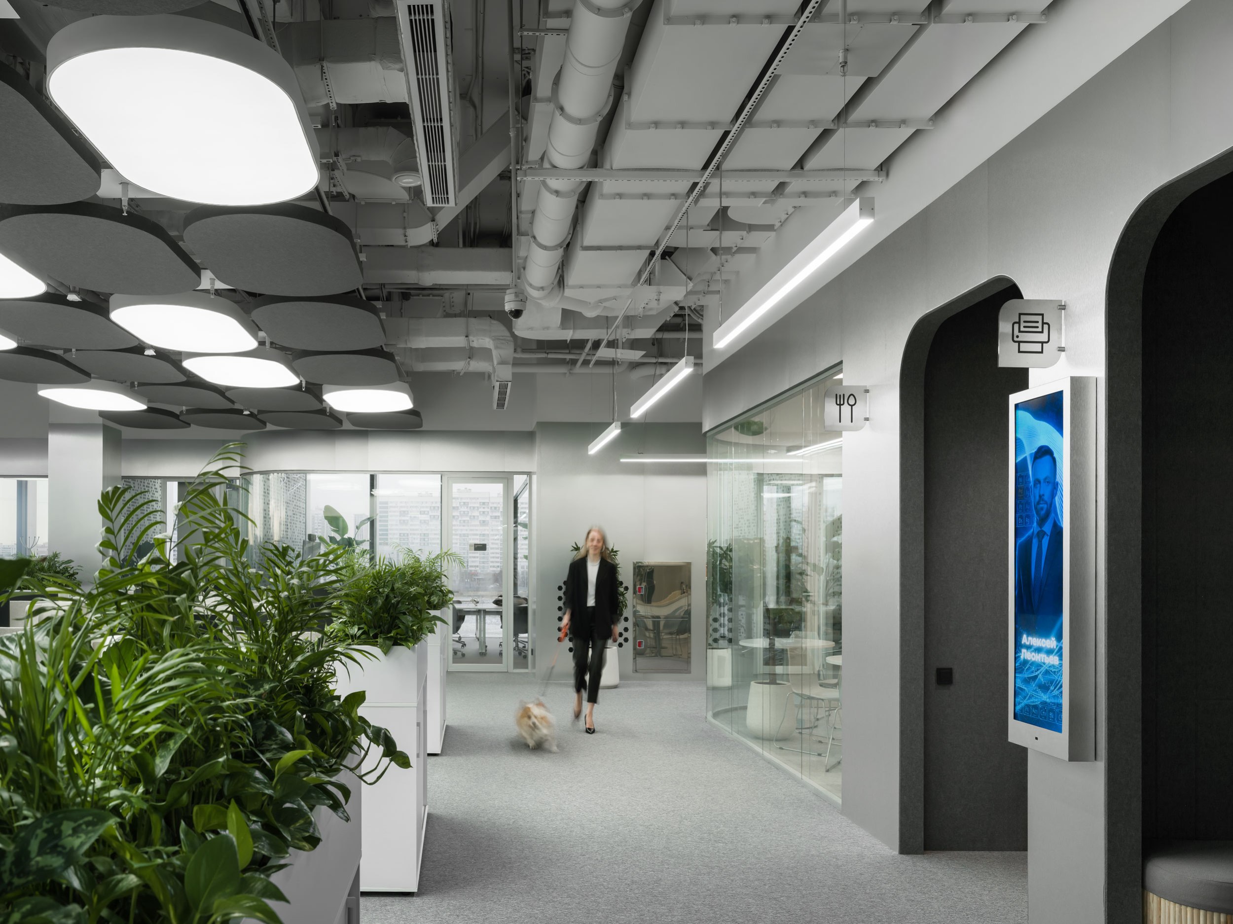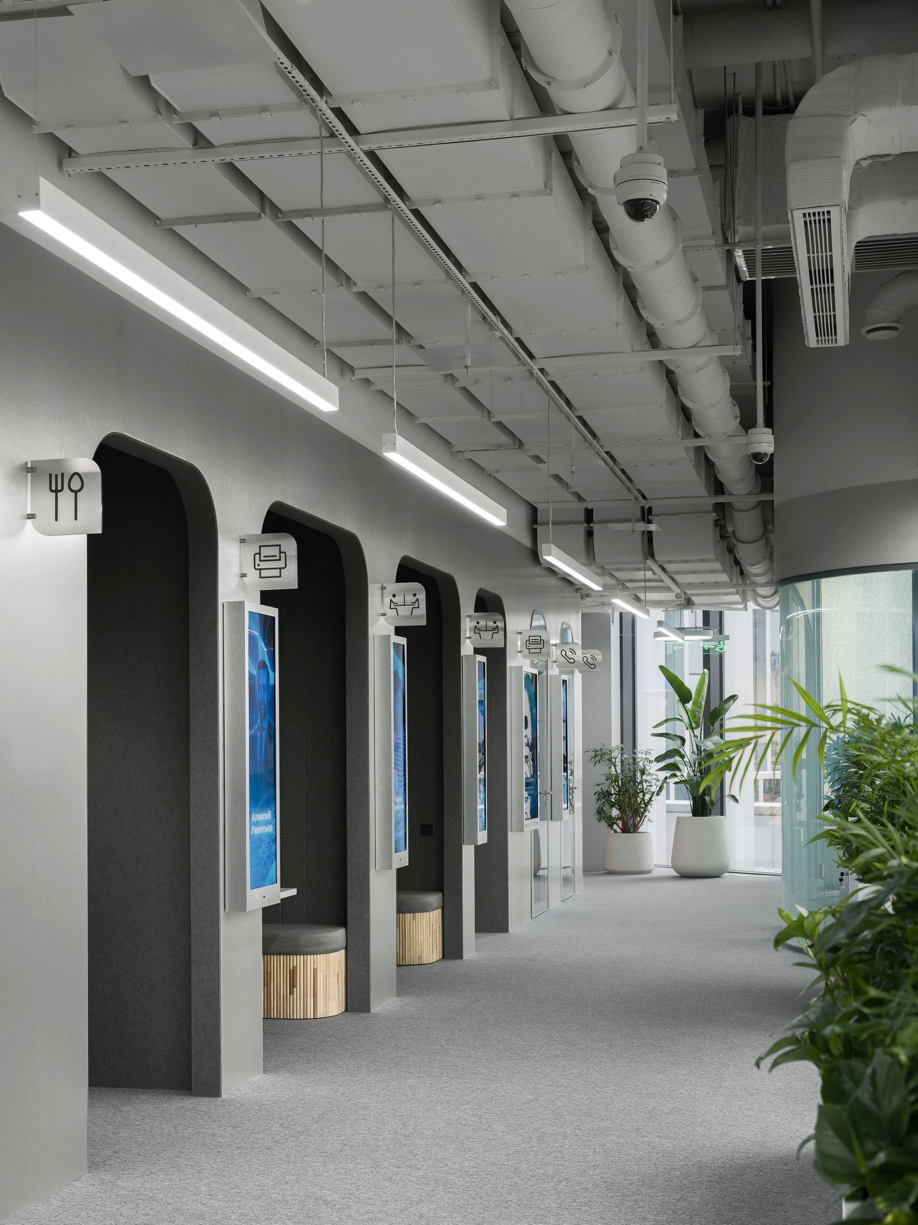 Дизайн-концепция Lab-Core воплощает лабораторную эстетику: прозрачность, техническую точность, прагматичность. Использованы нестандартные материалы: стеновые панели под нержавеющую сталь, деревянные панели с редкой перфорацией, наливной пол. Главный акцент – белый цвет, создающий ощущение стерильности и инновационности. Множественные отражения стекла дают ощущение прозрачности и легкости. Концепция опирается на принципы биофилии: зелень плотно окружает рабочие места. Активно используются предметы цифрового искусства (экраны с ИИ-помощниками, цифровые картины, инсталляции). Большая часть материалов – российского производства. Реализована биодинамическая система освещения, меняющая световую температуру в соответствии с циркадными ритмами. Звукопоглощающие баффлы, войлочные поверхности и акустические панели обеспечивают низкий коэффициент реверберации. Зональное регулирование климата позволяет настраивать микроклимат для разных рабочих групп.