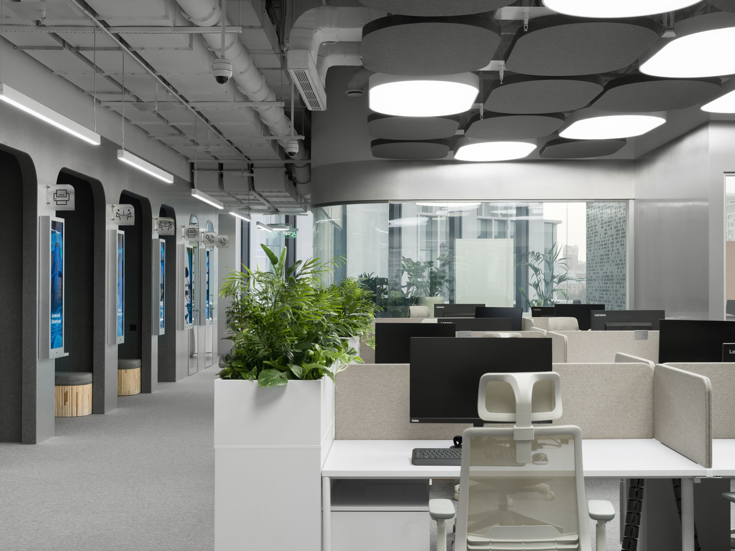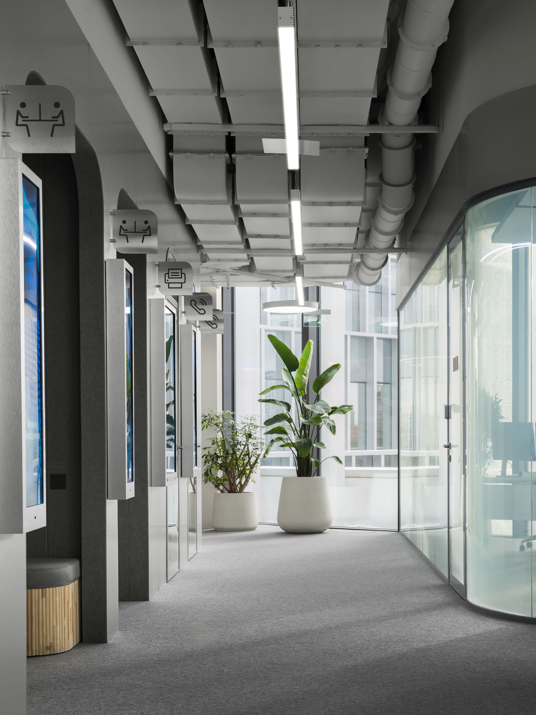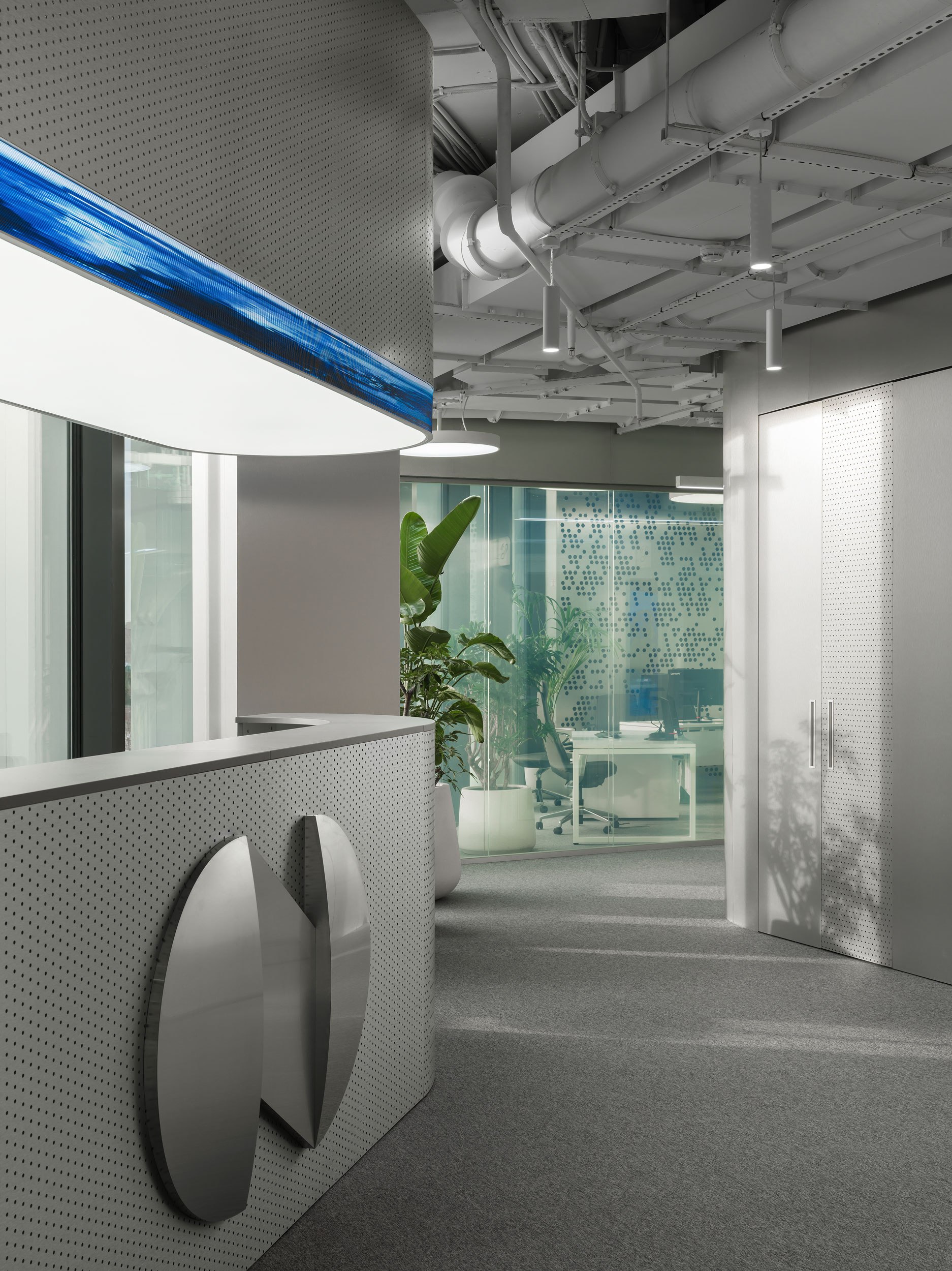 Дизайн-концепция Lab-Core воплощает лабораторную эстетику: прозрачность, техническую точность, прагматичность. Использованы нестандартные материалы: стеновые панели под нержавеющую сталь, деревянные панели с редкой перфорацией, наливной пол. Главный акцент – белый цвет, создающий ощущение стерильности и инновационности. Множественные отражения стекла дают ощущение прозрачности и легкости. Концепция опирается на принципы биофилии: зелень плотно окружает рабочие места. Активно используются предметы цифрового искусства (экраны с ИИ-помощниками, цифровые картины, инсталляции). Большая часть материалов – российского производства. Реализована биодинамическая система освещения, меняющая световую температуру в соответствии с циркадными ритмами. Звукопоглощающие баффлы, войлочные поверхности и акустические панели обеспечивают низкий коэффициент реверберации. Зональное регулирование климата позволяет настраивать микроклимат для разных рабочих групп.