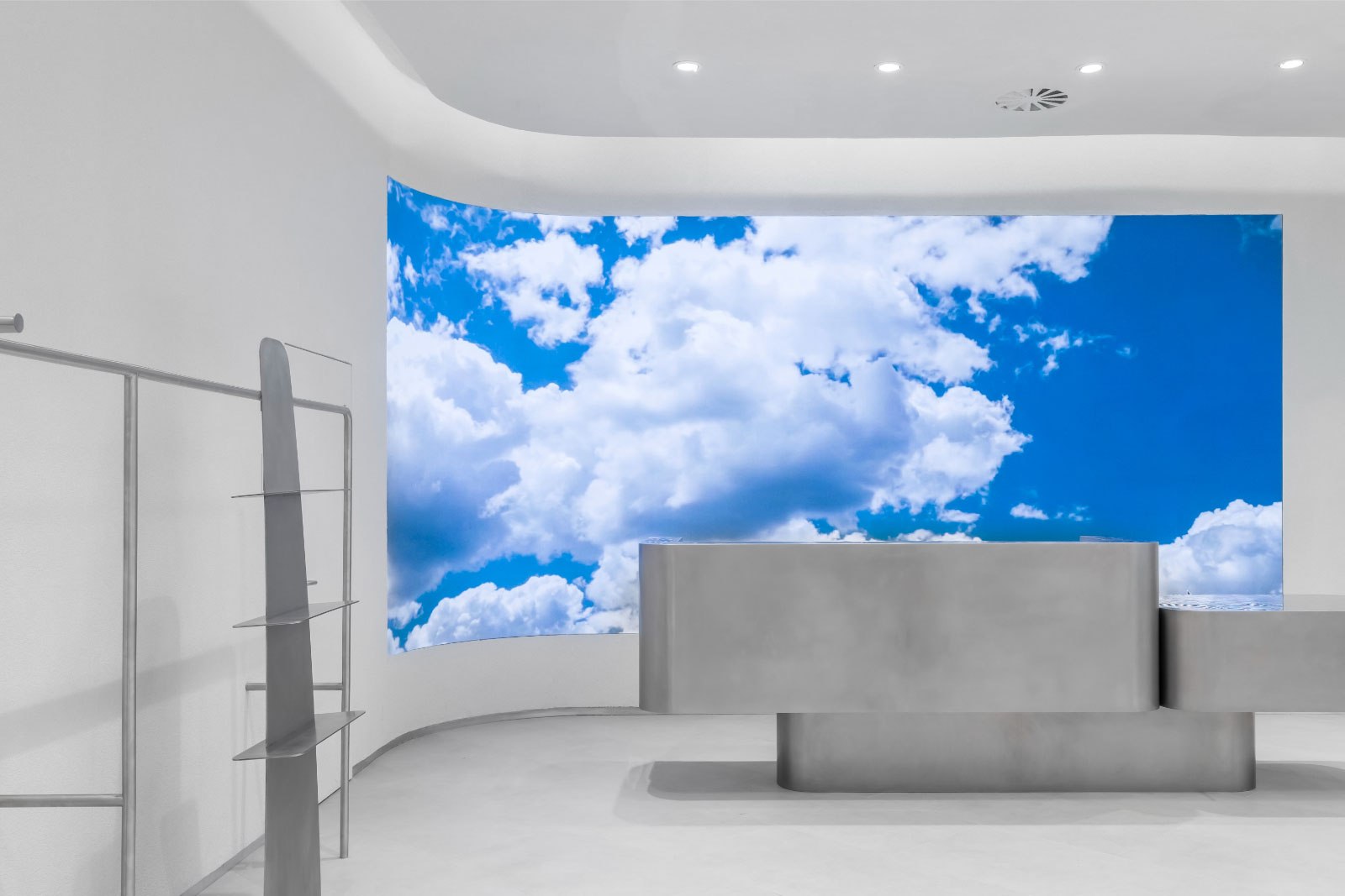 Гнутый экран за кассовой зоной используется не только в рекламных целях, но и служит главным арт-объектом: большую часть времени на нём транслируется движущееся небо с плывущими облаками.