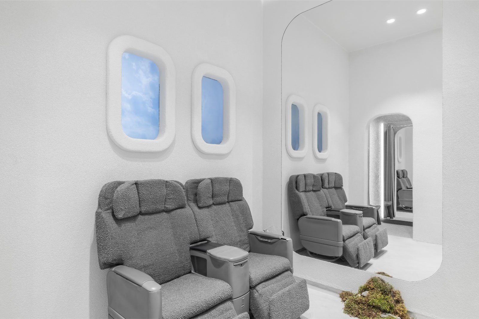 При этом в пространство введены и буквальные элементы, на контрасте усиливающие абстрактный нарратив. Например, подлинные авиационные кресла, перетянутые тканью букле, расположены в зонах отдыха и дополнены экранами в форме иллюминаторов, на которых движется небо. Все поверхности отделаны не декоративной штукатуркой, а прочным антивандальным промышленным покрытием, что подчеркивает инфраструктурный характер пространства.